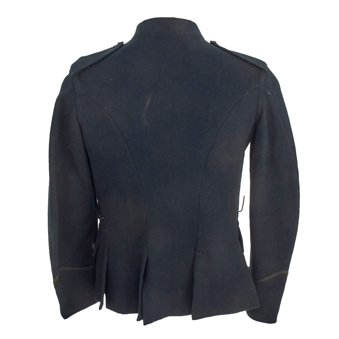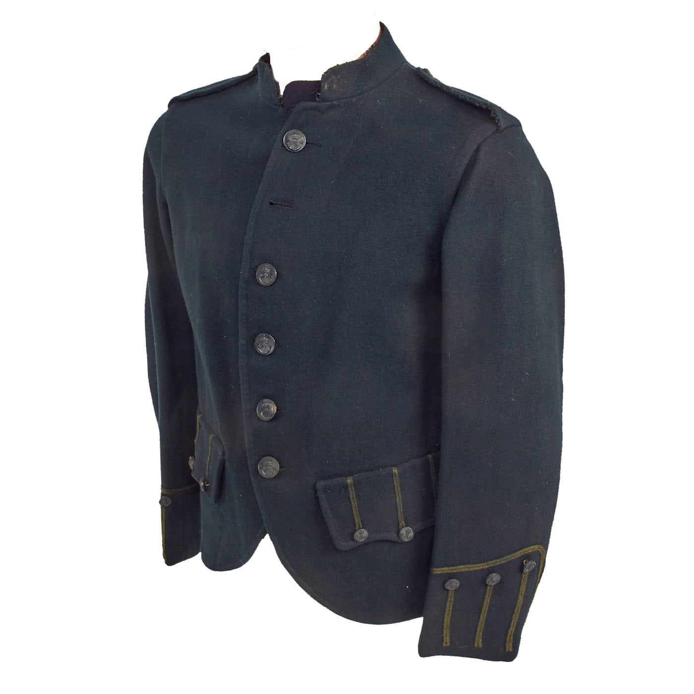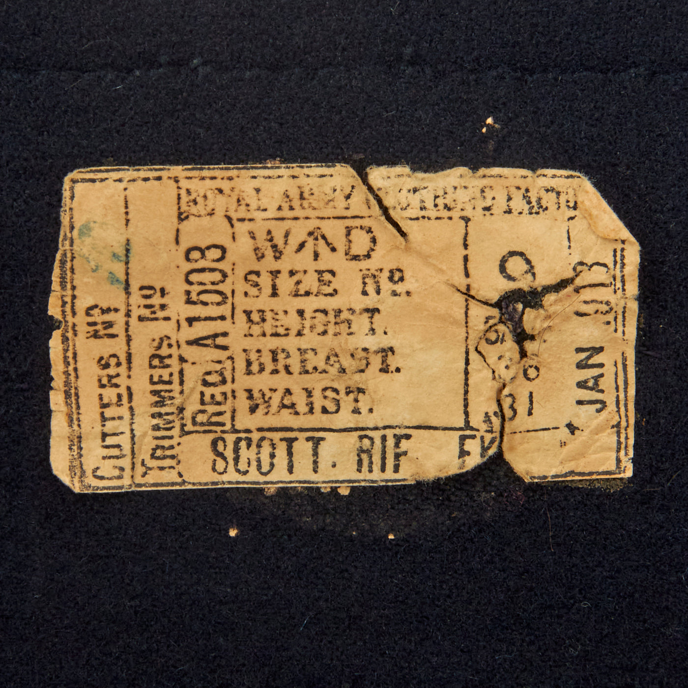 Original Items: Only One Set Available. This is, as stated from the King's Royal Rifle Corp as stated on the Maltese Cross Cap Badge together with the unit's Battle honors. The tunic, which is correctly known as a Scottish or Highland Doublet, is designed to be worn with a Kilt and still bears its original paper Label on the inside interior back stating that it was made by the ROYAL ARMY CLOTHING FACTORY, in JAN 1913. The label also gives the measurements of the doublet, and indicates that it is a Scottish style uniform for the King's Royal Rifles. The doublet bears the correct "Hunting Horn" buttons of the King's Royal Rifle Corps.