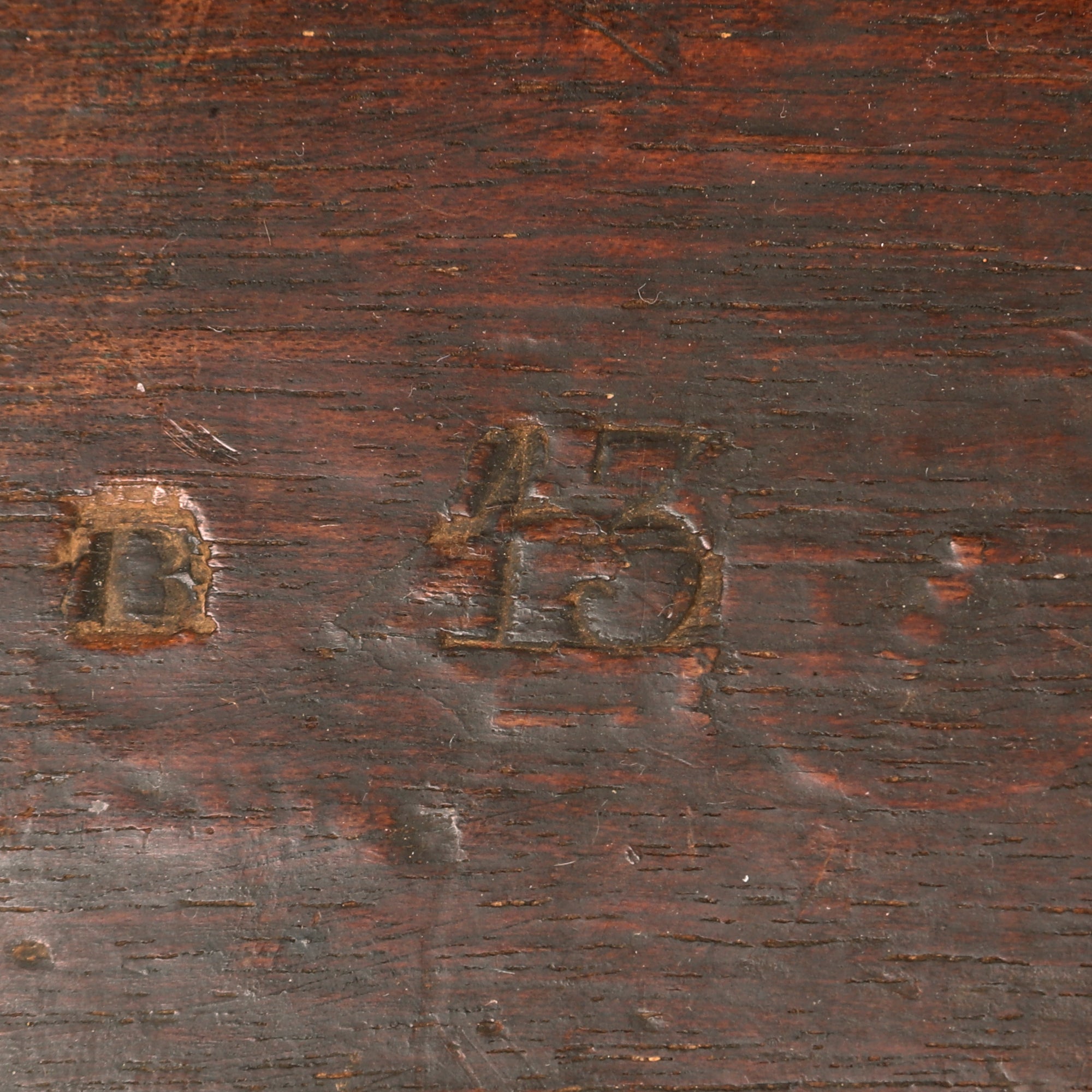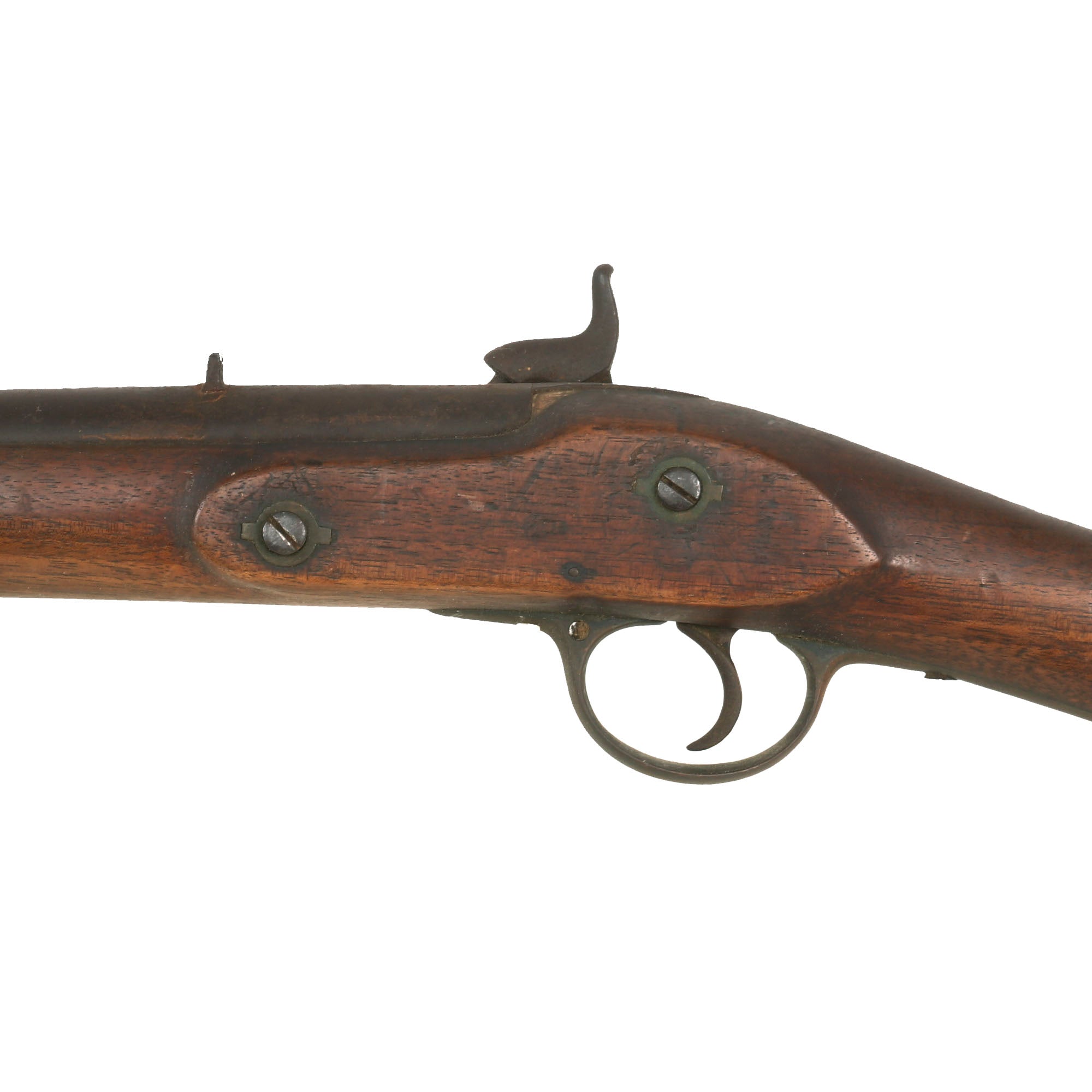 The musket has been cut down roughly 6 ½ inches, with a barrel length of 32 ½”, and the front sling swivel hole has been plugged. These were originally 39 inches. There is an outlet in the nose cap for a bayonet lug, but it has been cut down. One of the ram rod holders has been moved back further. The stock is marked very faintly J. RAWLES on the left behind the action. B 13 is stamped into the buttstock on the right side, with the initials J.C.M. carved into the other side. The correct rear sight is still intact.