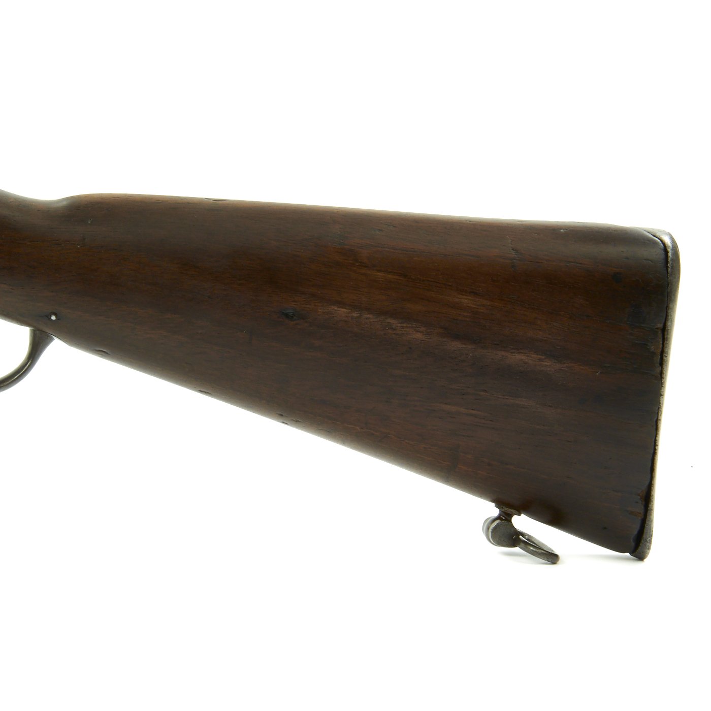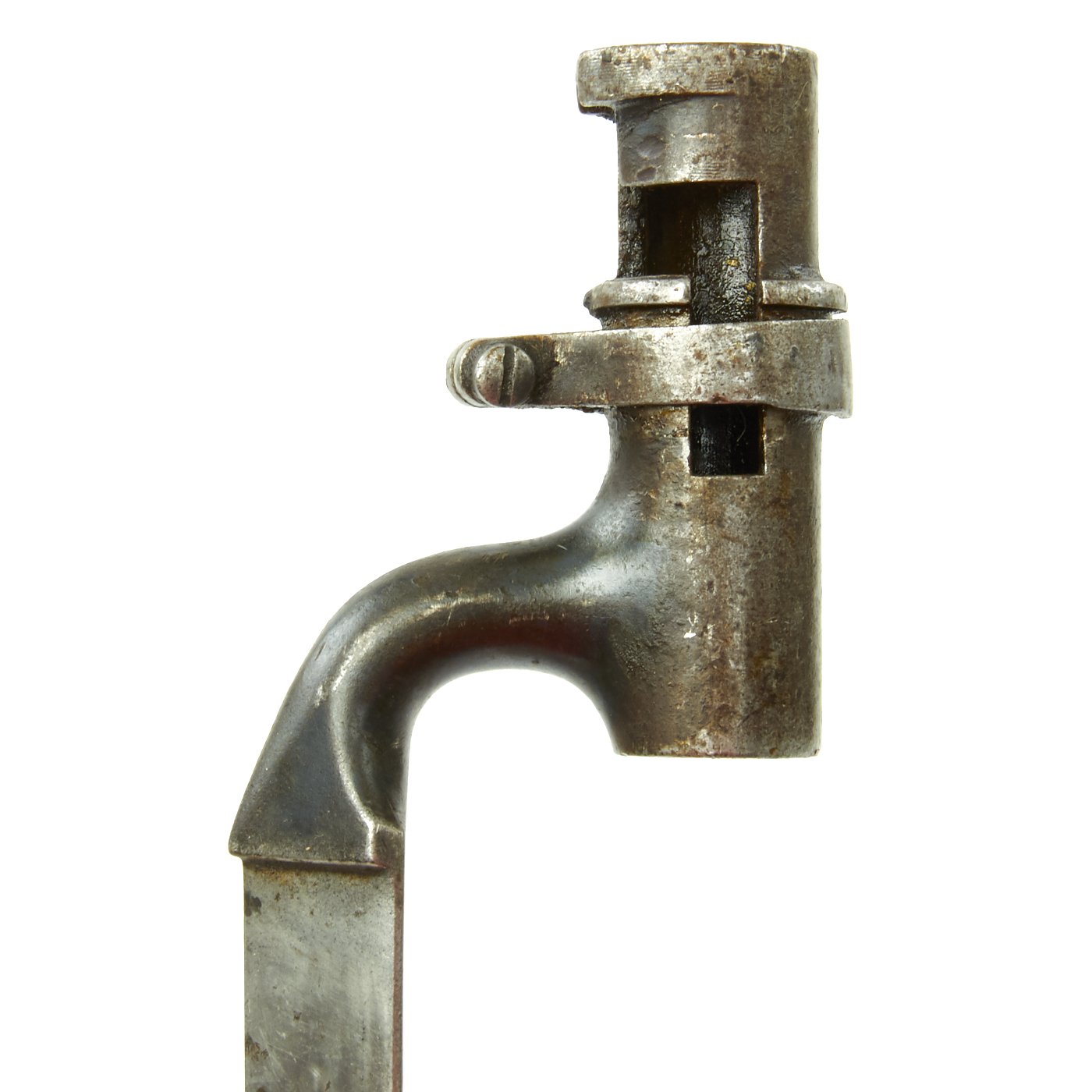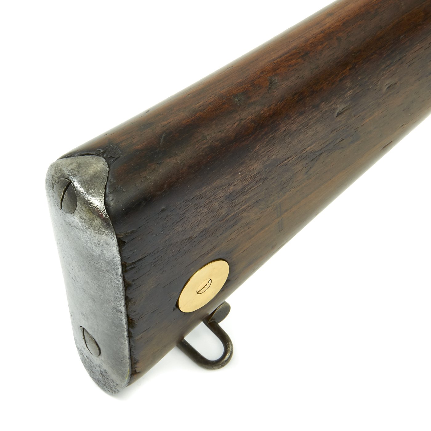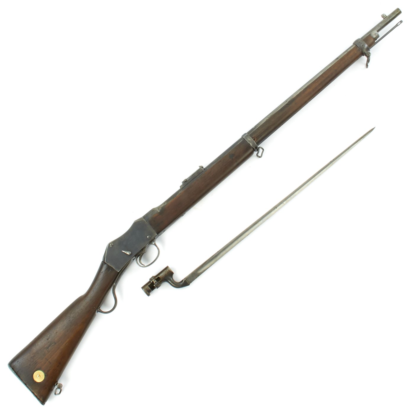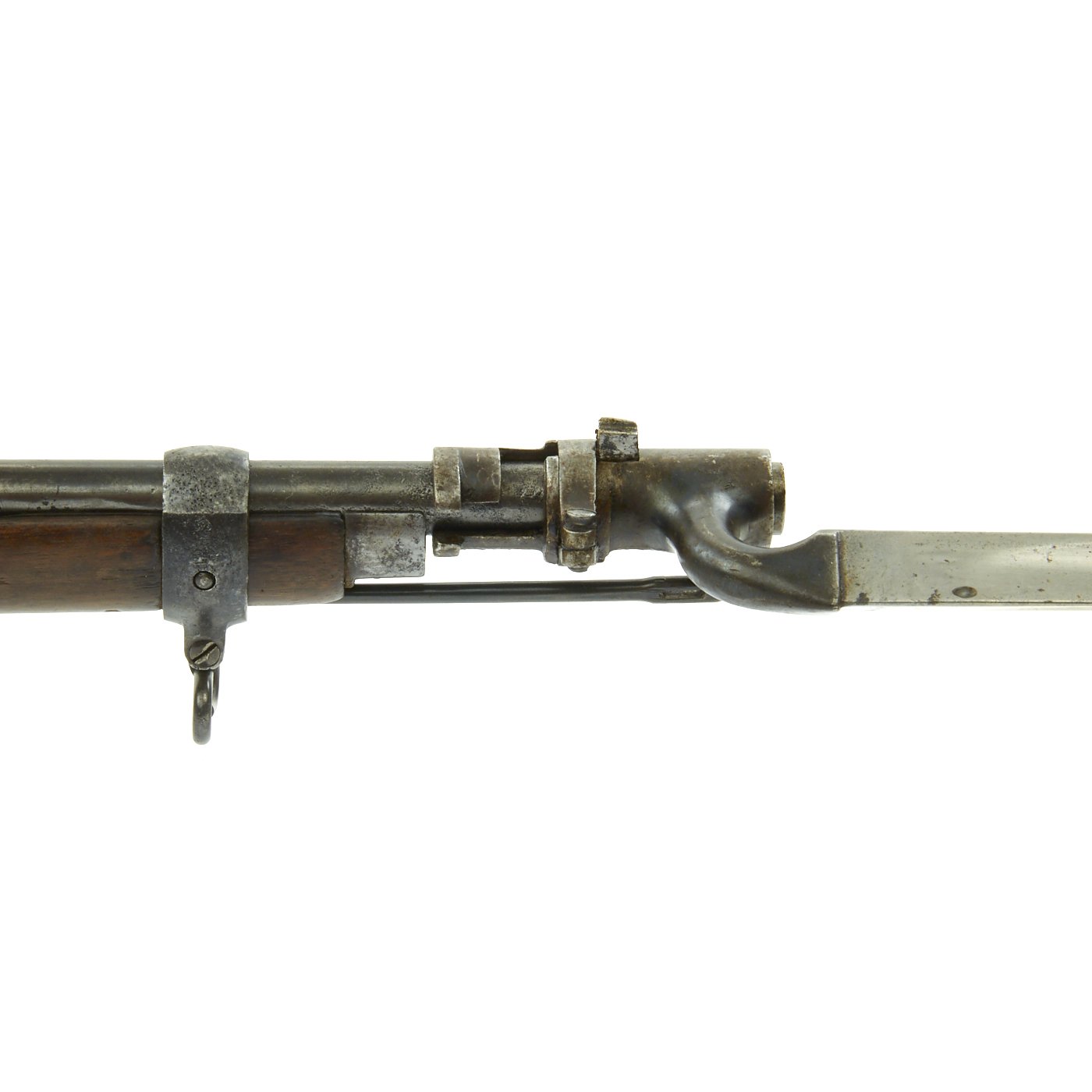 In very good condition the exterior of the barrel shows some deep scattered pits behind the rear sight but otherwise in a splendid display condition. Rifle comes complete with an original LONG Martini P-1876 Socket Bayonet officially converted to fit the new .303 caliber barrel. A very hard setup to find today with both sets of markings intact and a converted P-1876/P-1895 long Socket Bayonet.