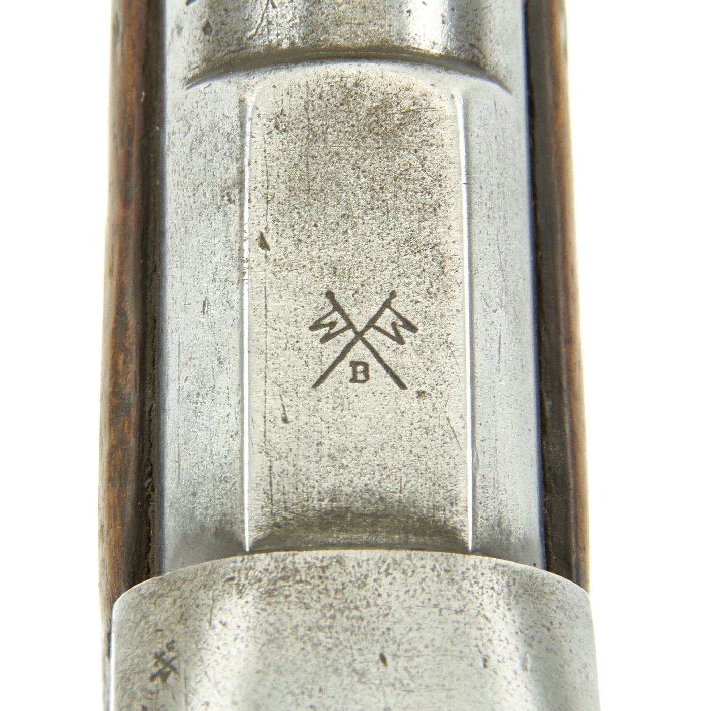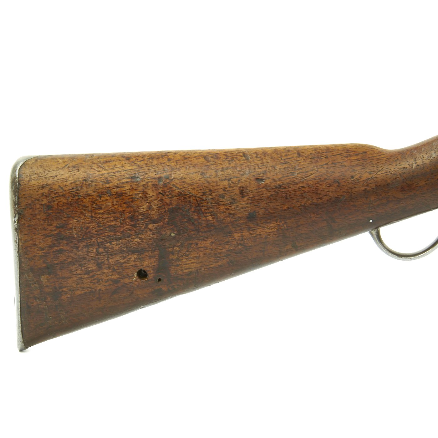 The bore in very good shape, with clear lands and grooves, and some oxidation in areas. No finish remains to the metalwork, but many proof marks are still apparent, as well as additional arsenal numbers. This is definitely a carbine wit a long service history. There are no sling swivels presently, but there is a hole drilled through the stock, and the trigger guard could accommodate a sling swivel. The original ramrod is included, but it looks to be a repaired replacement.