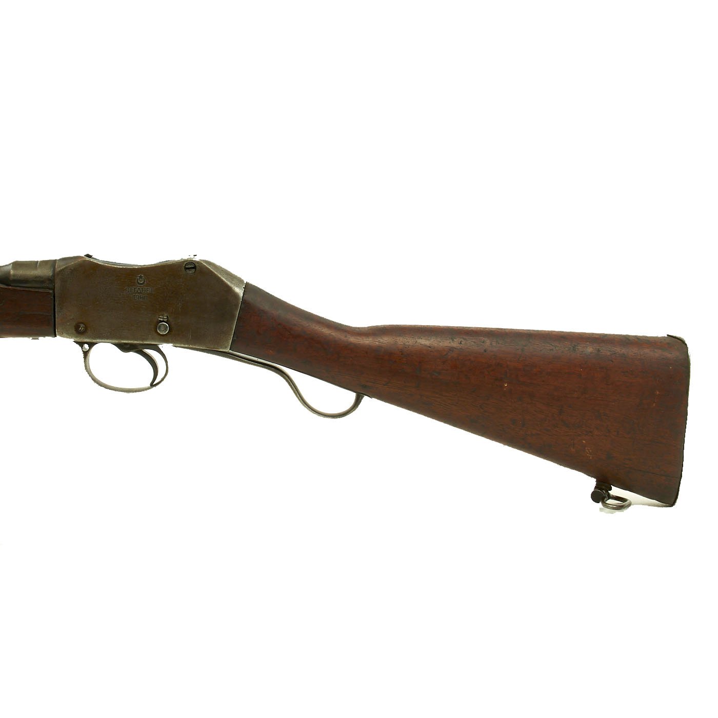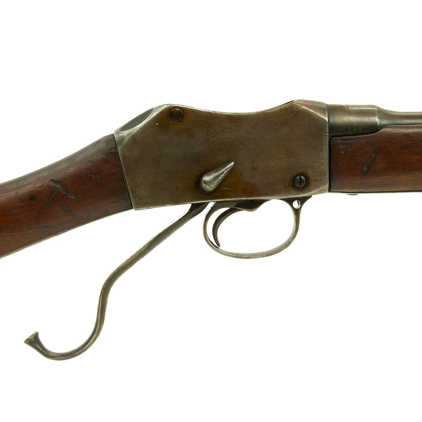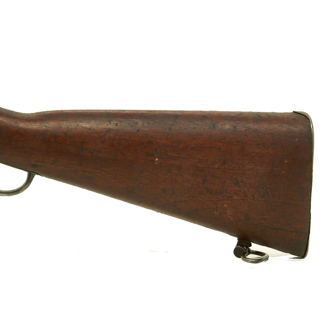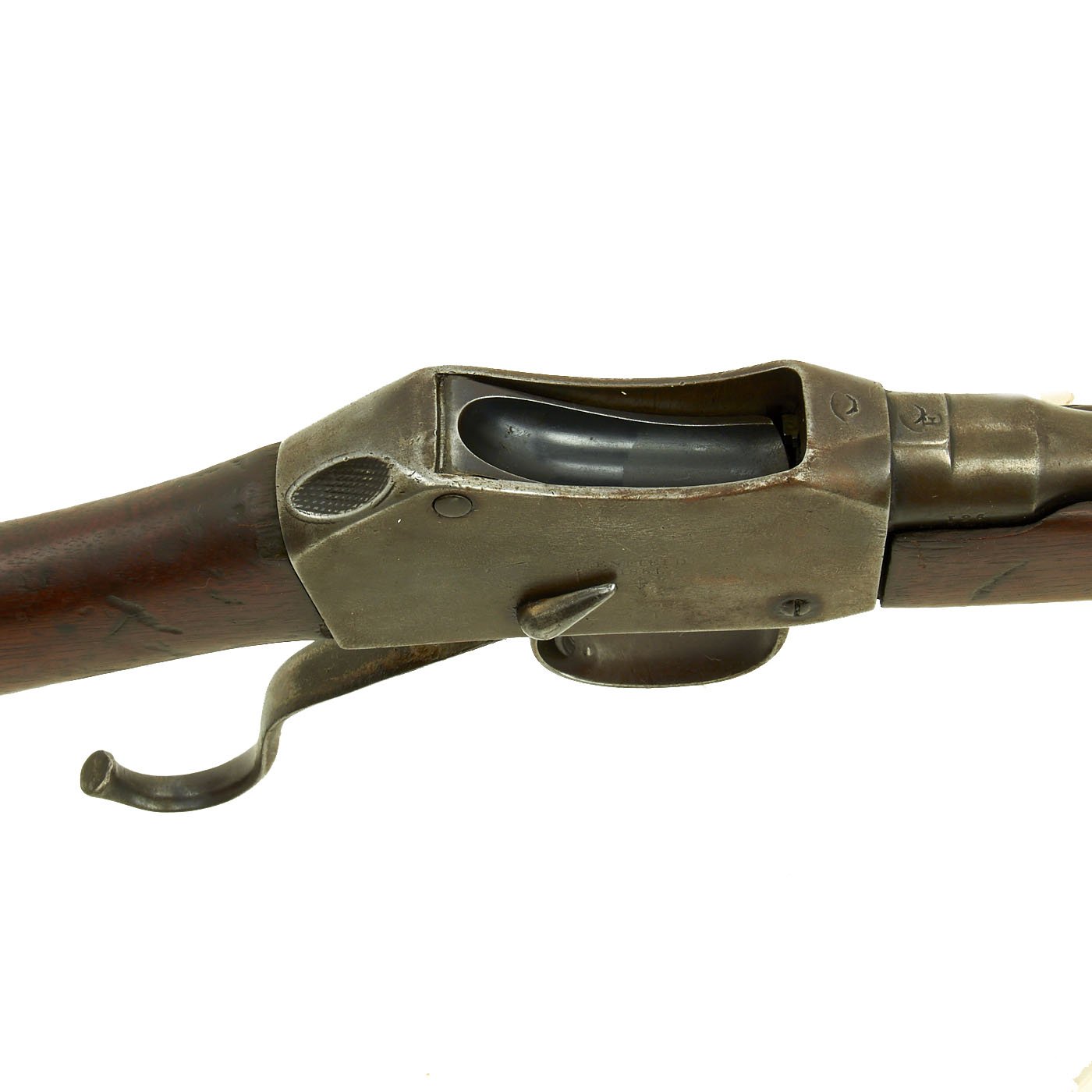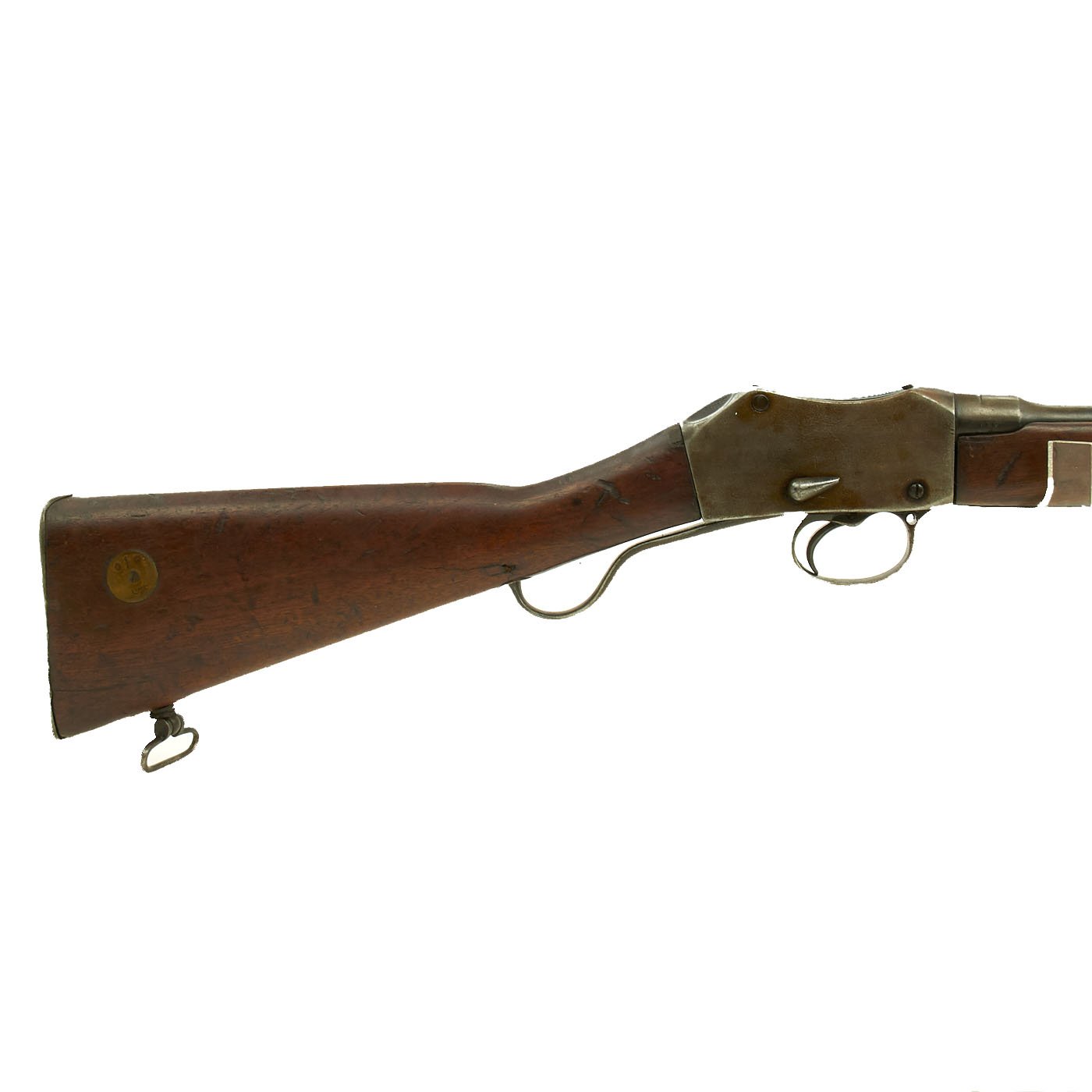 The Martini action, adopted by the British in 1871 was one of the strongest ever developed, and saw military service in England and the Empire, in one form or another for almost seventy years. Its most famous action being the defense of Rorke's Drift in Natal, South Africa in the 1879 Zulu War. The bore shows clear rifling with a bright finish, and just a bit of wear on the lands. The exterior is also in nice shape, with lovely wood, that shows the usual wear from age and service.
