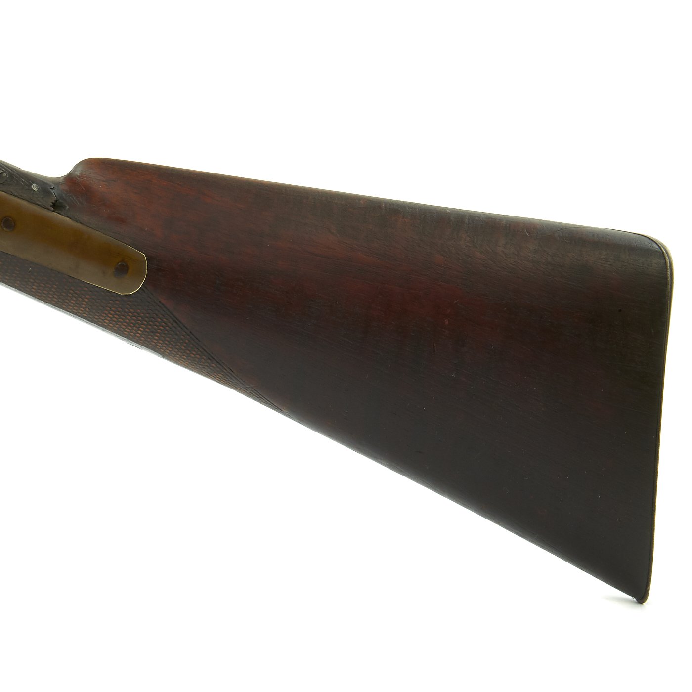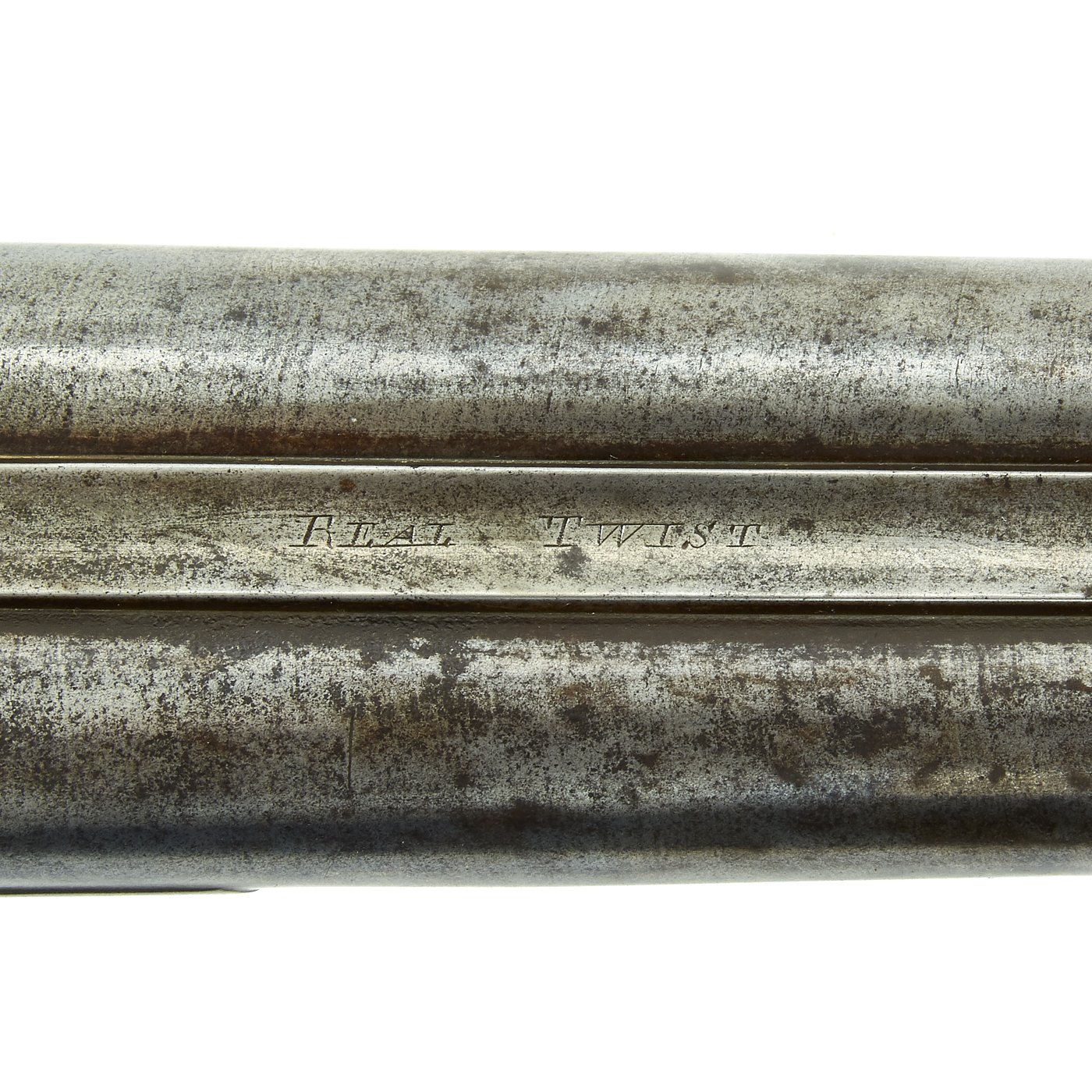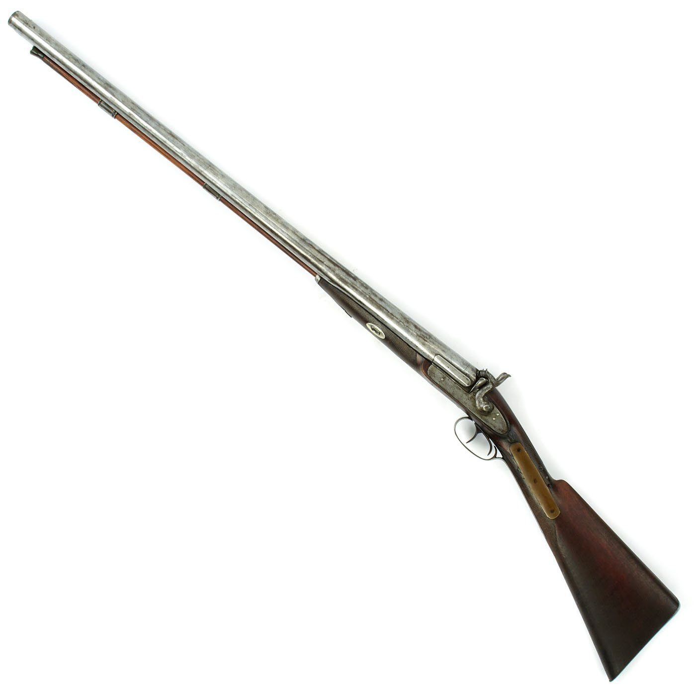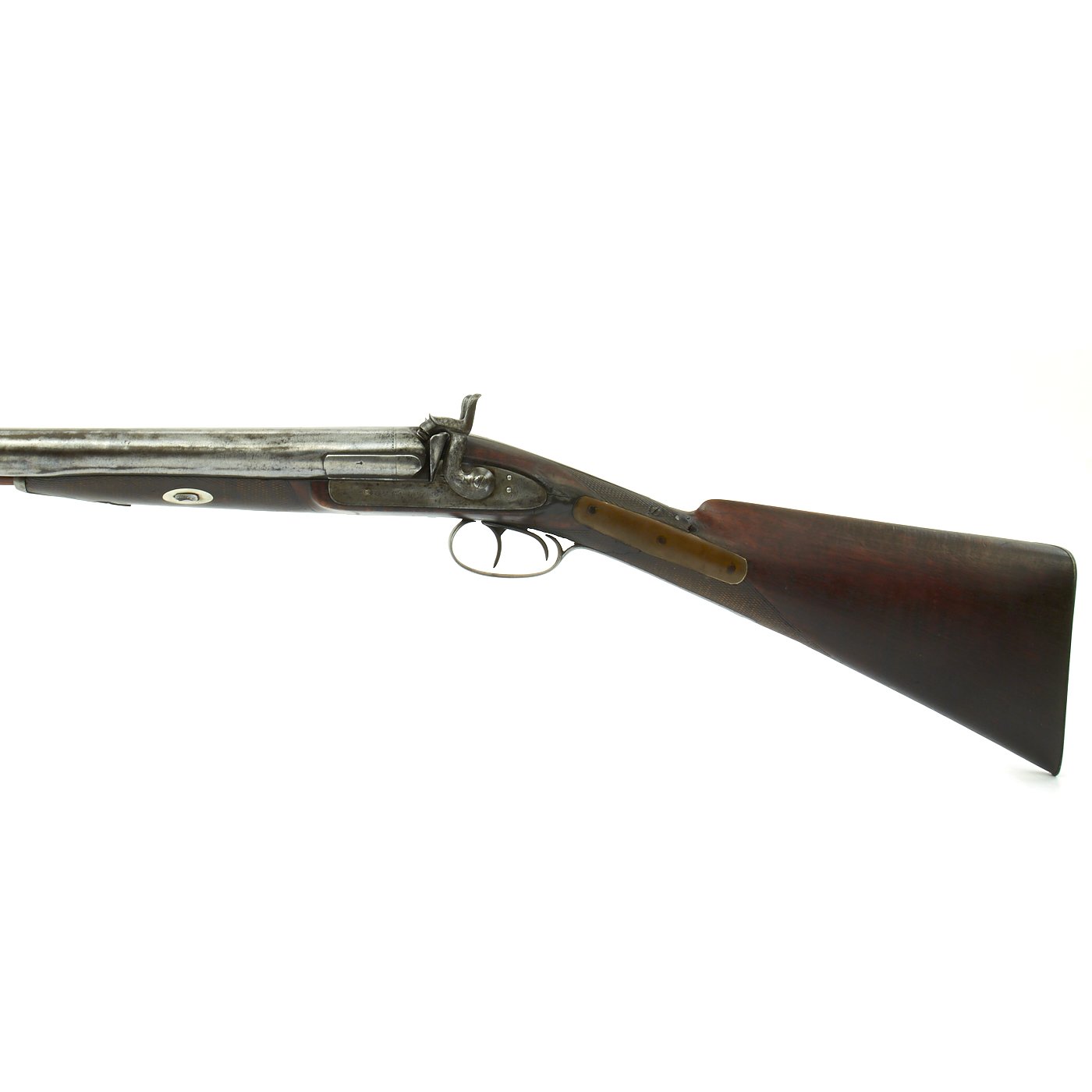 Original Item: Only One Available. We just received this lovely example along with about 200 other guns, from a collection that sat in an attic for close to 100 years. It is a MASSIVE double barrel British Percussion Shotgun, with 31 inch barrels in an unbelievable SIX BORE. We had thought them to be 8 bore, but they measure out to be about .92", which is definitely 6 bore/gauge. This shotgun would have kicked like several mules when fired, unleashing a massive wave of shot. The shotgun was at least partially made in Belgium, as the sides of both barrels bear a "Tower of Liège" proof mark. The gun is totally un-signed but stamped REAL TWIST on the strap between the two barrels on the top, and looking at the grain of the barrel, they definitely are twist steel.