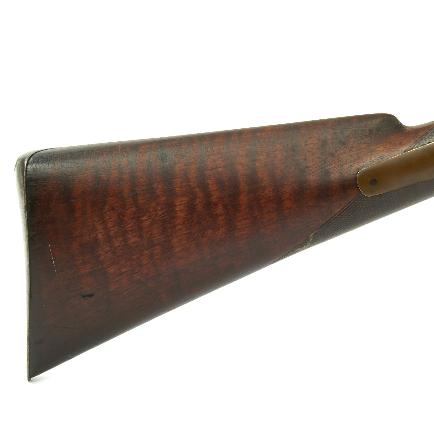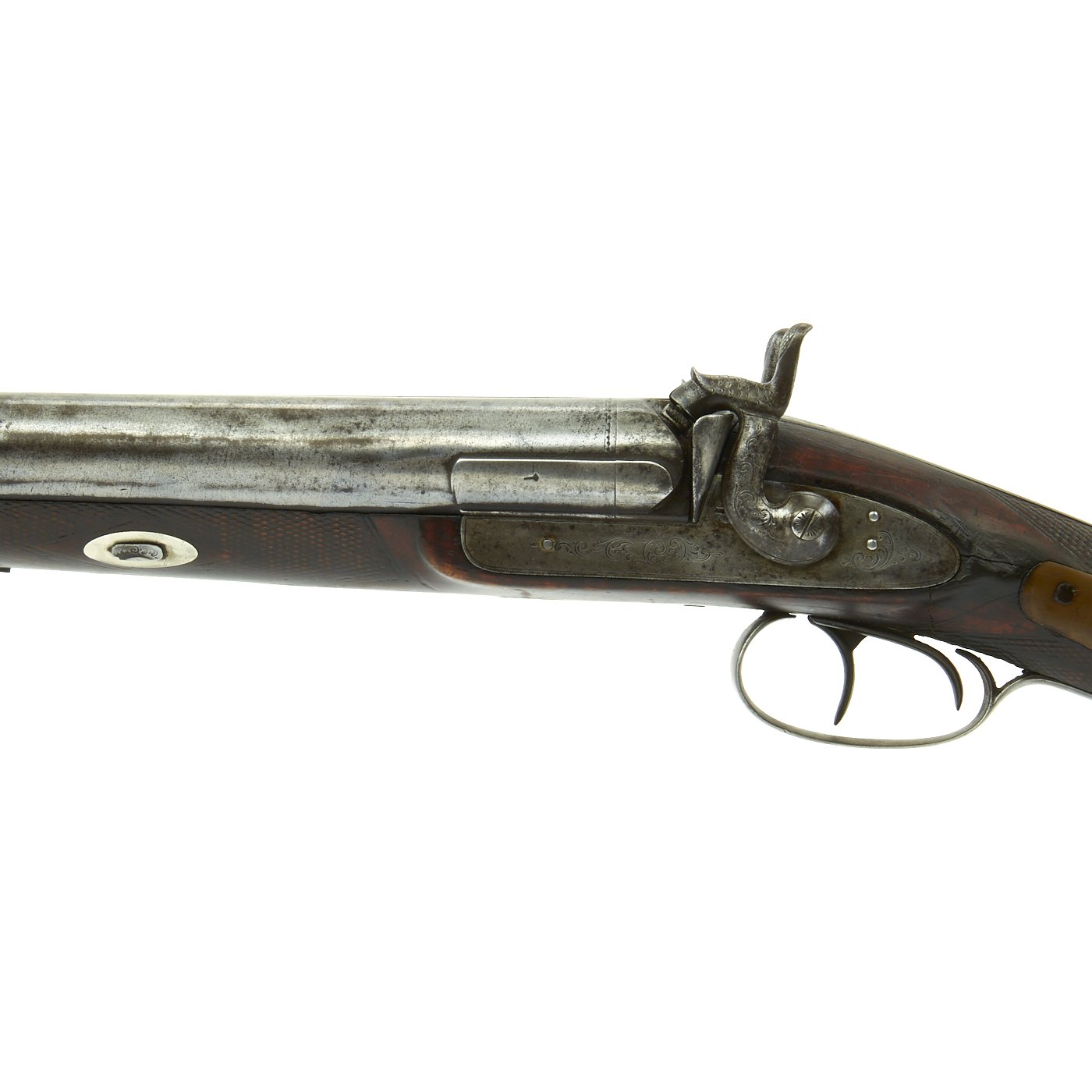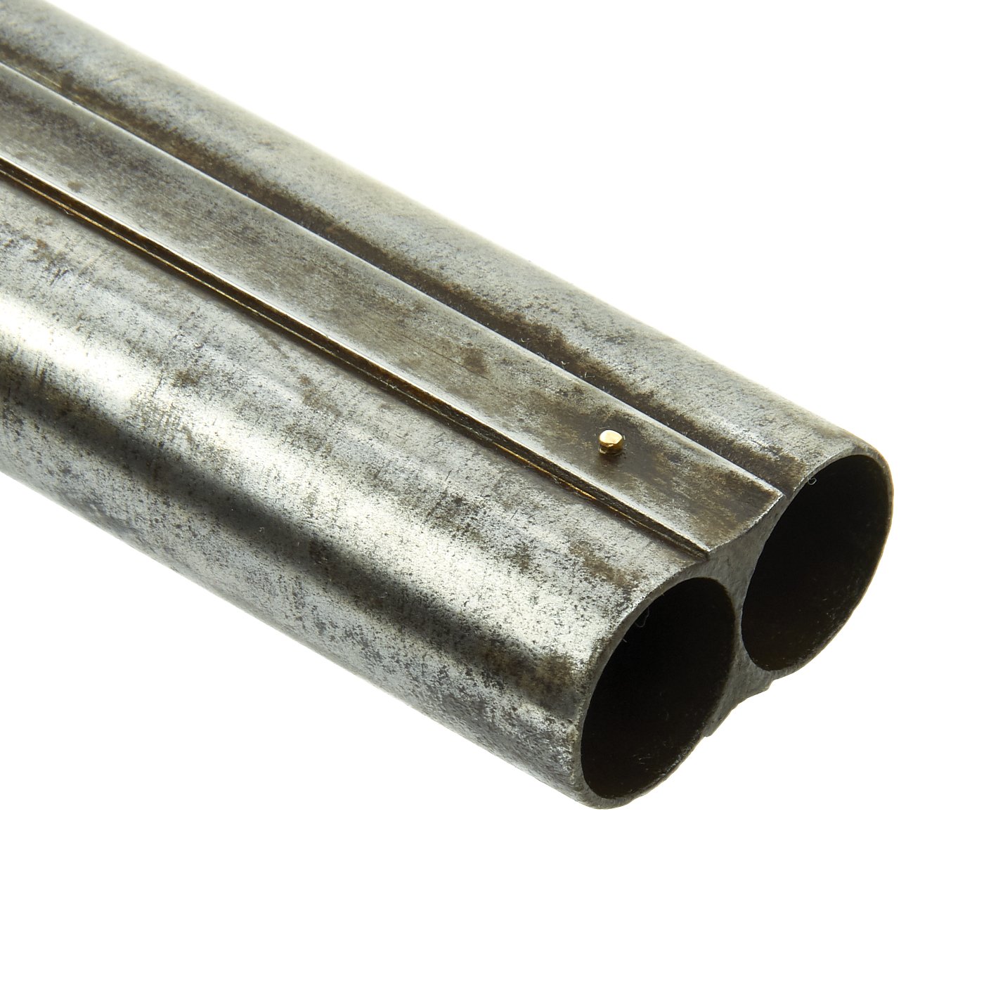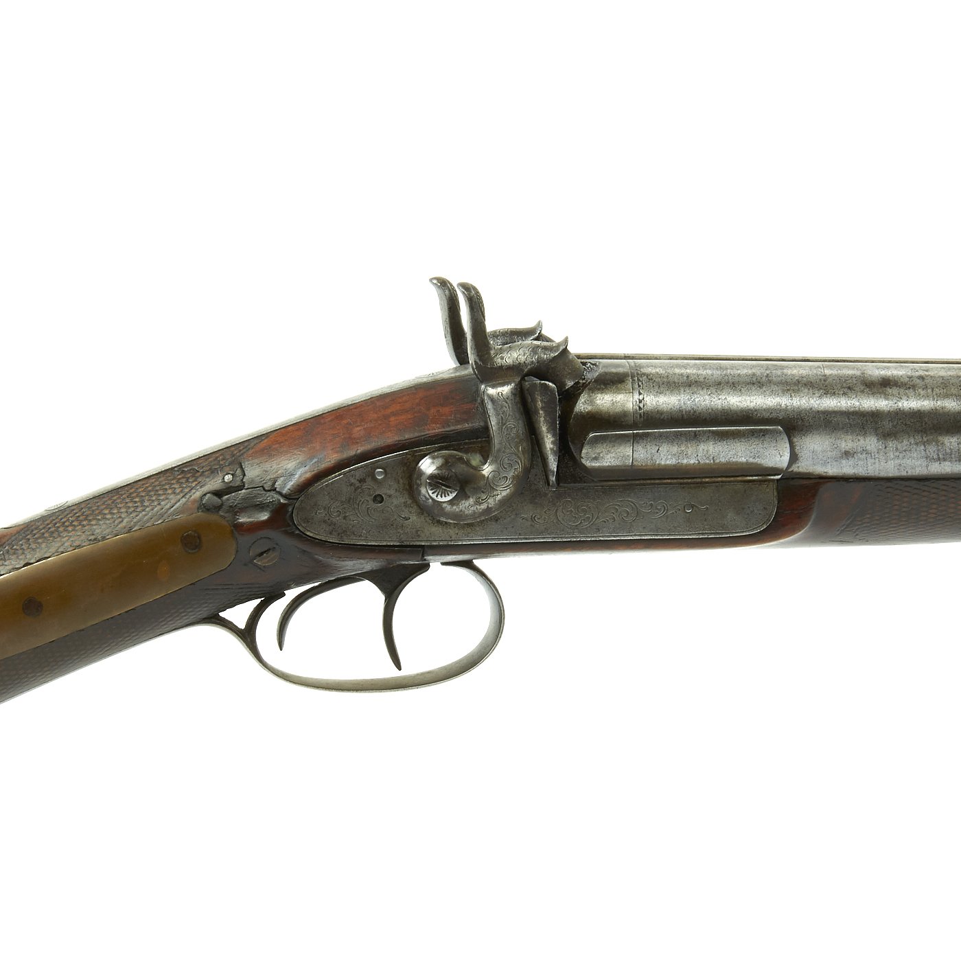 Original Item: Only One Available. We just received this lovely example along with about 200 other guns, from a collection that sat in an attic for close to 100 years. It is a MASSIVE double barrel British Percussion Shotgun, with 31 inch barrels in an unbelievable SIX BORE. We had thought them to be 8 bore, but they measure out to be about .92", which is definitely 6 bore/gauge. This shotgun would have kicked like several mules when fired, unleashing a massive wave of shot. The shotgun was at least partially made in Belgium, as the sides of both barrels bear a "Tower of Liège" proof mark. The gun is totally un-signed but stamped REAL TWIST on the strap between the two barrels on the top, and looking at the grain of the barrel, they definitely are twist steel.