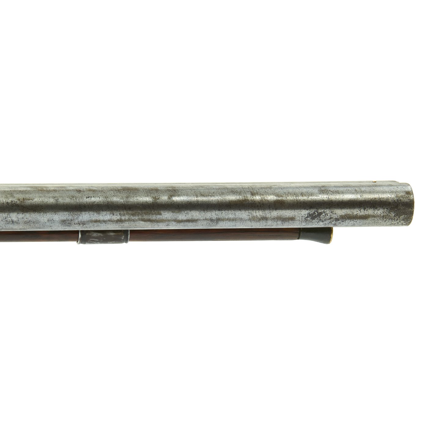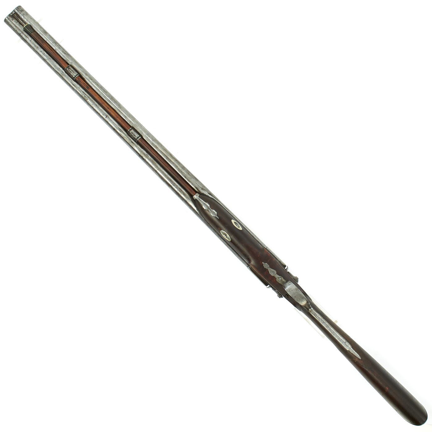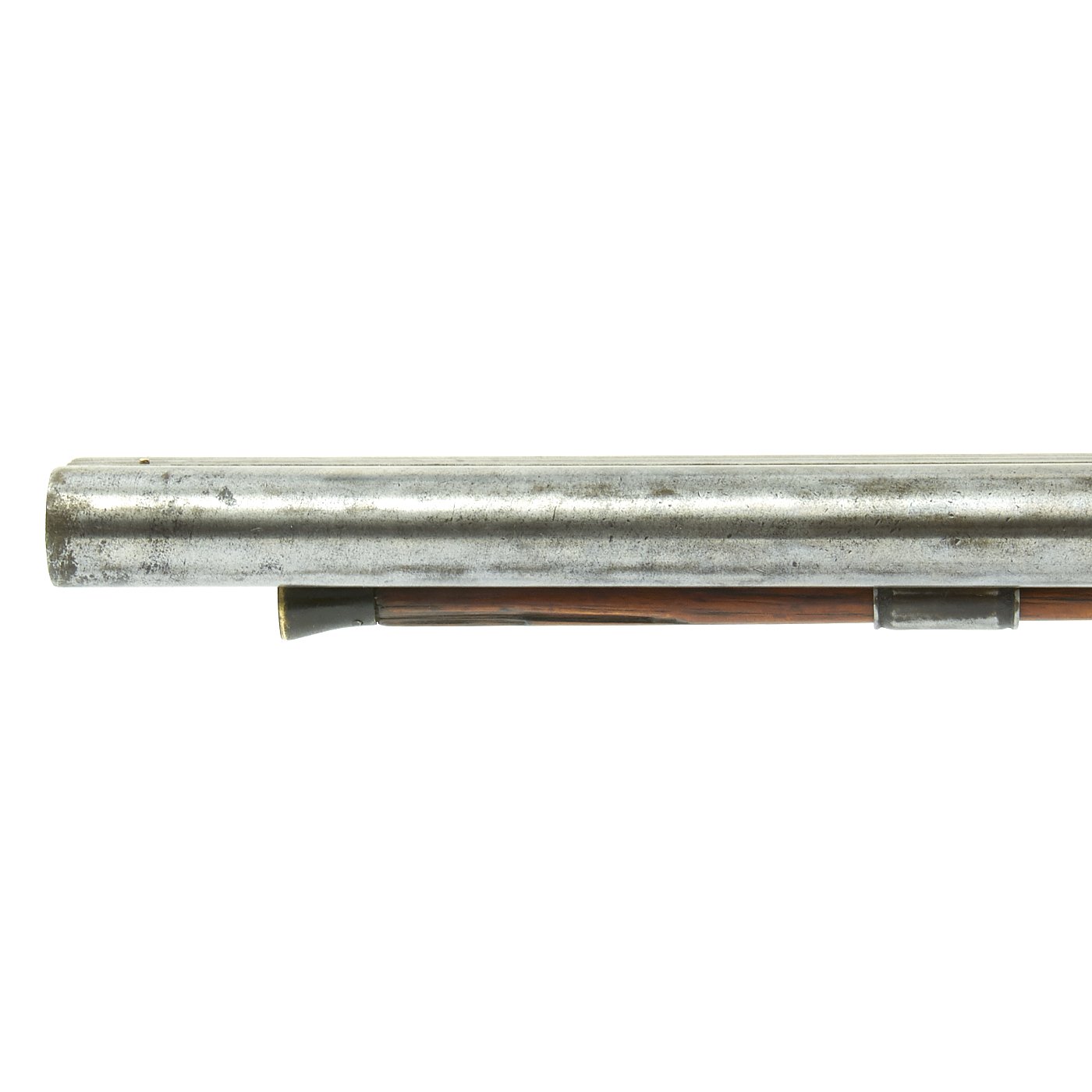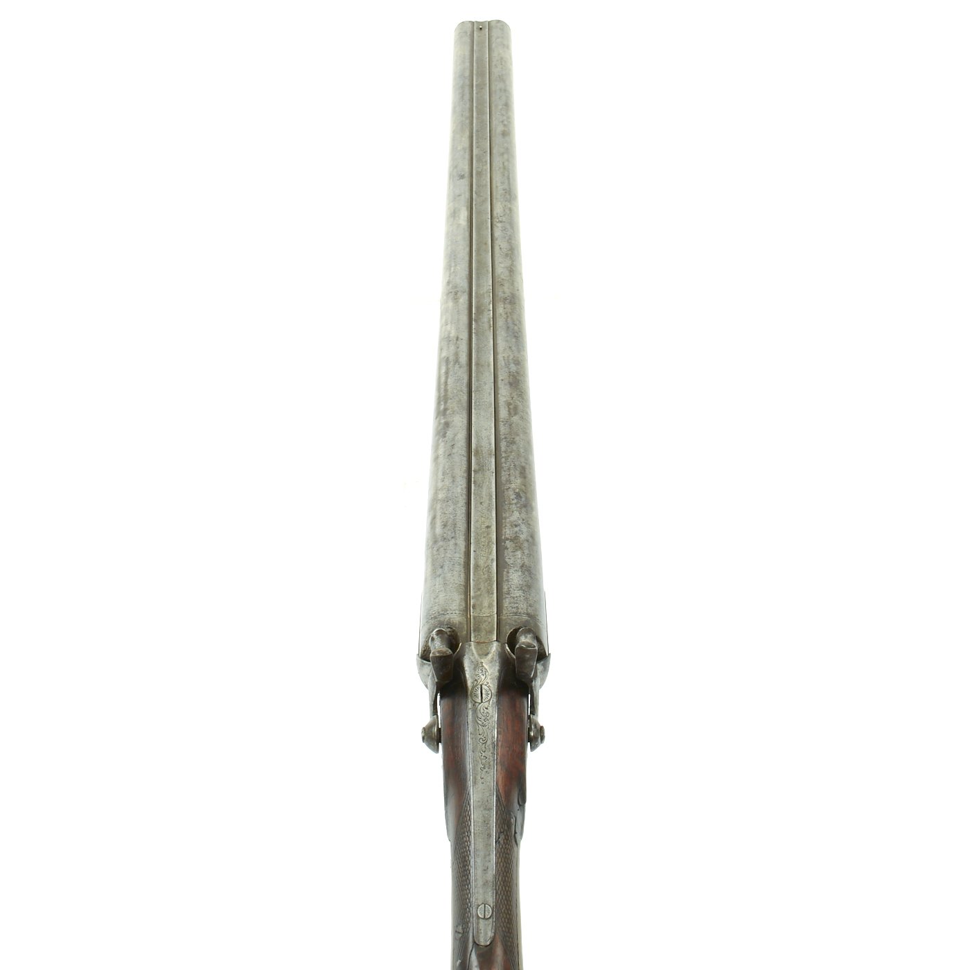 Original Item: Only One Available. We just received this lovely example along with about 200 other guns, from a collection that sat in an attic for close to 100 years. It is a MASSIVE double barrel British Percussion Shotgun, with 31 inch barrels in an unbelievable SIX BORE. We had thought them to be 8 bore, but they measure out to be about .92", which is definitely 6 bore/gauge. This shotgun would have kicked like several mules when fired, unleashing a massive wave of shot. The shotgun was at least partially made in Belgium, as the sides of both barrels bear a "Tower of Liège" proof mark. The gun is totally un-signed but stamped REAL TWIST on the strap between the two barrels on the top, and looking at the grain of the barrel, they definitely are twist steel.