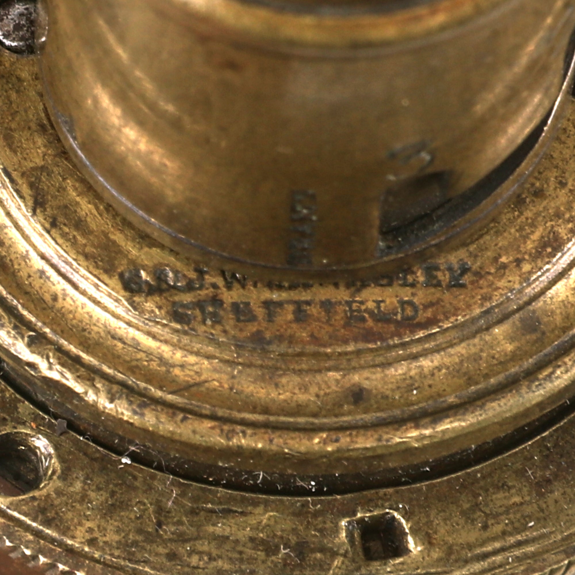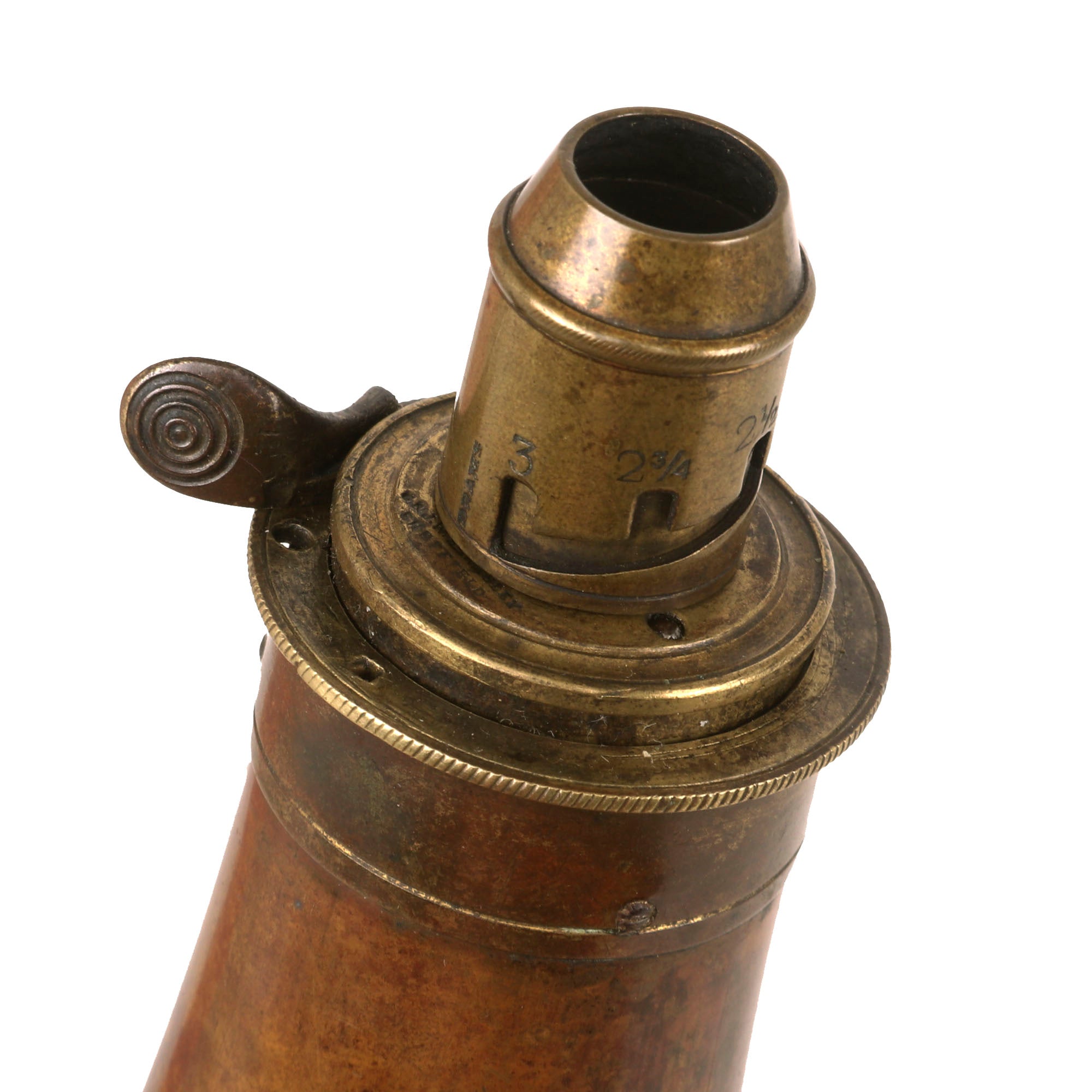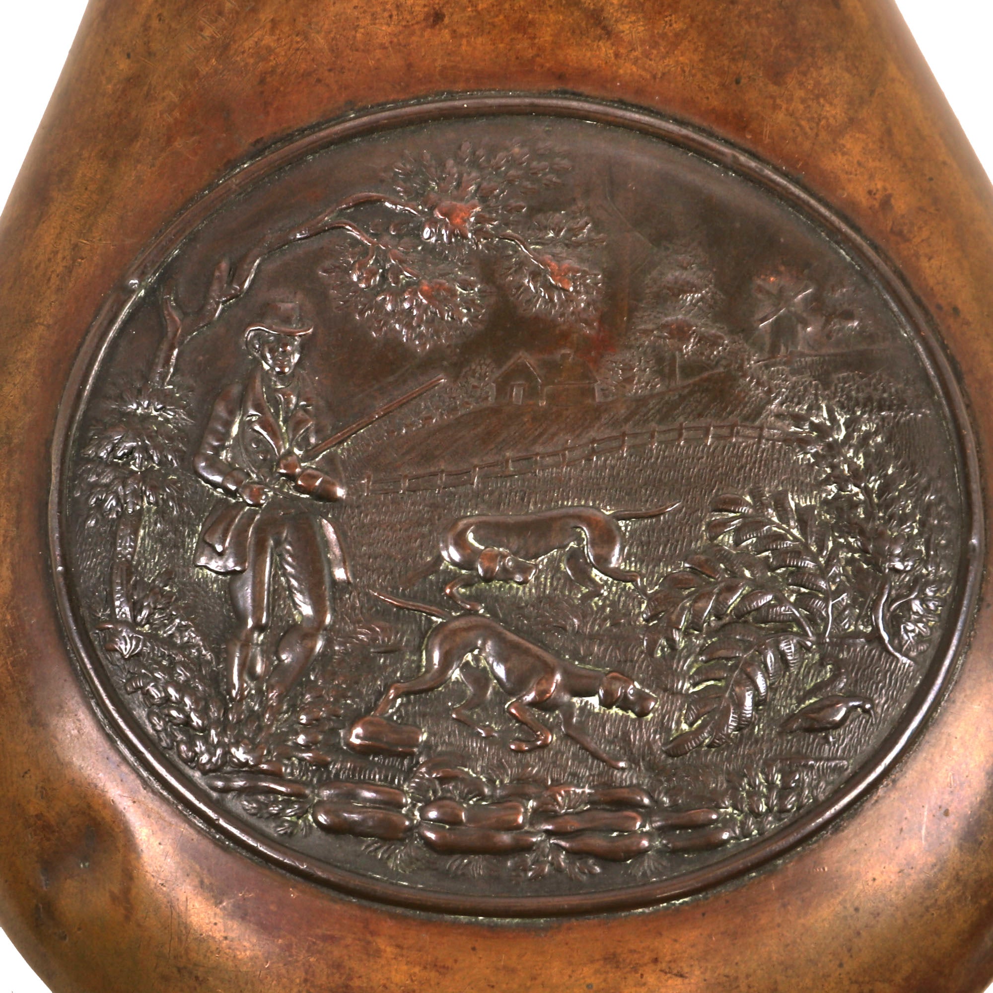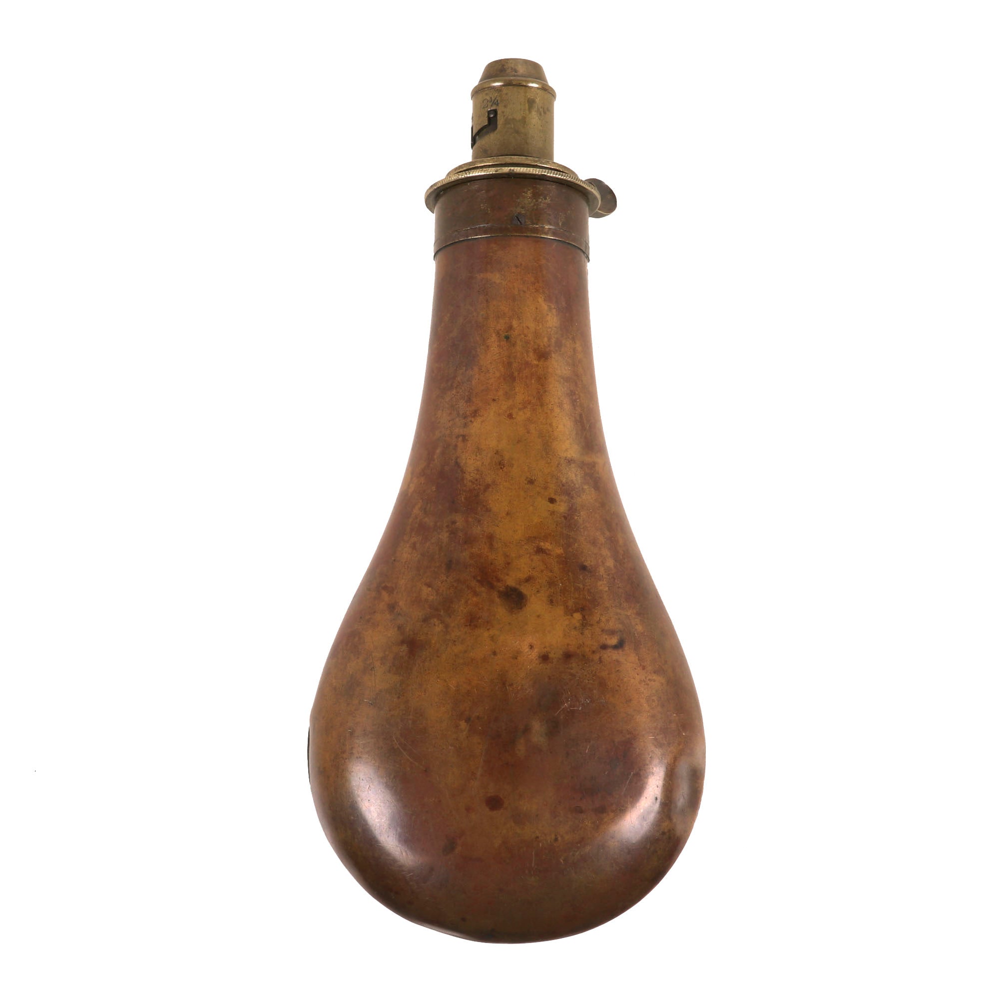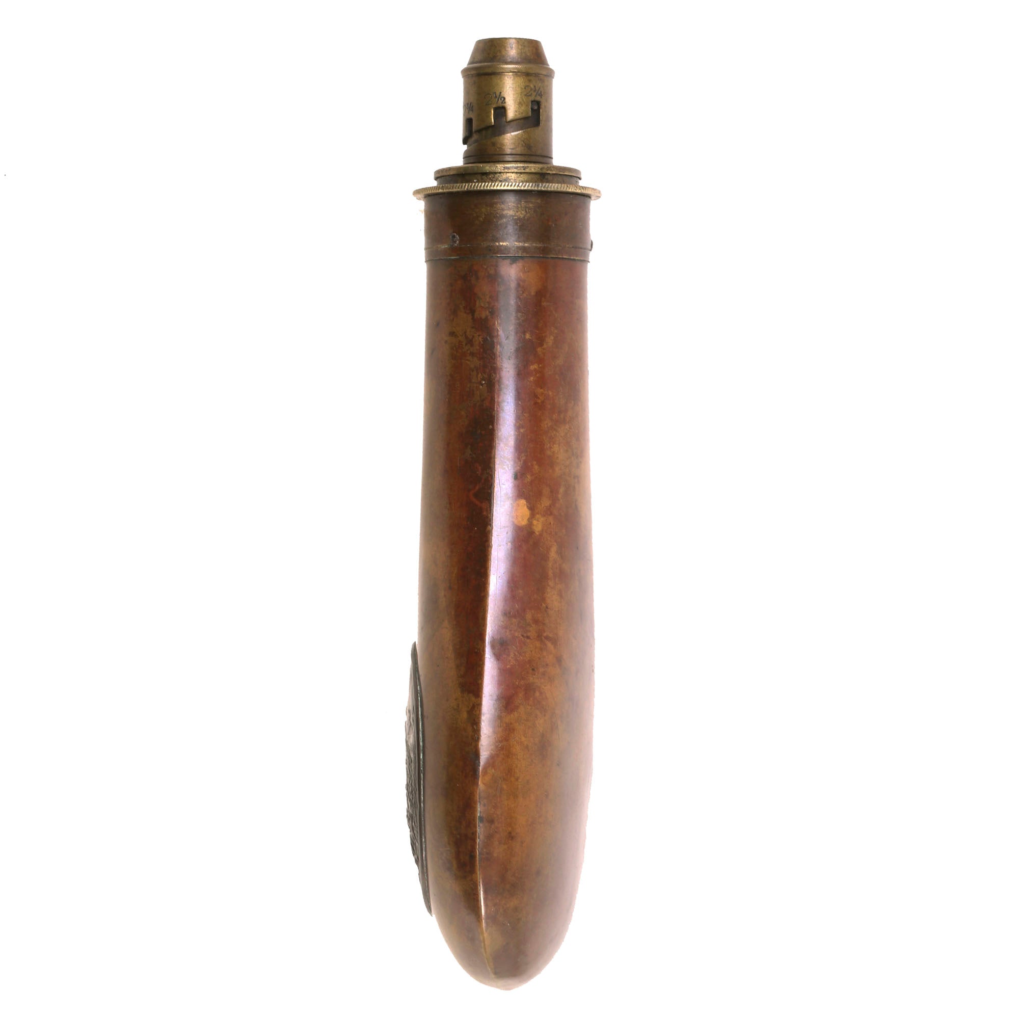 Original Item. Only One Available. This is a stellar paneled brass powder flask manufactured by G. & J.W. Hawksley-Sheffield. George and John Williams, brothers are recorded as opening the company of G & JW Hawksley on the early 9th century, 1840. They did not make arms, but accouterments. Beyond this they specialized in gun powder flasks and silver flasks.The flask is marked on the cap G. & J.W. HAWKSLEY SHEFFIELD. The cap screws on and off perfectly with no issue. The lever is unfortunately off of its spring and loose. There is no powder remaining in the flask. This example dates to the Civil War period, but was likely meant as a hunting flask given the depiction. A very beautiful flask that will fit well into any Civil War or 19th Century firearm collection! The flask measures roughly 7¾” in length.