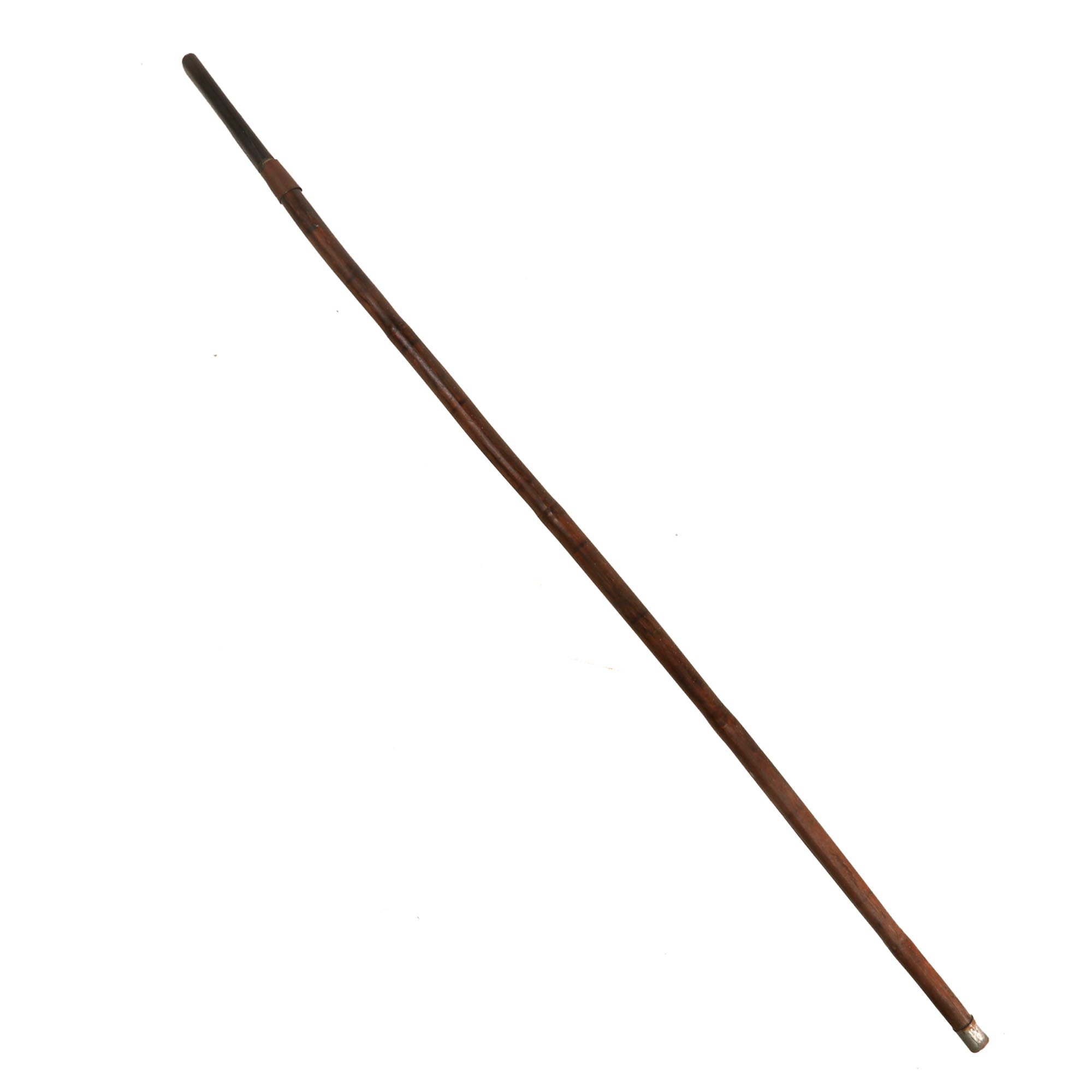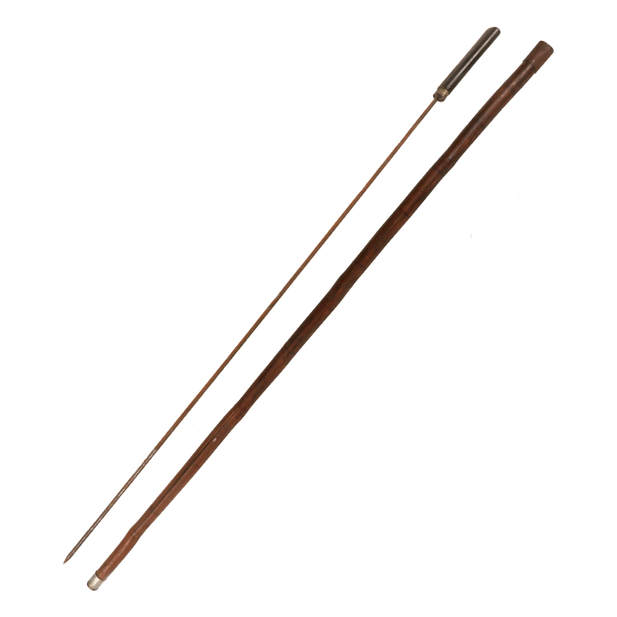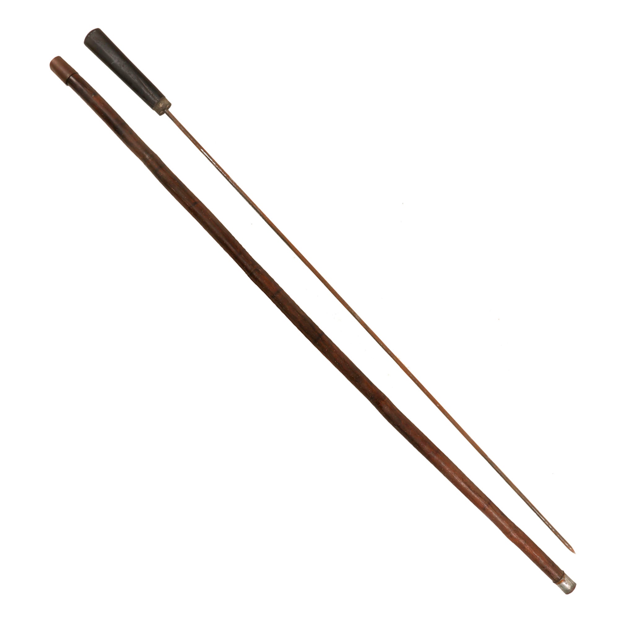 This example is rather crude and measures 36¼” in overall length, with a 27⅝” “spike” blade. It is not necessarily a blade, as its length is cylindrical, with the spike at the tip being where the damage comes from. The horn handle is cracking heavily, and the spike is heavily oxidized across. The wood of the cane is also cracking heavily, and is very weak as a result.