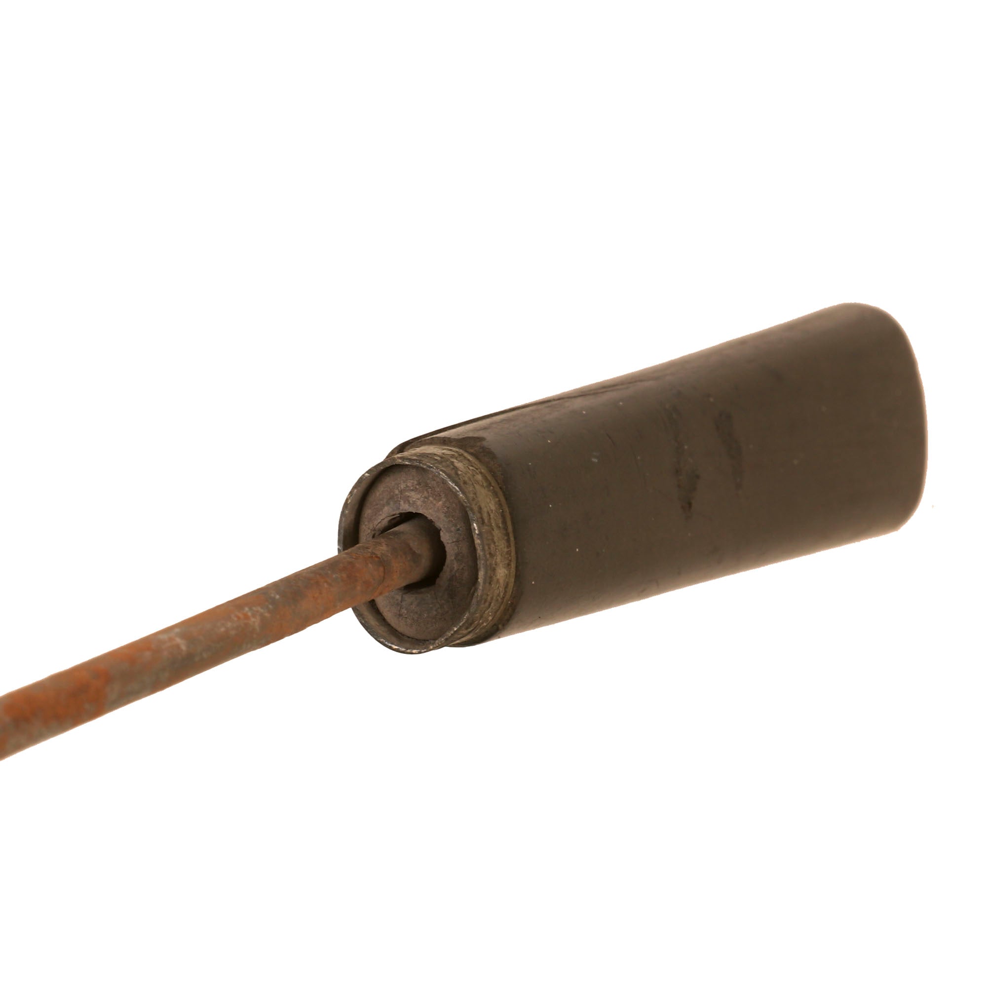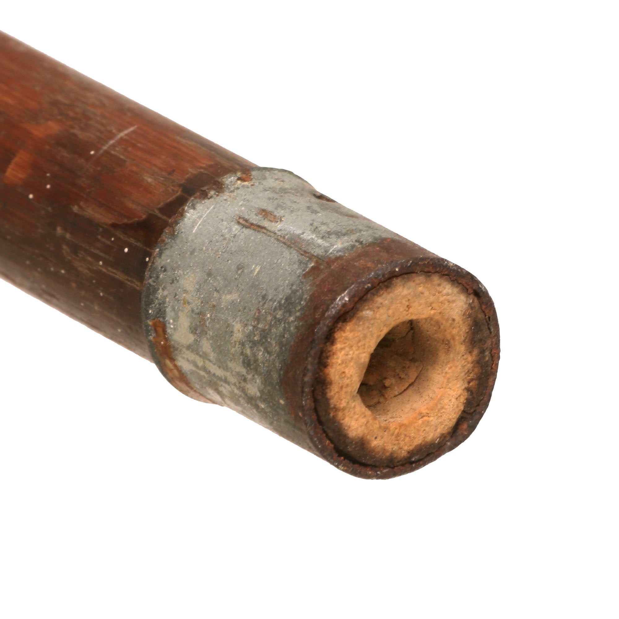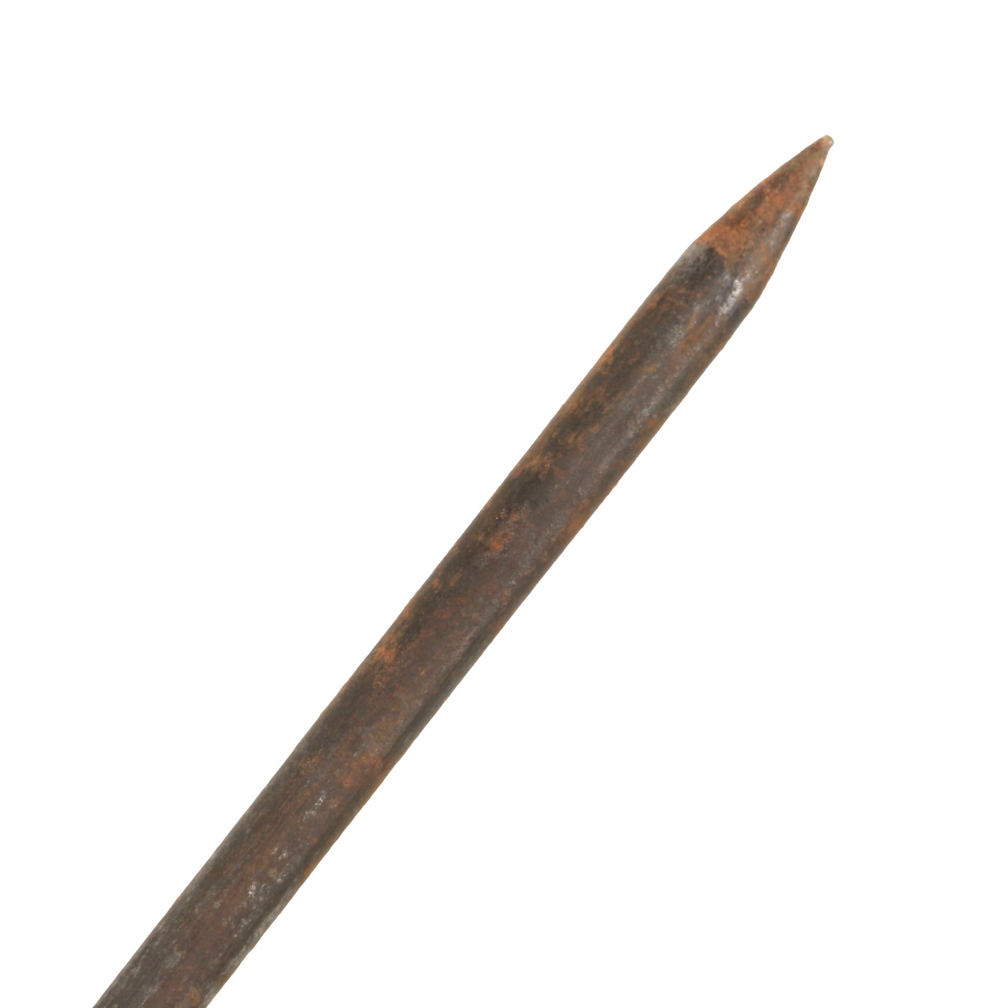 This example is rather crude and measures 36¼” in overall length, with a 27⅝” “spike” blade. It is not necessarily a blade, as its length is cylindrical, with the spike at the tip being where the damage comes from. The horn handle is cracking heavily, and the spike is heavily oxidized across. The wood of the cane is also cracking heavily, and is very weak as a result.