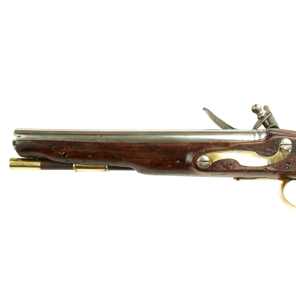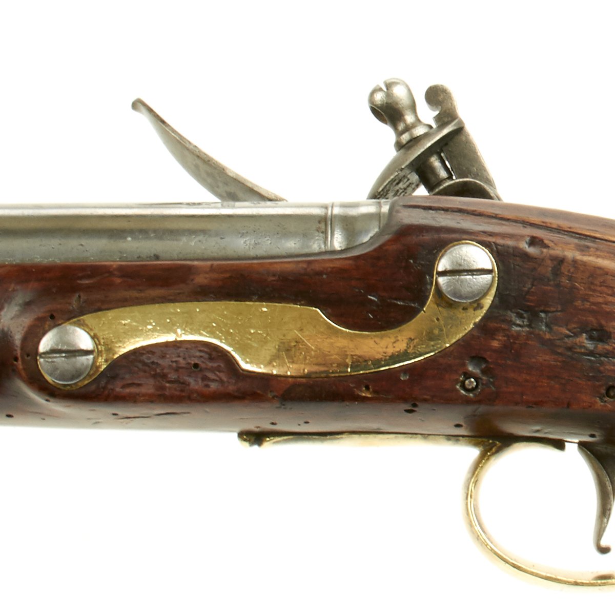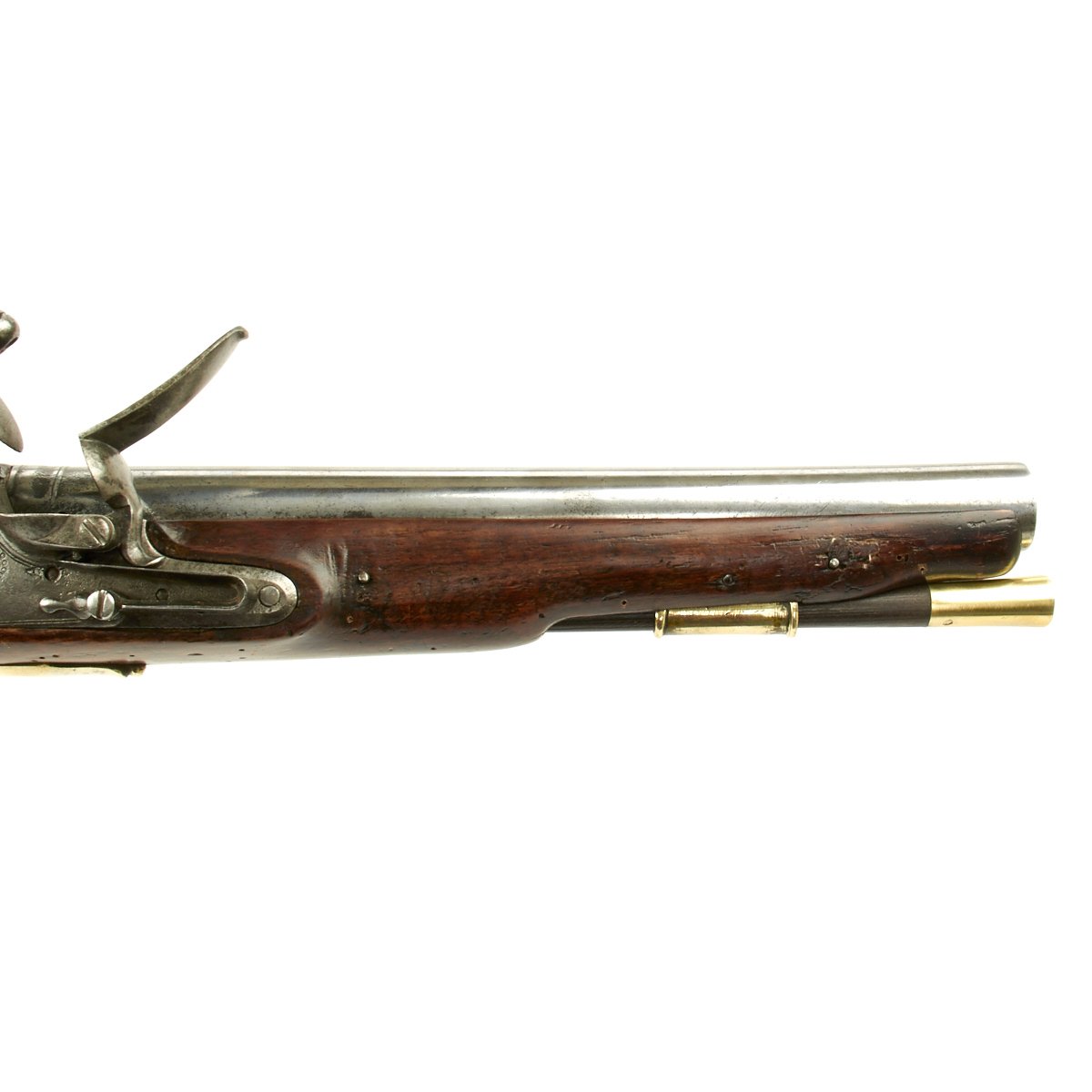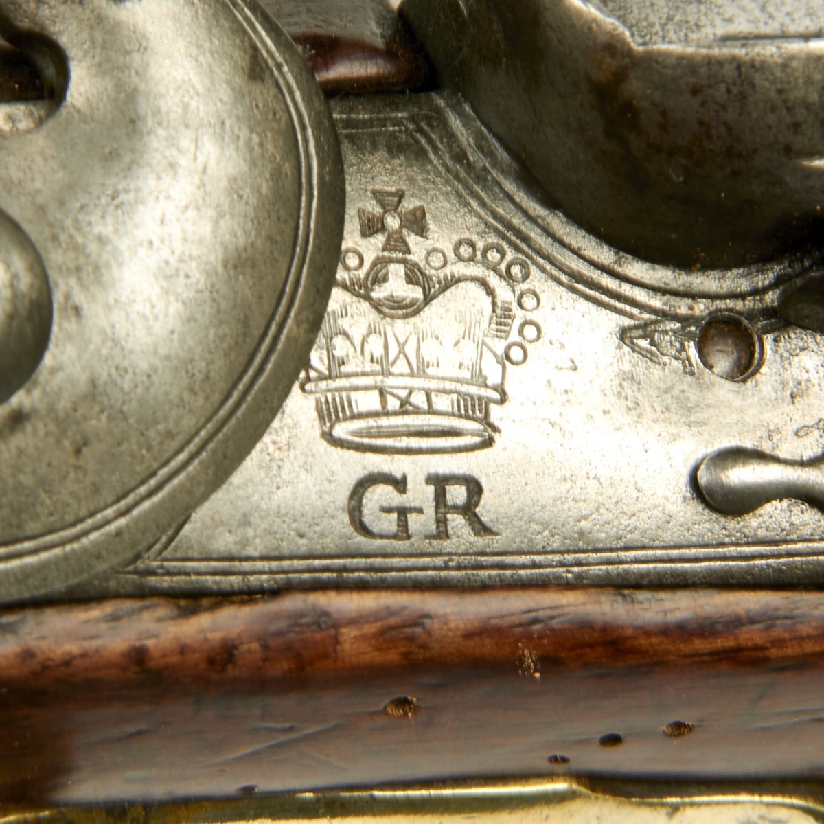 Original Item: One Only. This is a really nice British .65" Dragoon flintlock pistol made by the famous London Gun Maker, HENRY NOCK. Signed across the rear of the lock plate H.NOCK and bearing the traditional CROWN over G.R. to the lock plate's center. All brass mounts complete with brass tipped ram rod, the brass trigger guard is engraved A/11, indicating the Company and the Trooper to which this was originally issued. The brass butt cap's left side engraved :-
