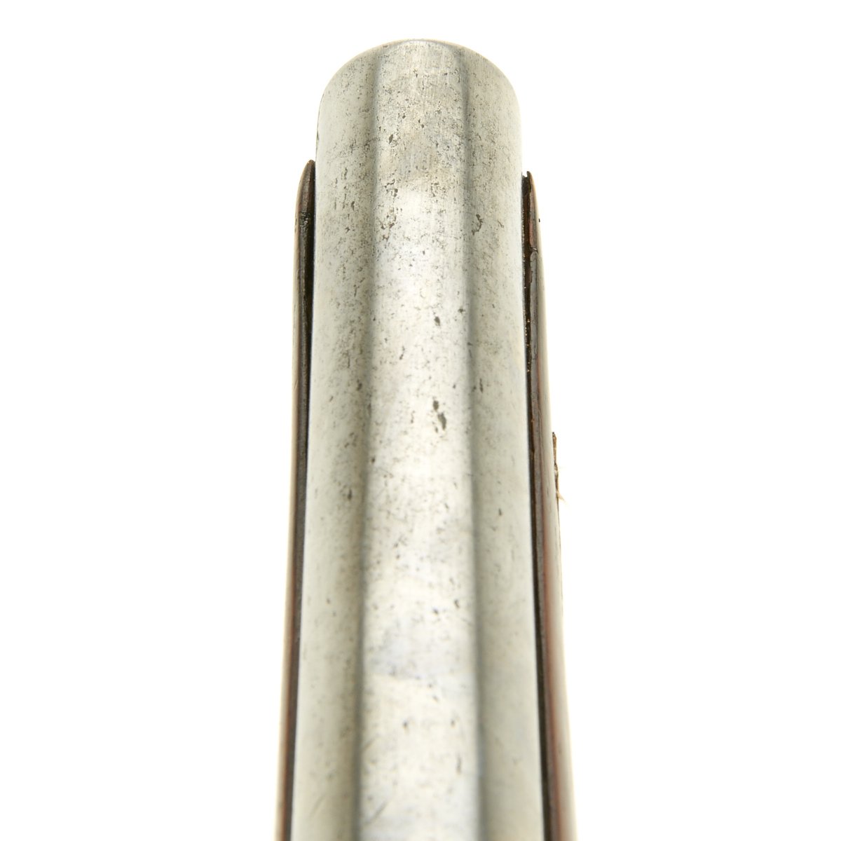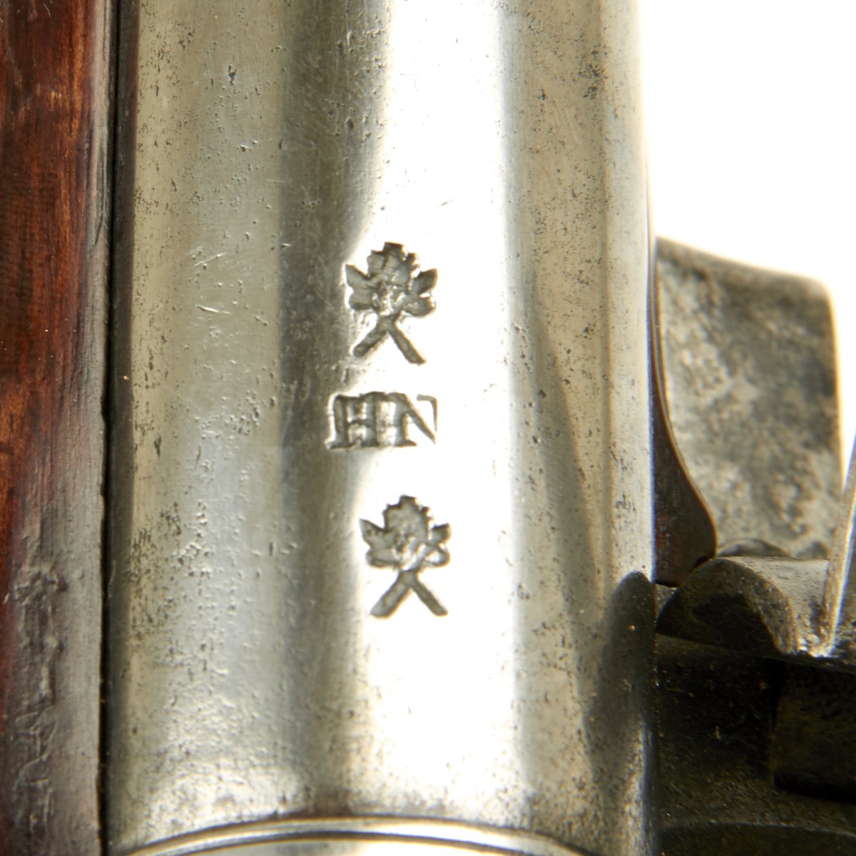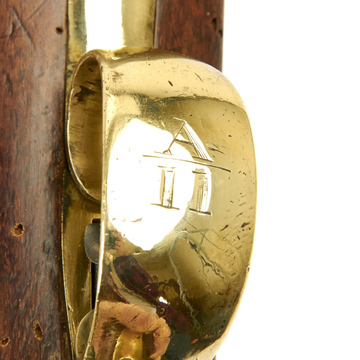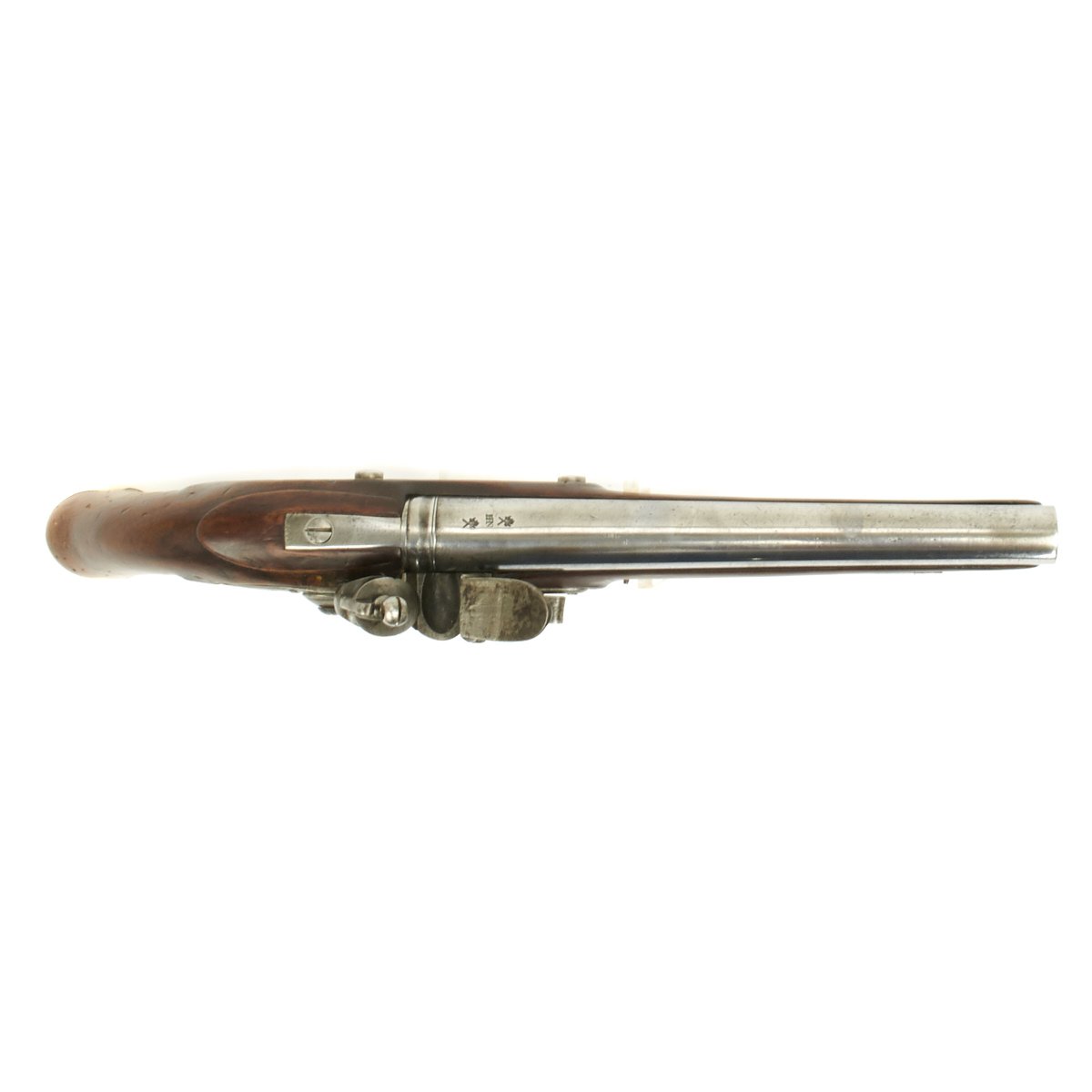 Original Item: One Only. This is a really nice British .65" Dragoon flintlock pistol made by the famous London Gun Maker, HENRY NOCK. Signed across the rear of the lock plate H.NOCK and bearing the traditional CROWN over G.R. to the lock plate's center. All brass mounts complete with brass tipped ram rod, the brass trigger guard is engraved A/11, indicating the Company and the Trooper to which this was originally issued. The brass butt cap's left side engraved :-
