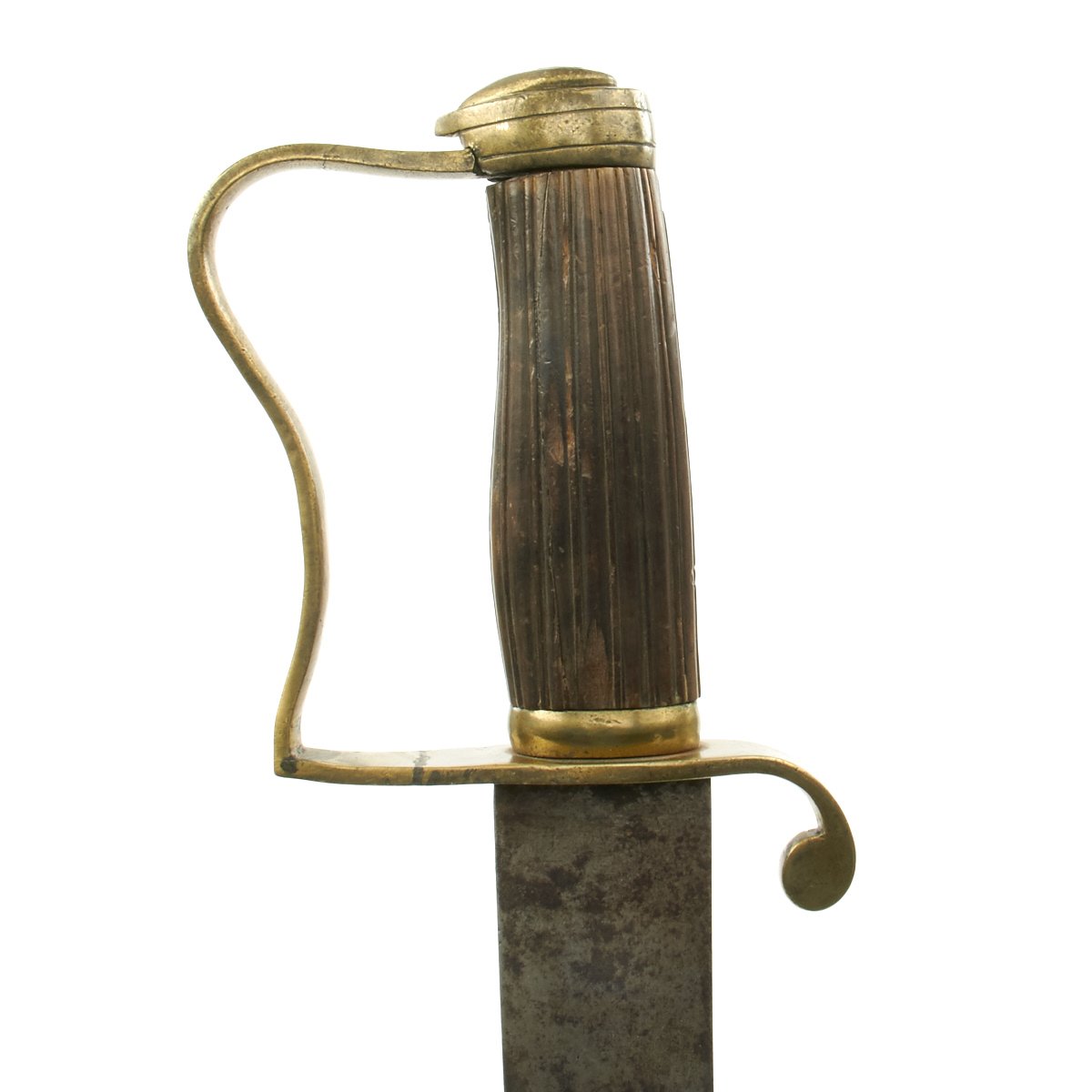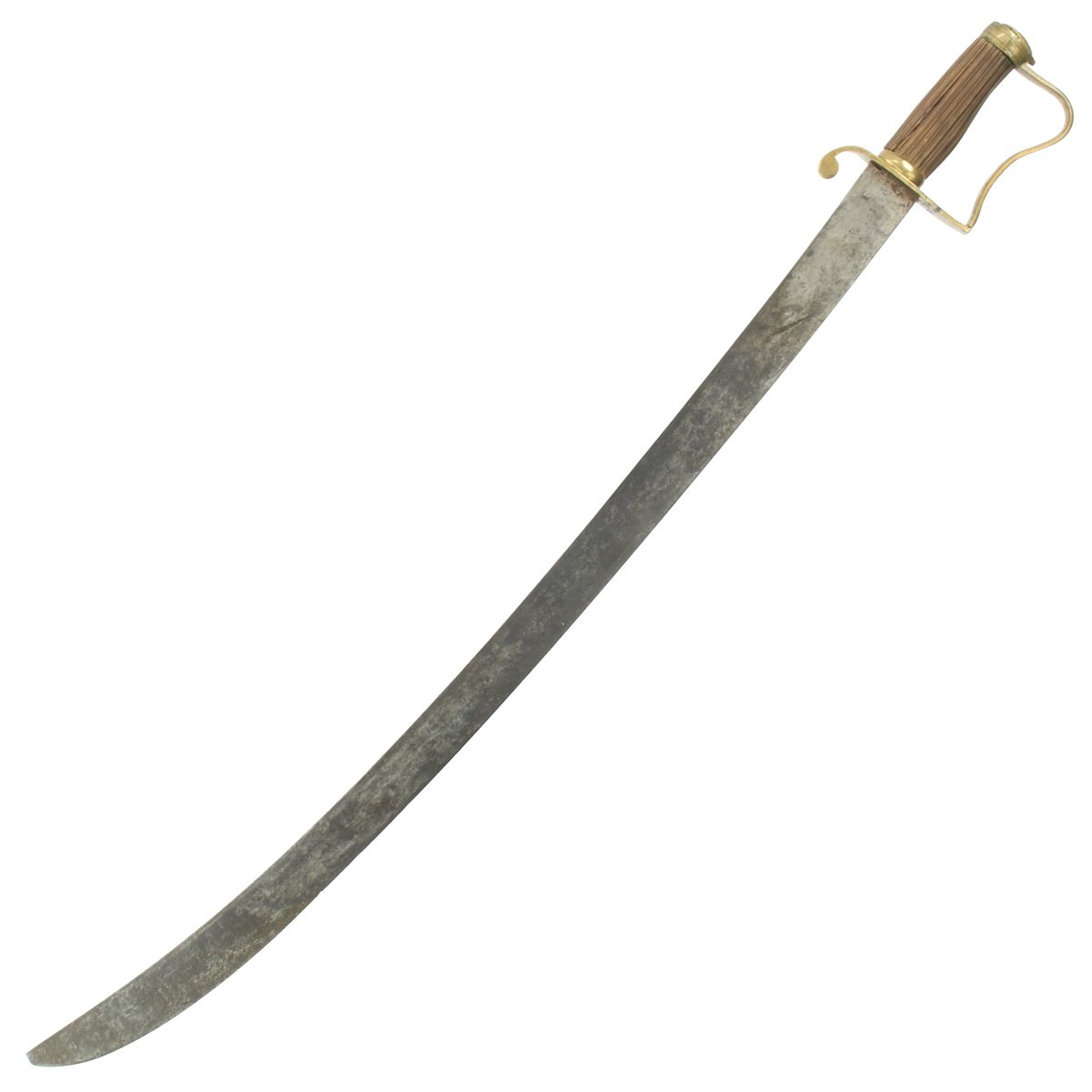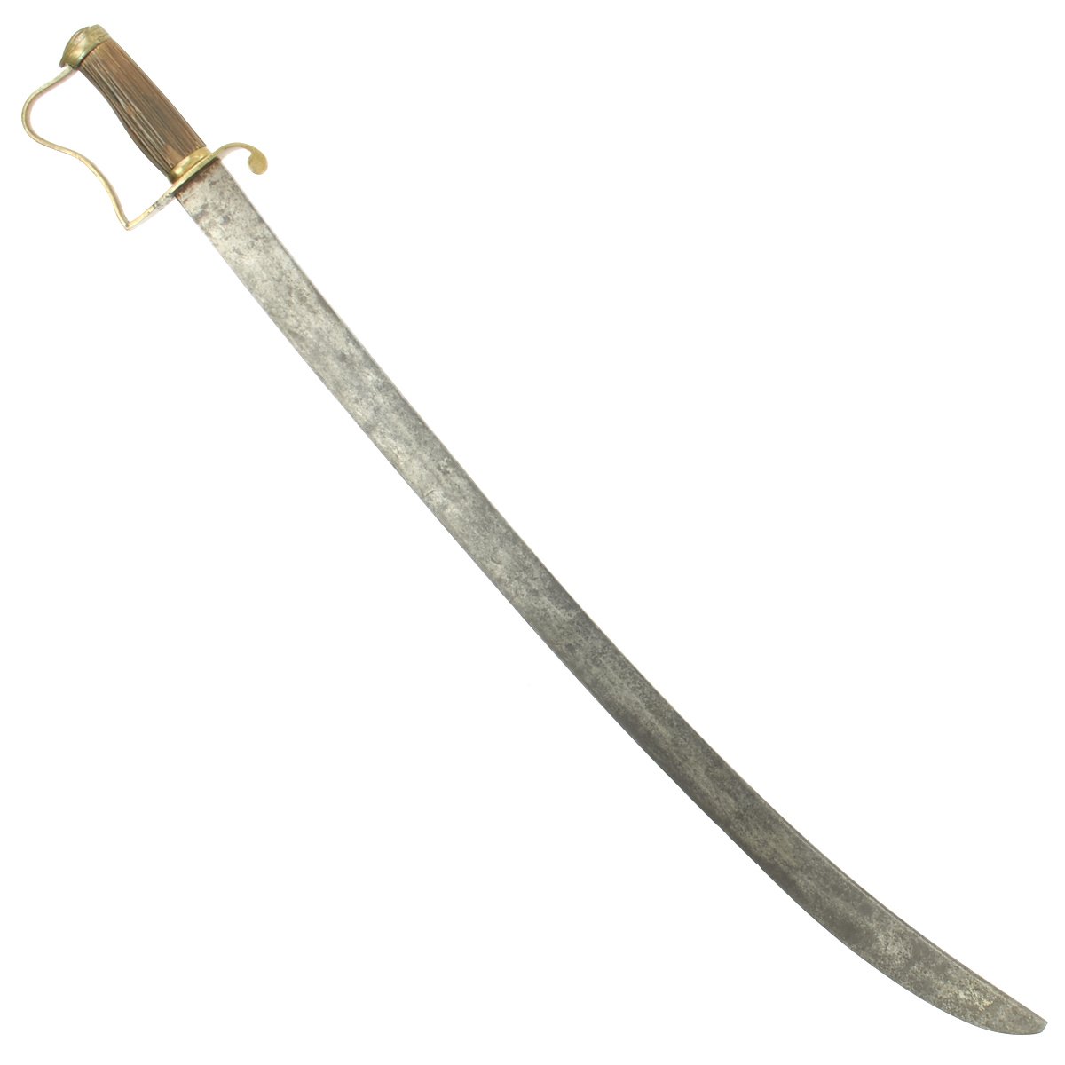 Original Item: Only One Available. This is a fine British Naval Cutlass measuring 35" in overall length with a slightly curved meaty blade of nearly 30". The blade is stamped WOOLEY / & DEAKIN, who worked in LONDON from 1780 until 1830. The grip is of fluted fine-grained hardwood, with a single stirrup type brass guard.