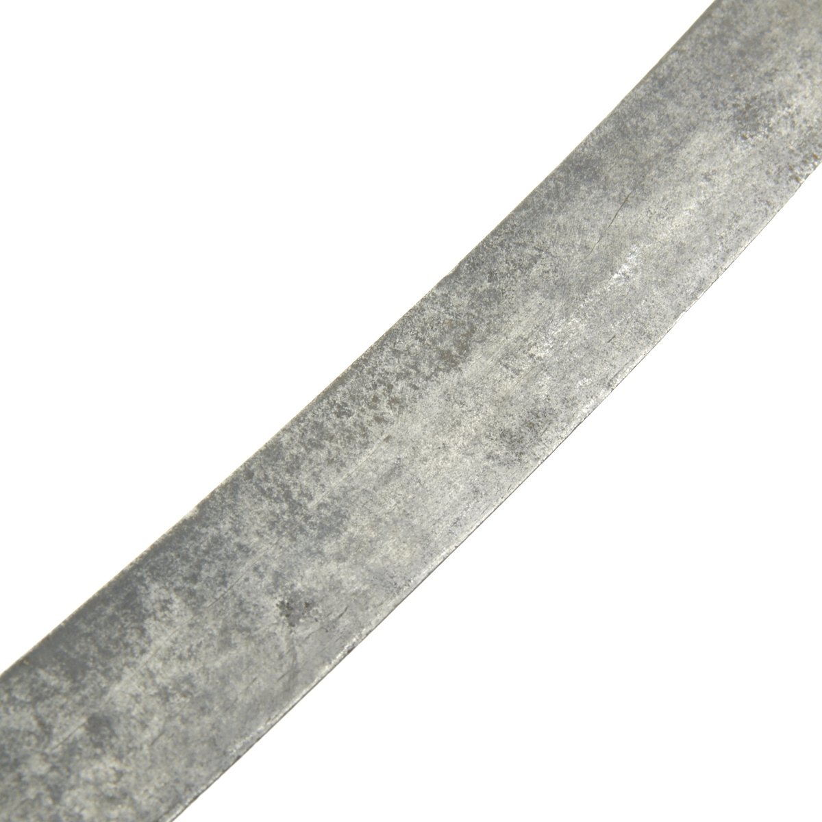 This is a very imposing weapon, the blade without fullers on either side, resulting in a very heavy weapon. The very tip of the blade is absent, but may have been purposely removed, as the cut is clean.