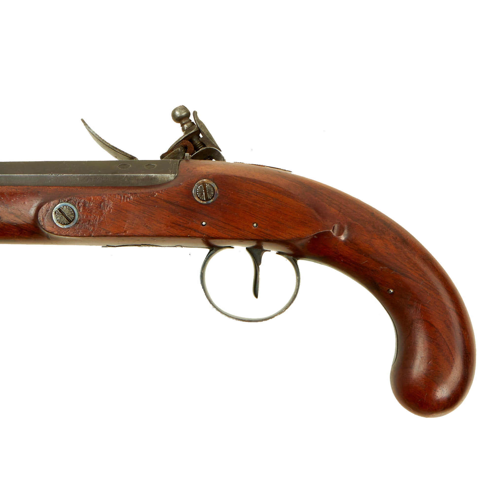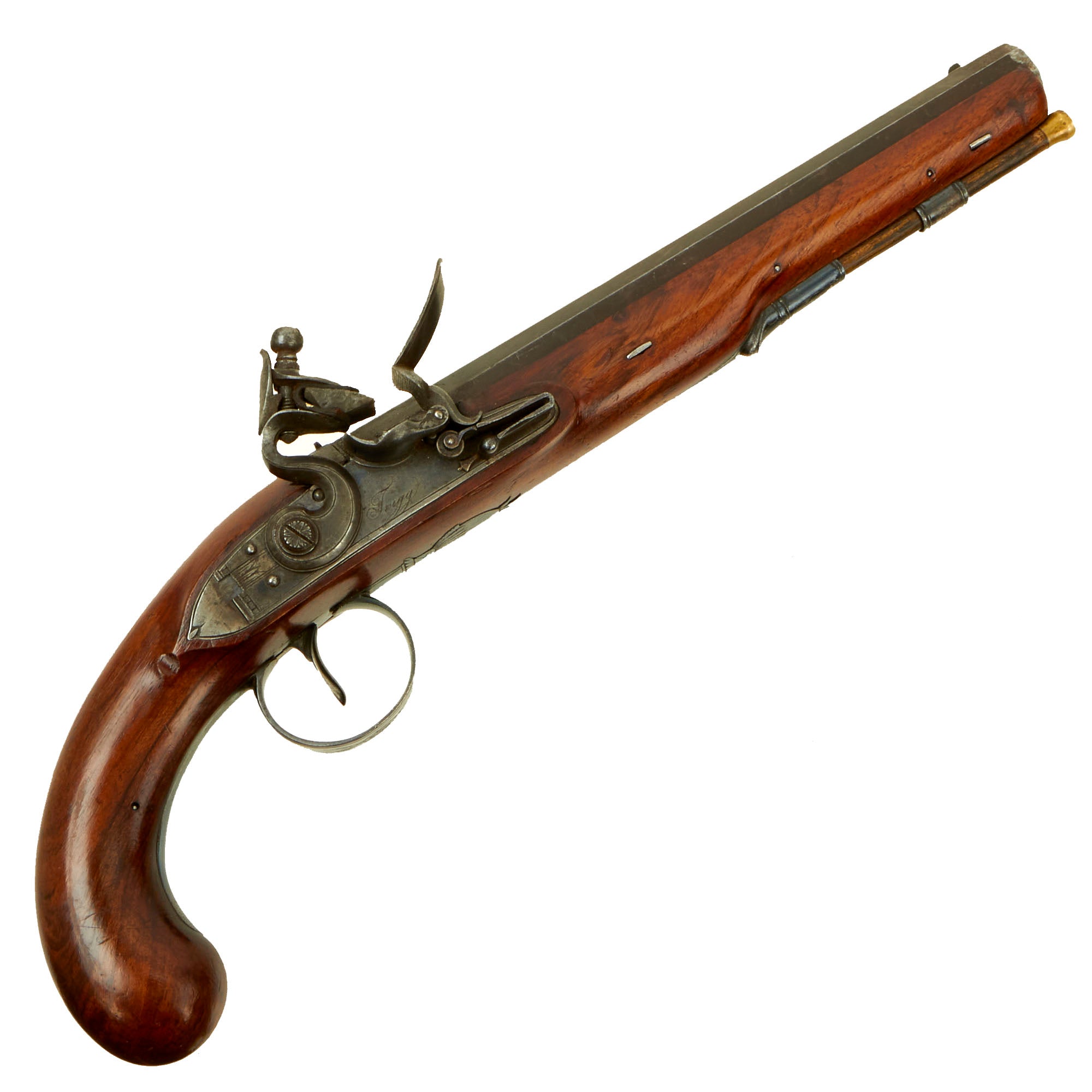 Original Item: Only One Available. Here we have a fantastic upmarket officer's private purchase rifled flintlock pistol of exceptional quality and lineage. It is marked on the Lock plate with script Twigg, and on the barrel with a script Twigg London. These are the markings of John Fox Twigg, one of the finest English gunmakers of his day, and one with connections to several other famous gunmakers. After immigrating from Switzerland, the famous Durs Egg first worked for Twigg's shop located at 132 Strand, before setting out on his own. He also had John Manton as an apprentice, who rose to be his shop foreman before going out on his own.