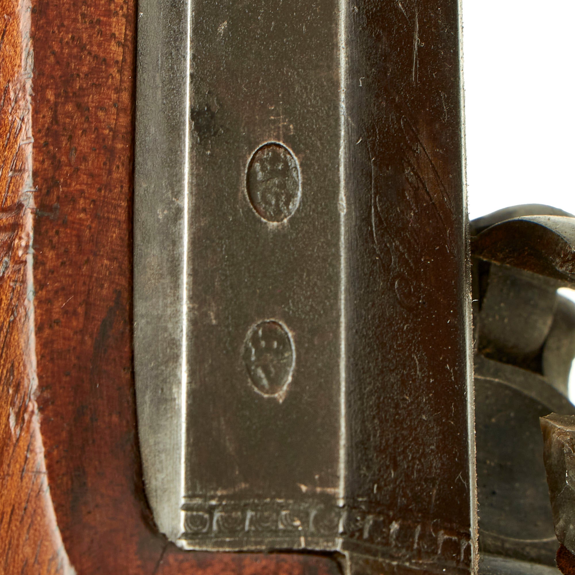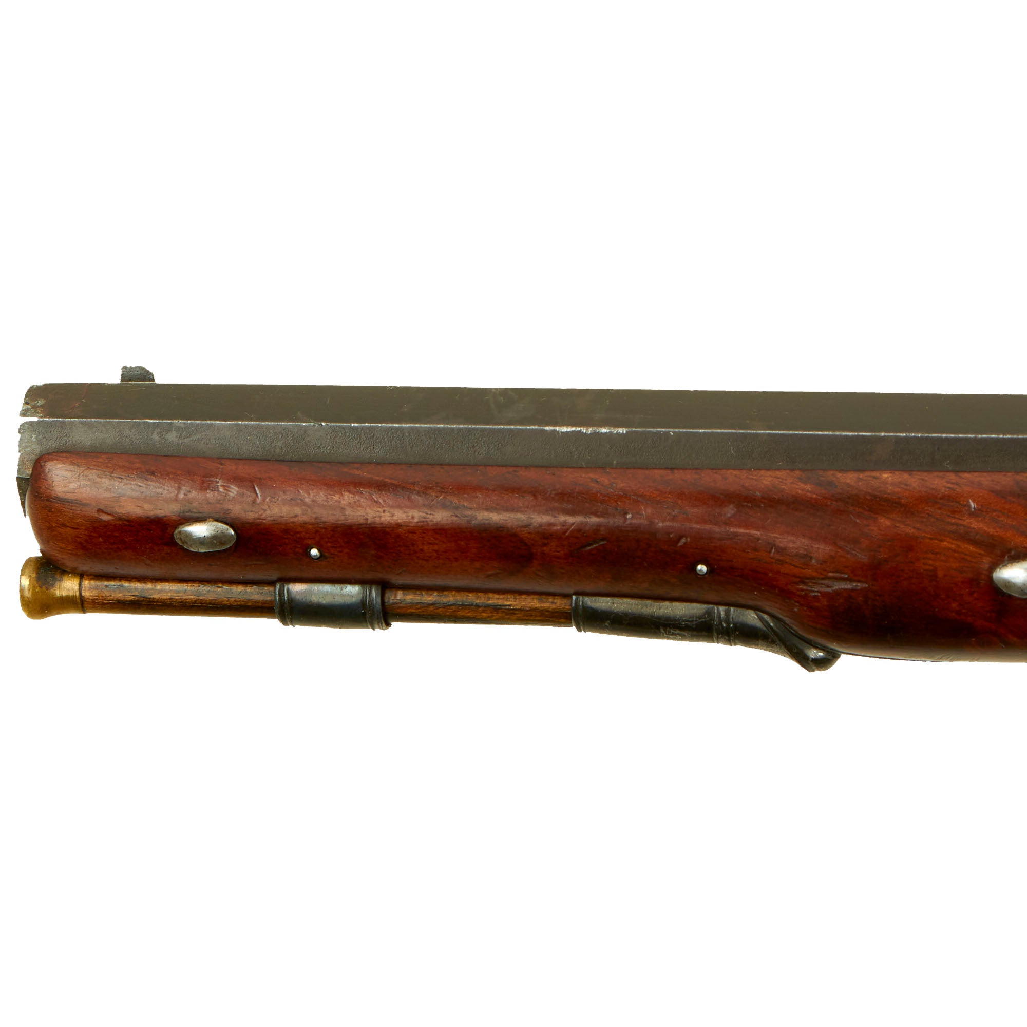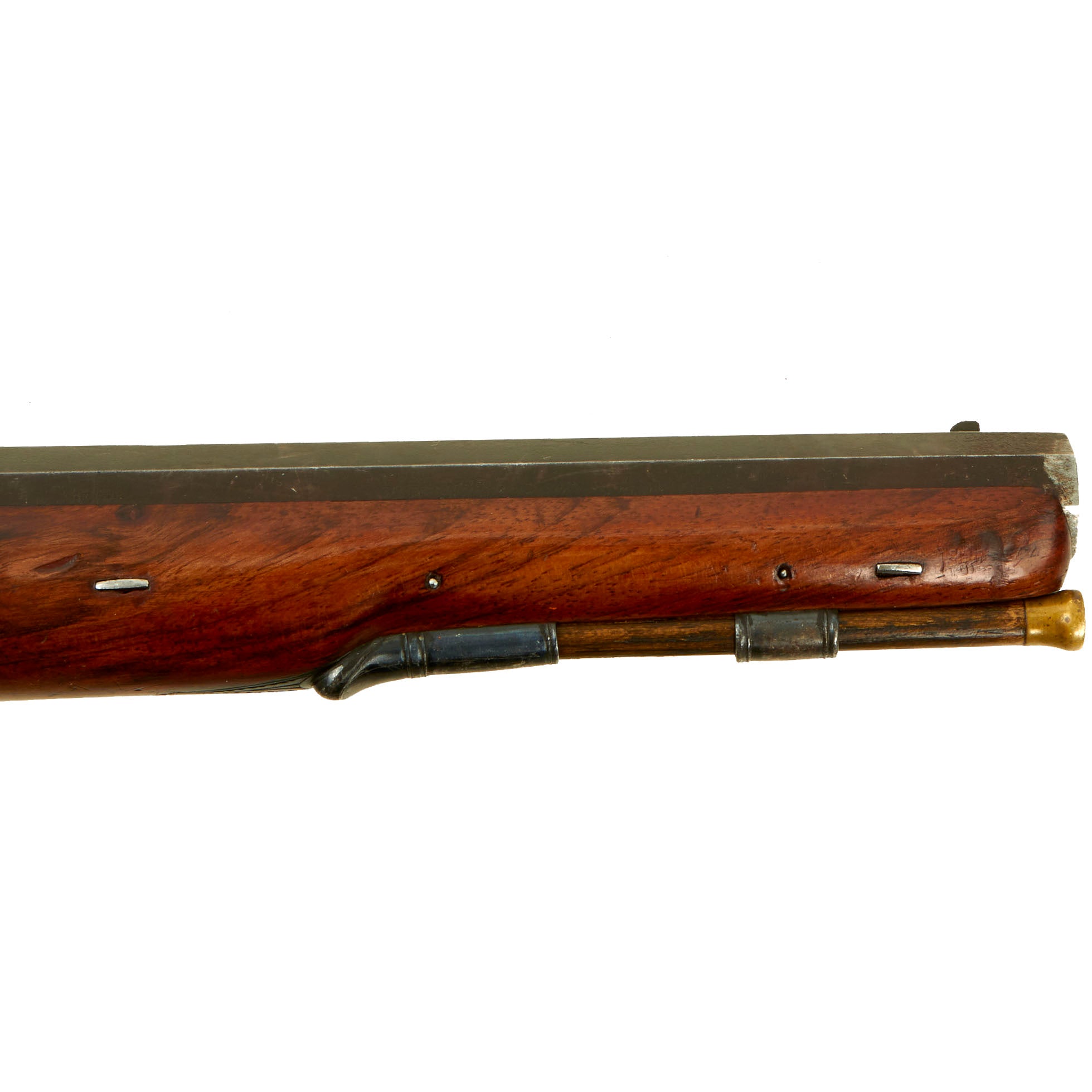 The stock is in fantastic condition, with great grain and a lovely look. It does not look to have seen much use / service at all. The lock is in good shape and functional, holding properly at half cock, and firing at full. We checked the bore, and it is bright and shiny, with crisp rifling. The finish on most of the metal components is in great shape.