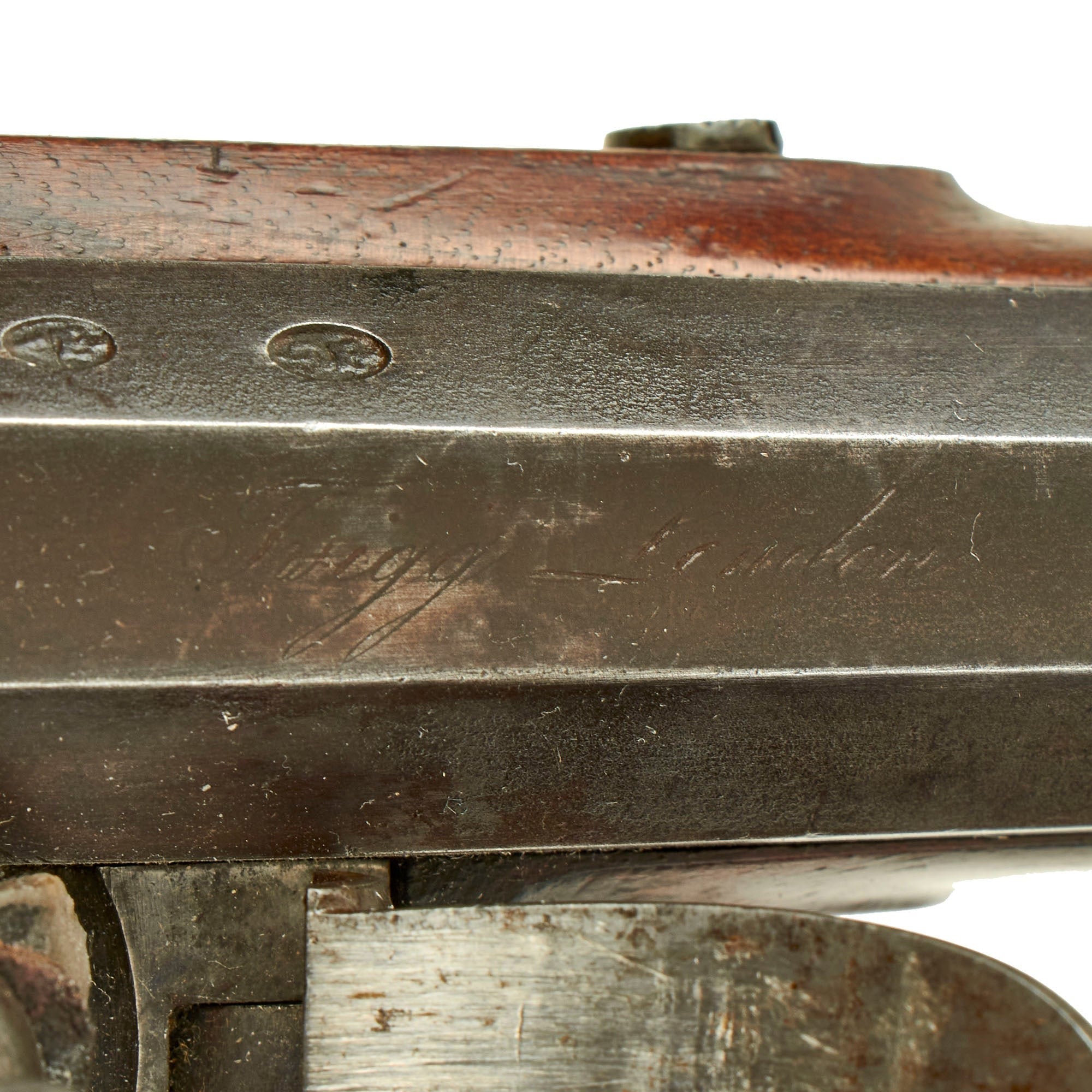This lovely pistol is full stocked and has all steel / iron fittings, which are all beautifully engraved and executed. It features an octagonal barrel of 9" with an overall length of 14 1/4". The lock plate has a bevel at the rear, but no royal cypher, indicating it was a private purchase item and not made for a military contract. It was originally made with a hammer safety, but this broke off or was removed, as they often would catch on clothing. The barrel has the CROWN / GP "Gunmakers" proof and CROWN / V viewed markings of the London Proof house on the left barrel facet. It comes complete with its brass tipped ramrod.