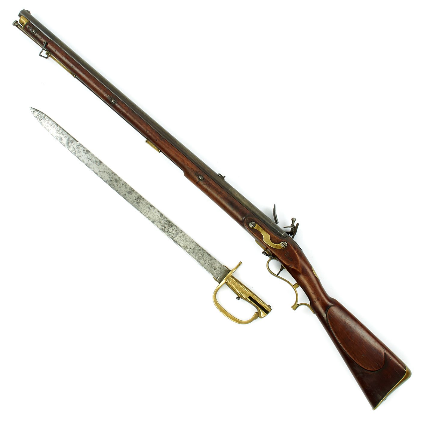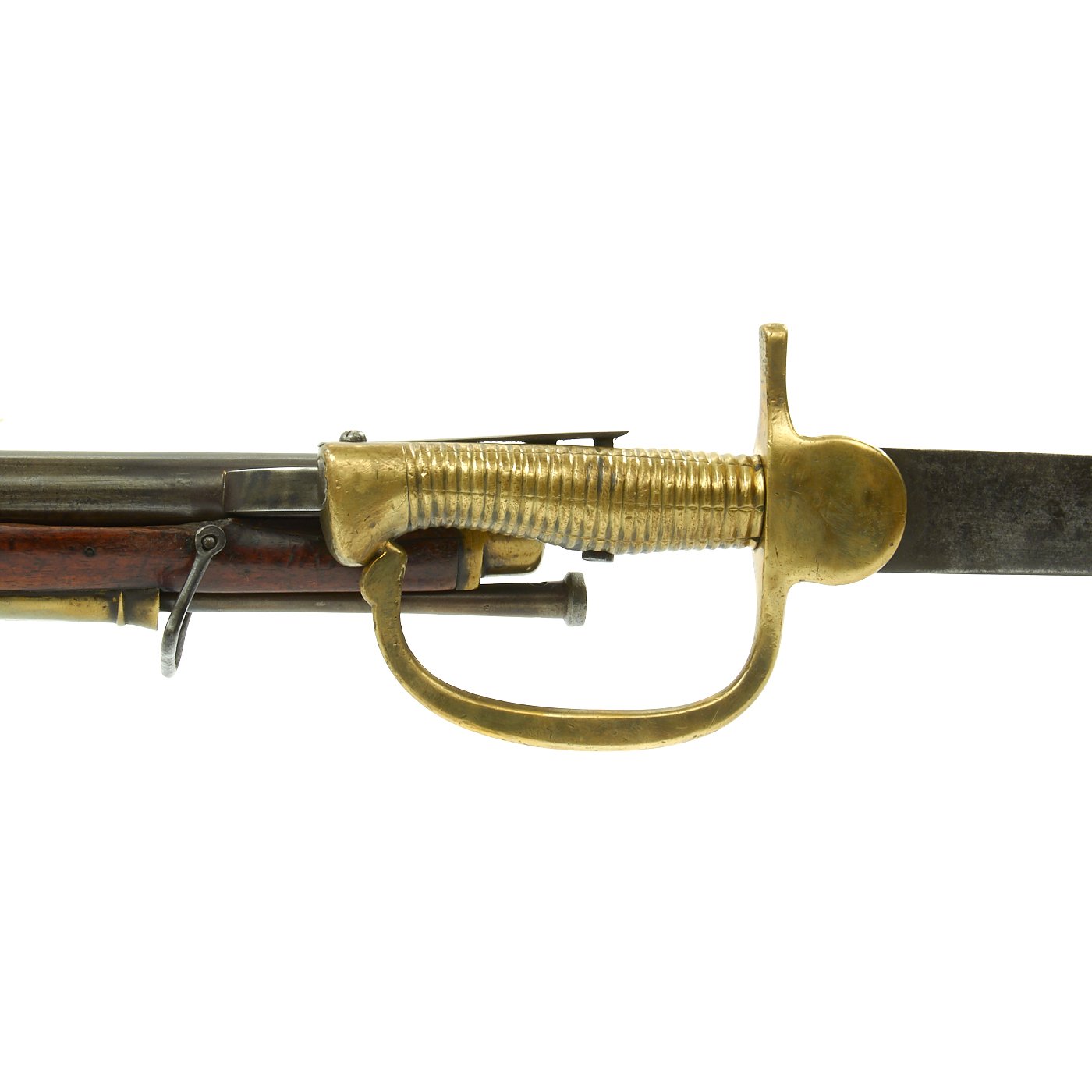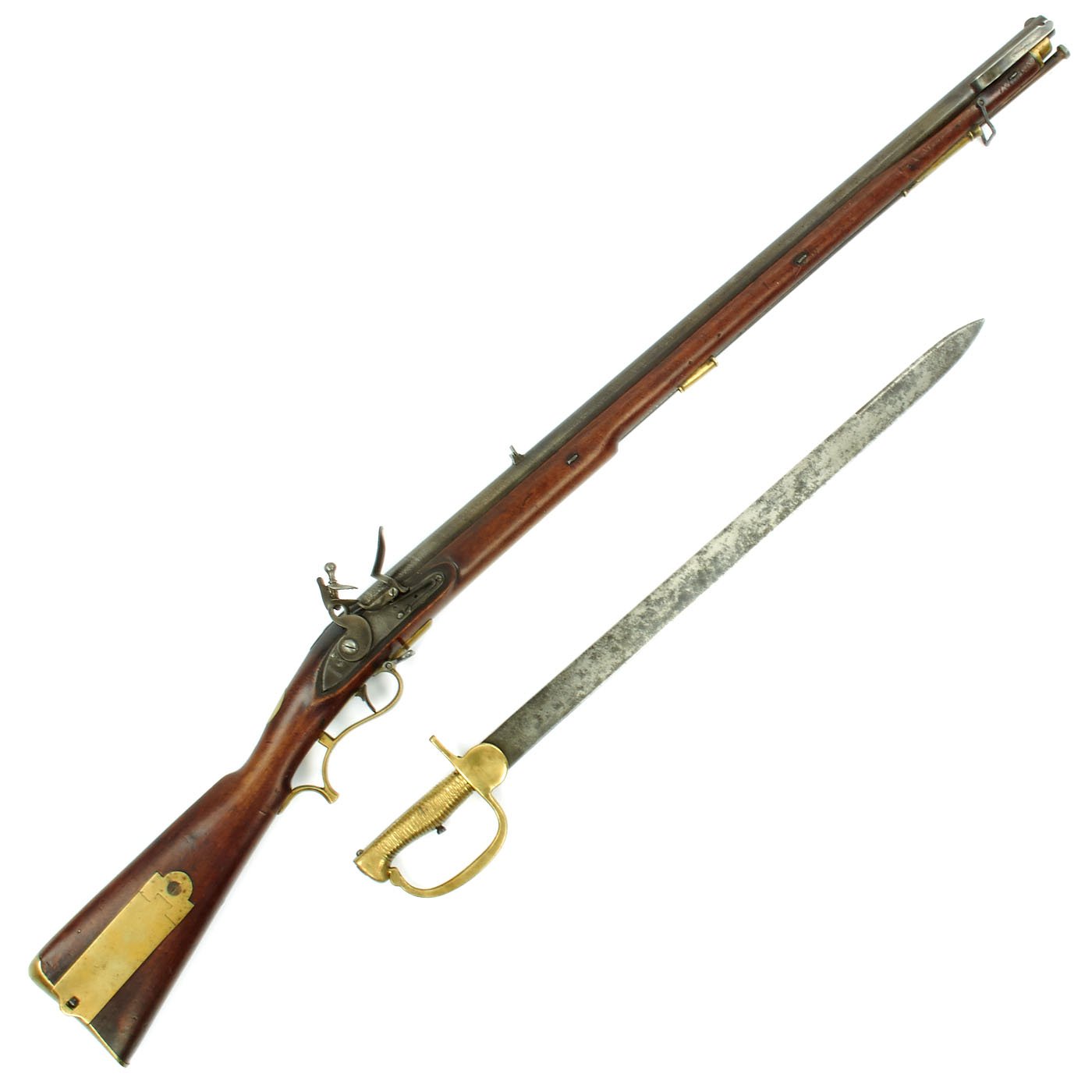 As stated this is the most appealing and best condition true Baker Rifle we have ever seen. It also comes with its original pattern brass hilted Sword Bayonet with groves in the grip and an un-fullered blade of 22 1/2" in length. There is an H / 4 Proof mark just above the cross guard scallop. The bayonet makers, name often found on the top of the blade in capital letters directly in front of the brass cross guard, has largely worn away but remnants of the upper case letters are evident at the edge of the blade. There are also traces of a regimental designation on the scallop, but they are all but worn away.