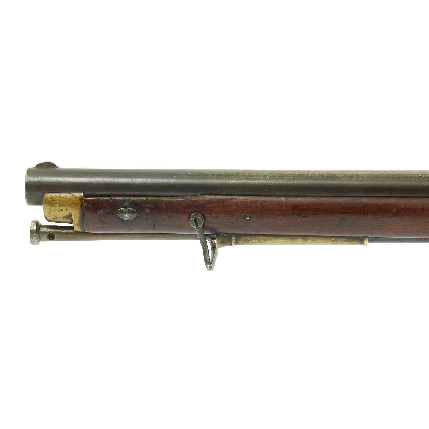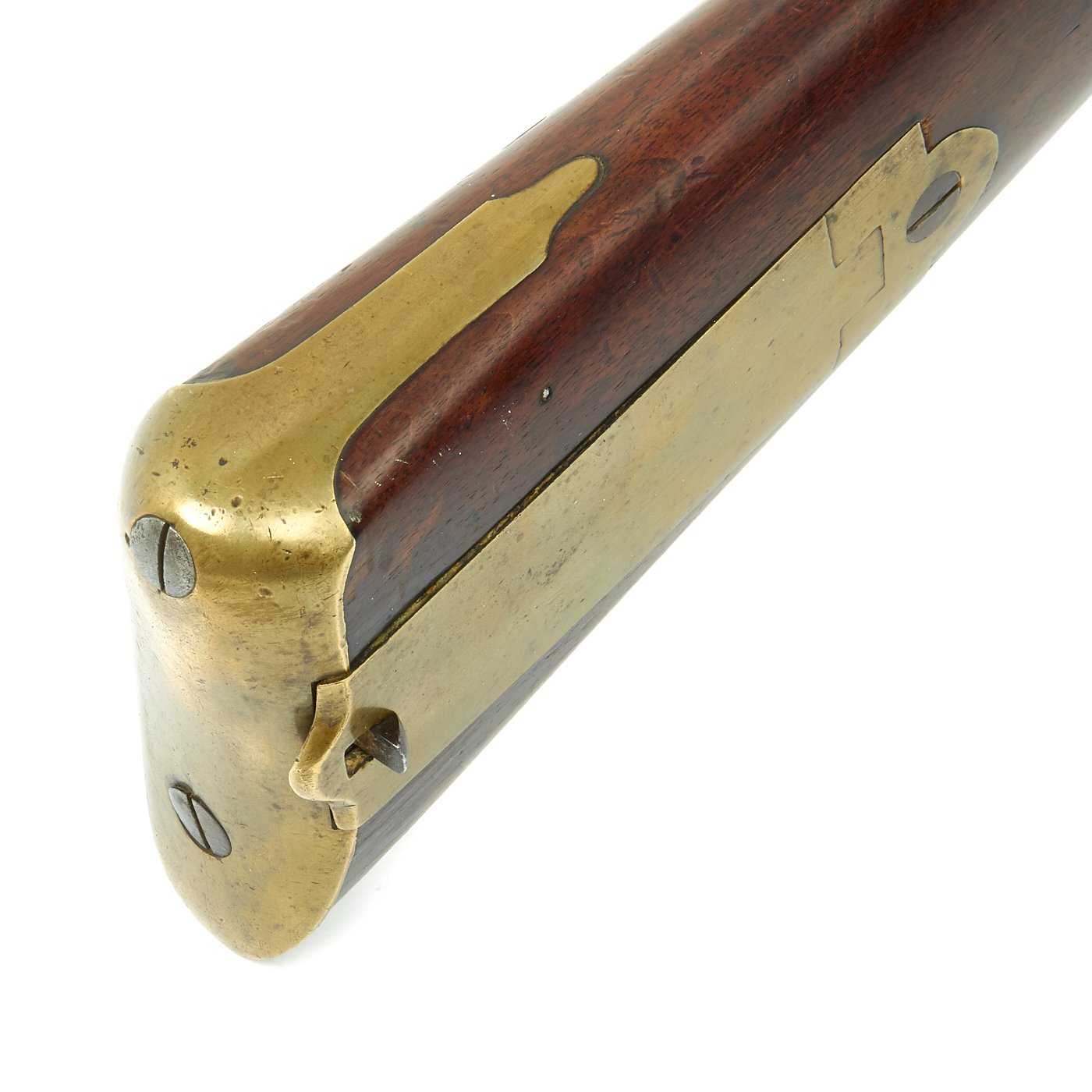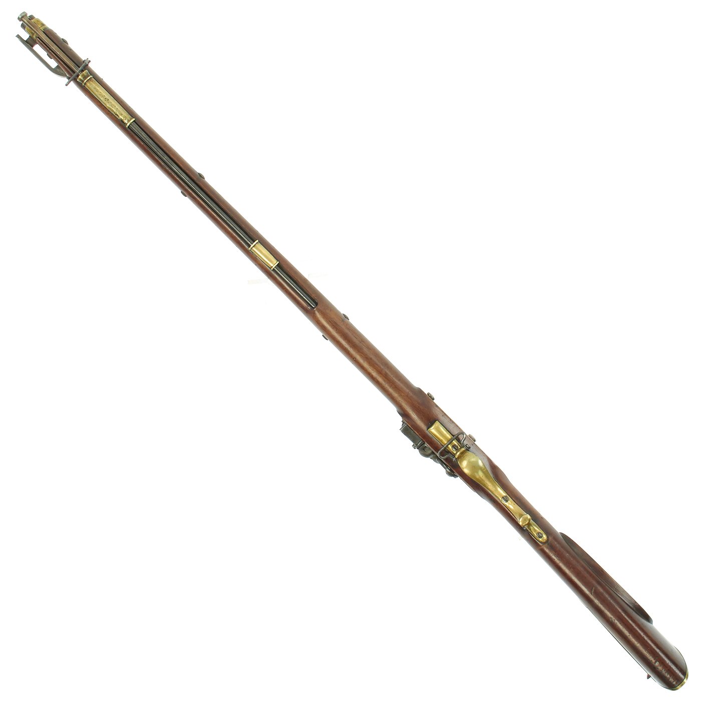 Our example is almost perfect, it is all brass mounted, a wonderful near perfect walnut stock which comes up to the muzzle which terminates with a brass nose cap. The butt has the brass expected patch box and the intricate trigger guard has the brass rear extension to mimic a pistol grip. There are just two ramrod pipes, there never was a throat pipe and the button headed original ramrod is still present. There is a small sliver of wood missing from the very front directly behind where the brass bayonet grips extends back to. Easily restored but I never had it done as it probably is a result of combat or usage.
