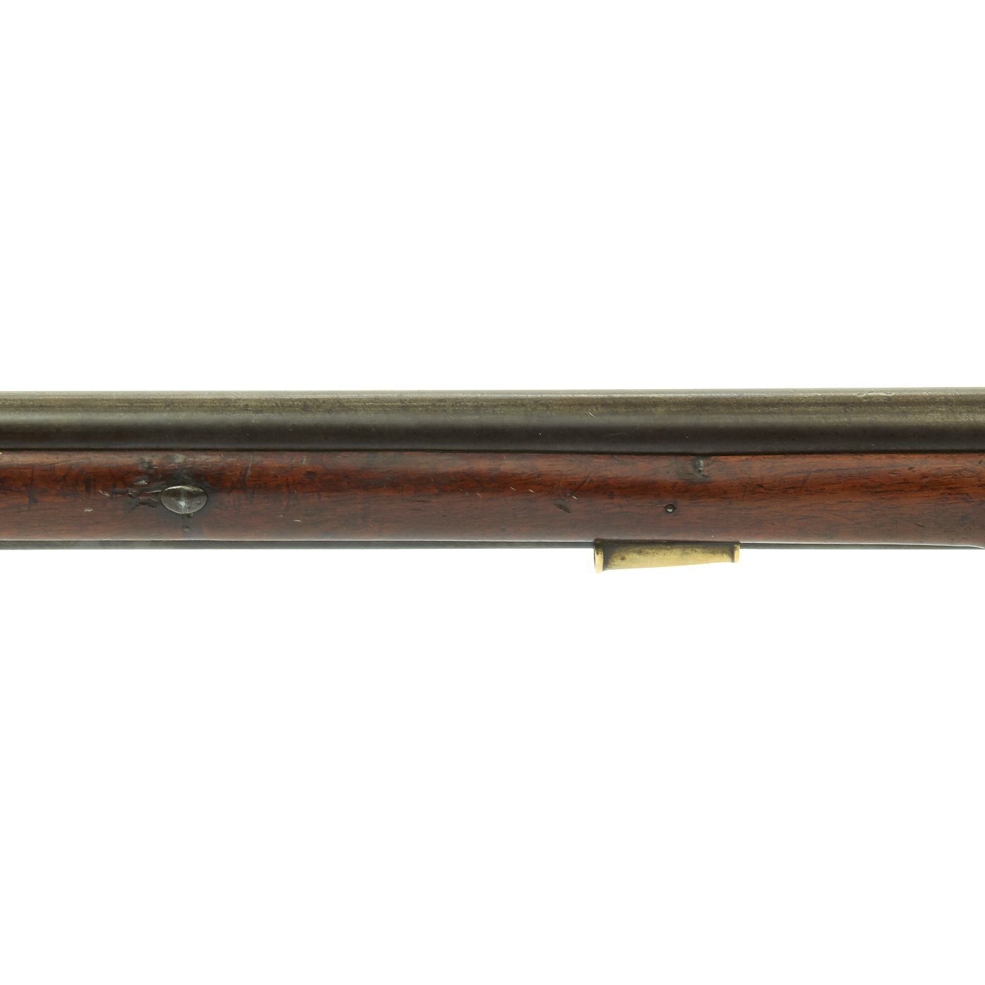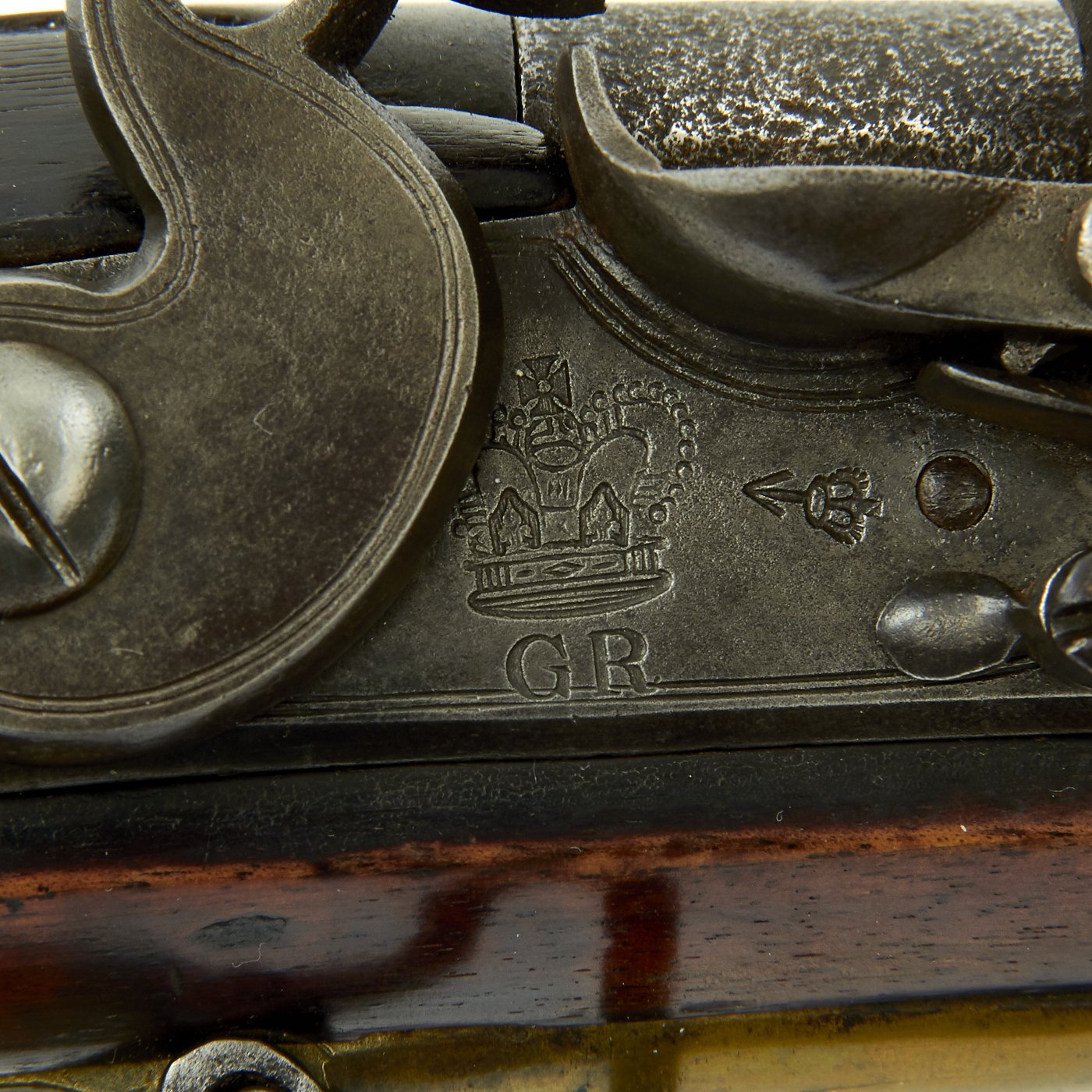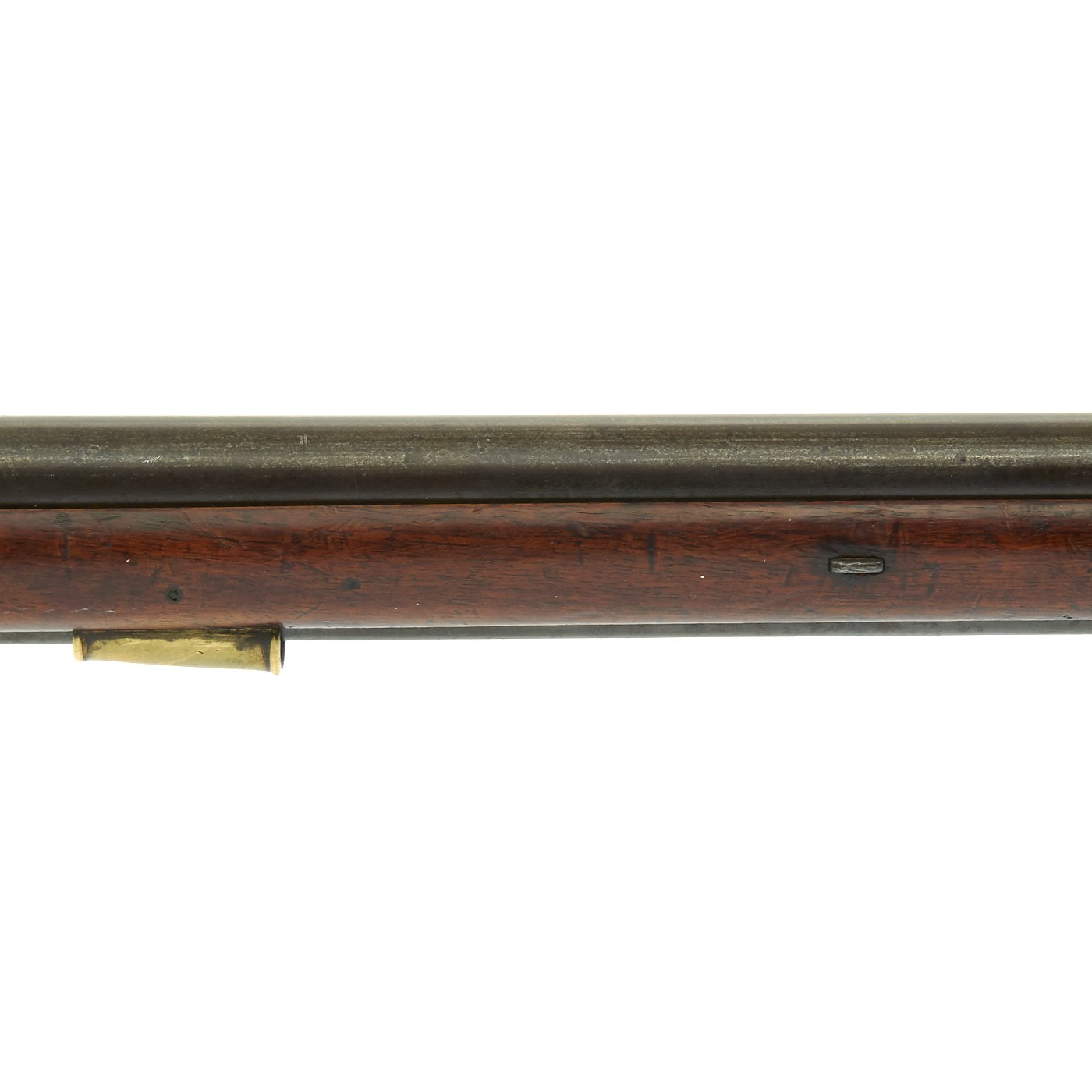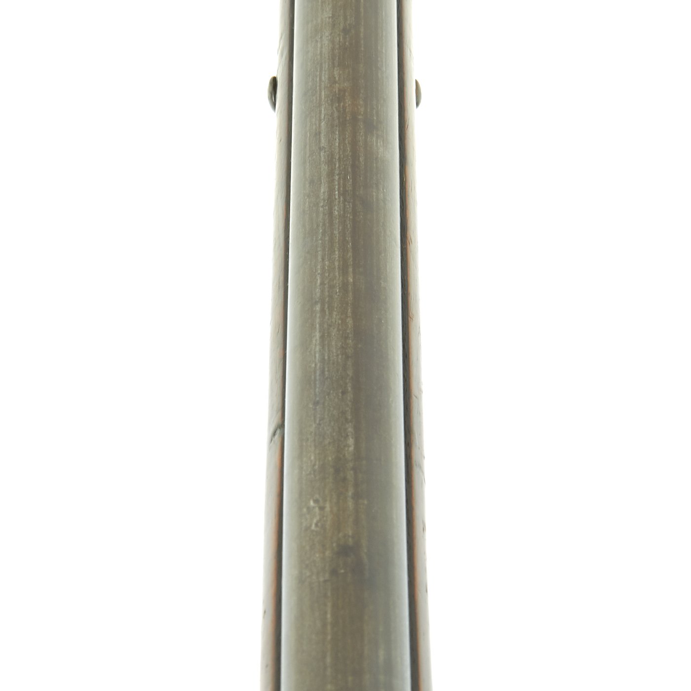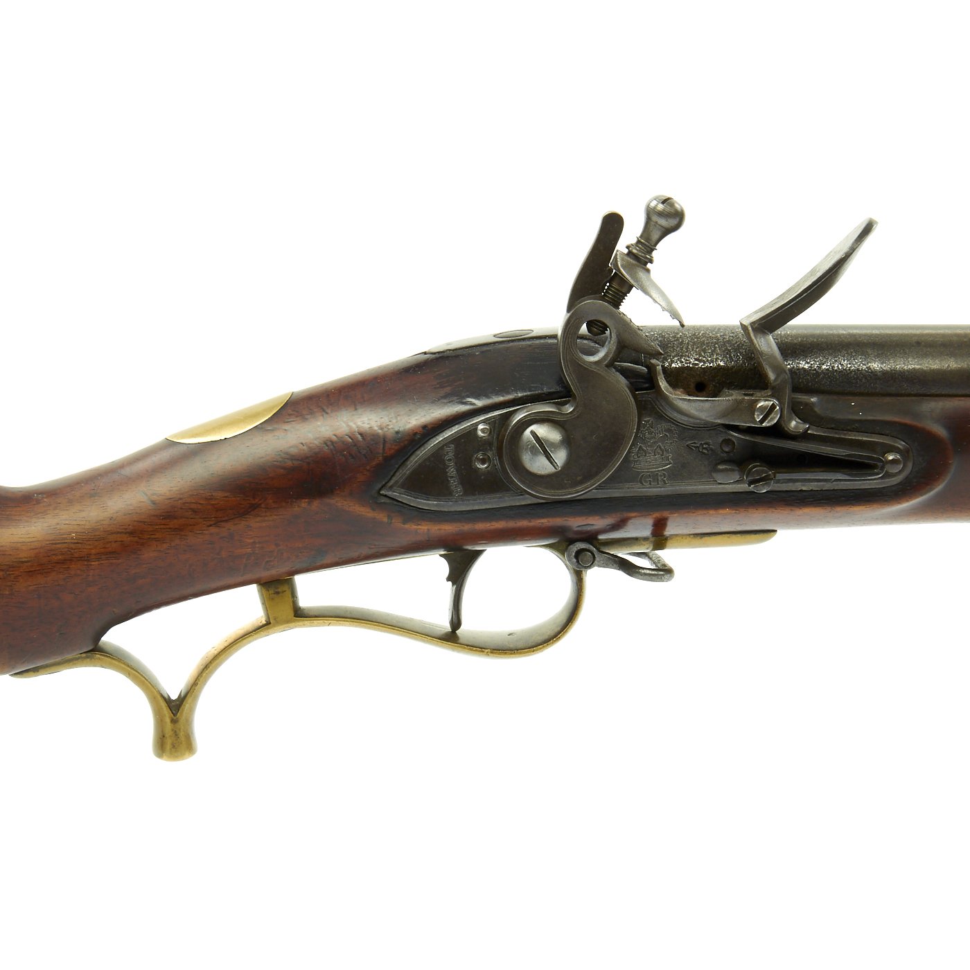 The just over 30" Barrel retains its original flip back sight and British Proof marks of CROWN / GR and the Viewing mark. There is evidence of pitting from powder burns at the right rear of the barrel and some in the pan, otherwise near perfect. The flintlock mechanism has the CROWN over G.R. with TOWER across the tail. The side of the stock by the side plate is also marked CROWN / J R / W F, but we are not entirely sure what these mean.