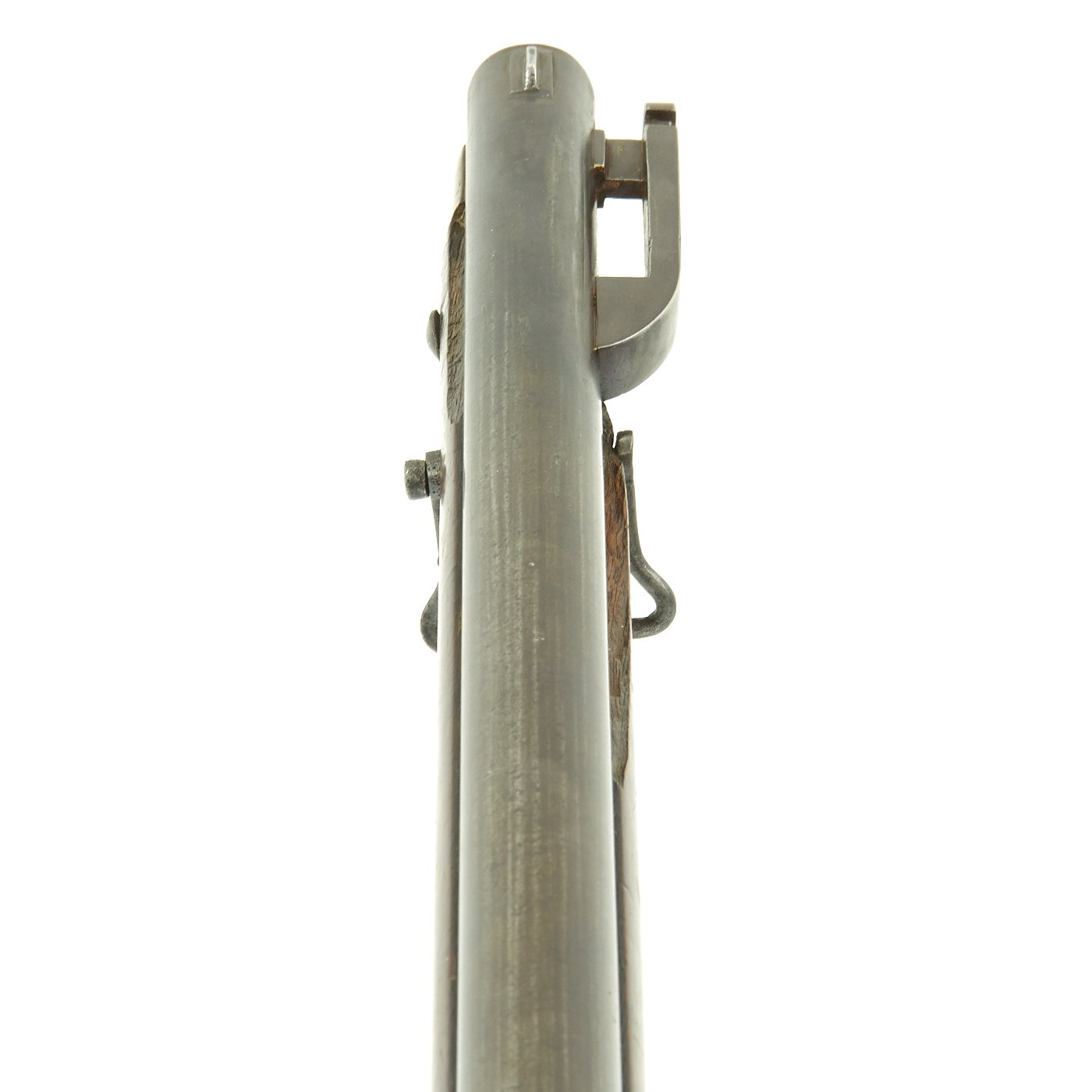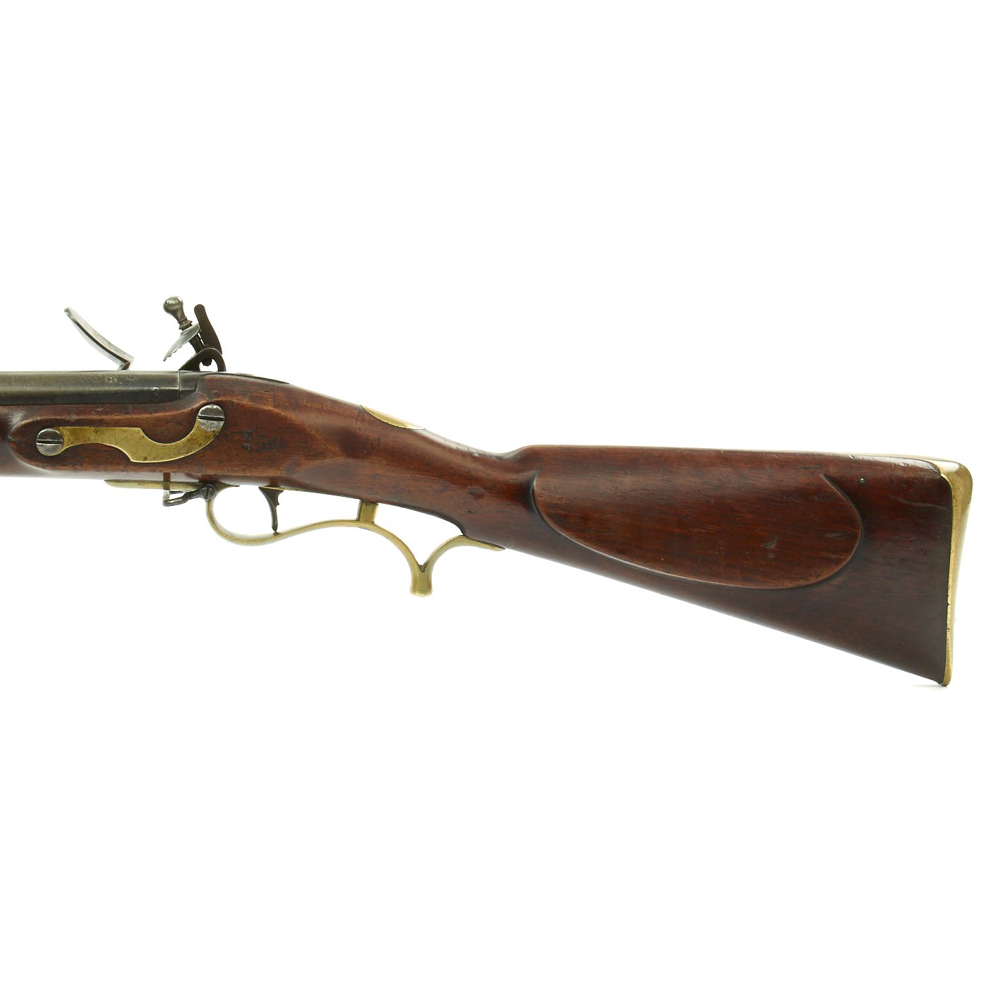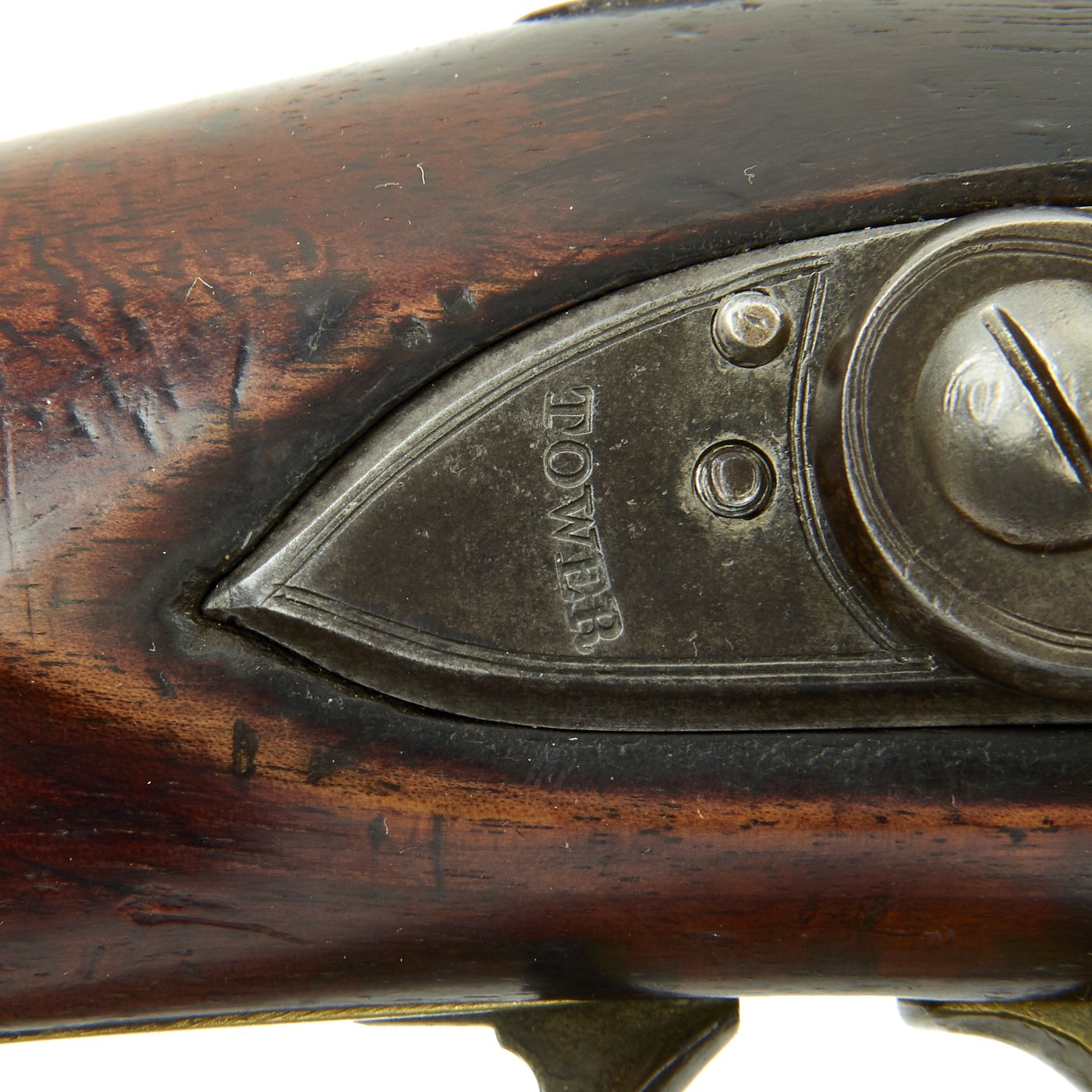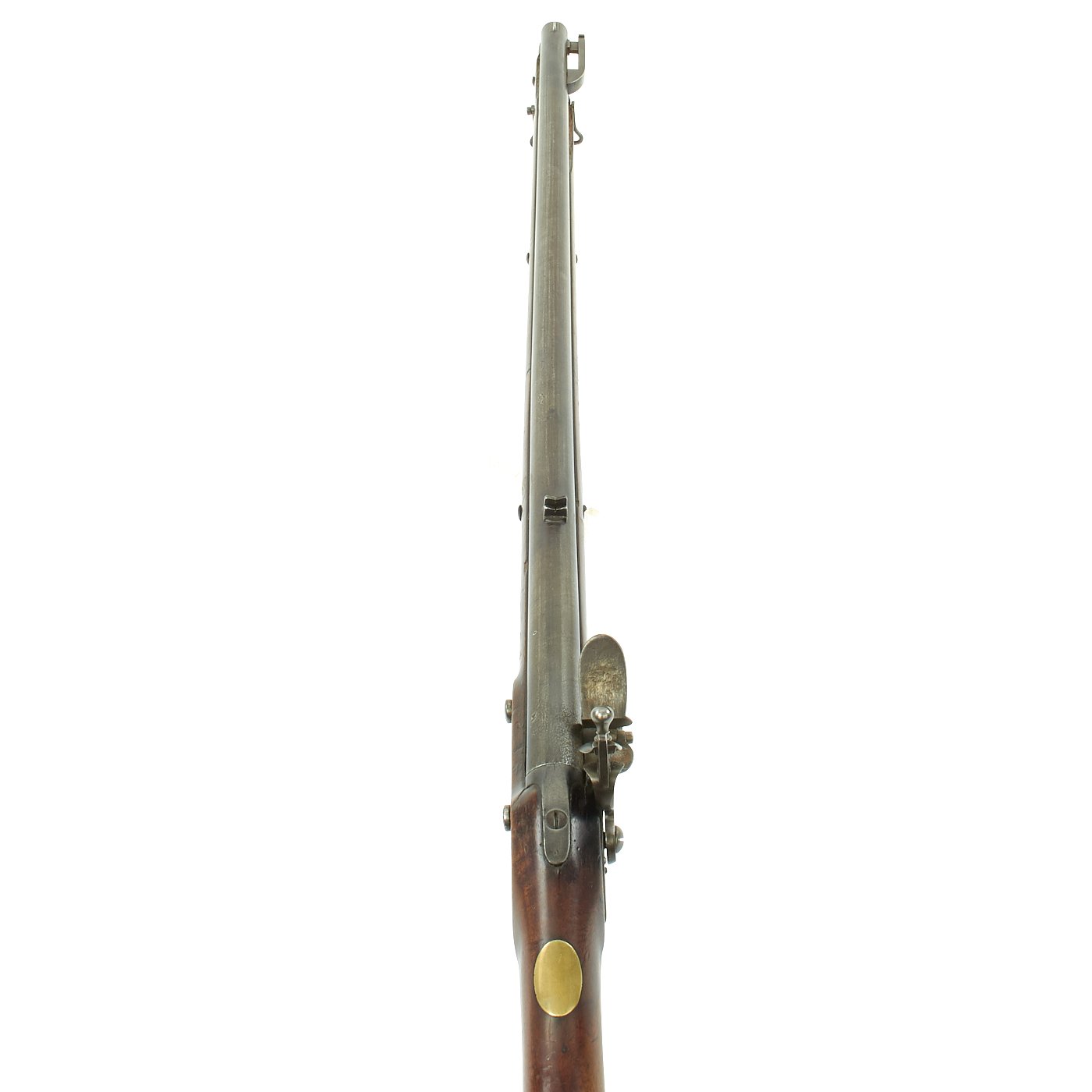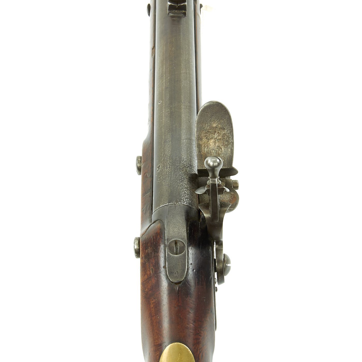 The just over 30" Barrel retains its original flip back sight and British Proof marks of CROWN / GR and the Viewing mark. There is evidence of pitting from powder burns at the right rear of the barrel and some in the pan, otherwise near perfect. The flintlock mechanism has the CROWN over G.R. with TOWER across the tail. The side of the stock by the side plate is also marked CROWN / J R / W F, but we are not entirely sure what these mean.