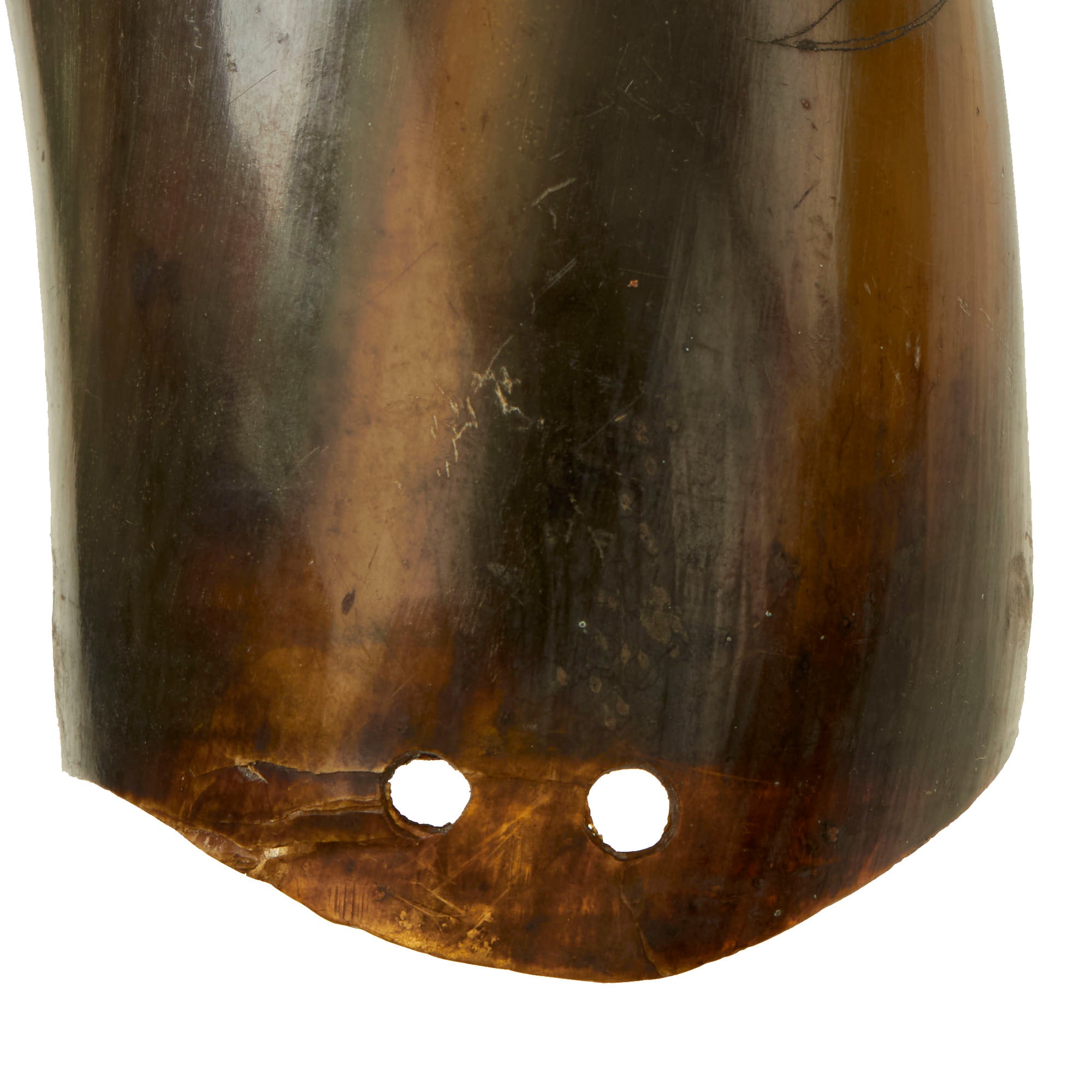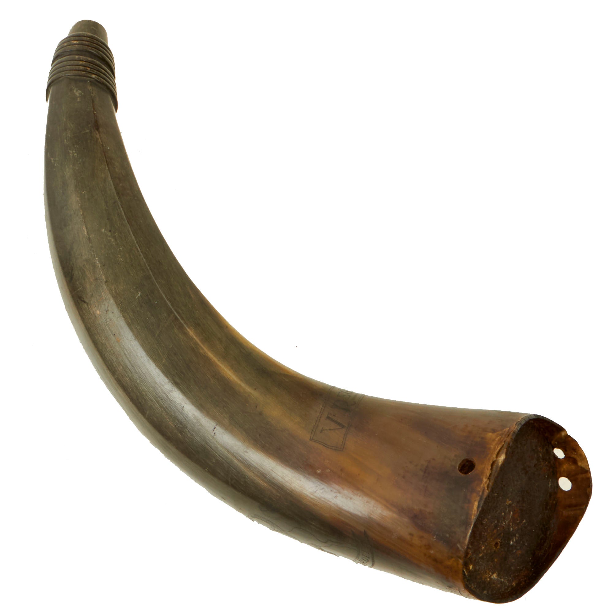 The horn is missing its plug, and measures 12” overall. The unit marking reads V REG FOOT indicating the 5th Regiment of Foot. The bottom of the horn is plugged well and is a bit dirty. This is a great example worthy of further research! Comes ready for further research and display.