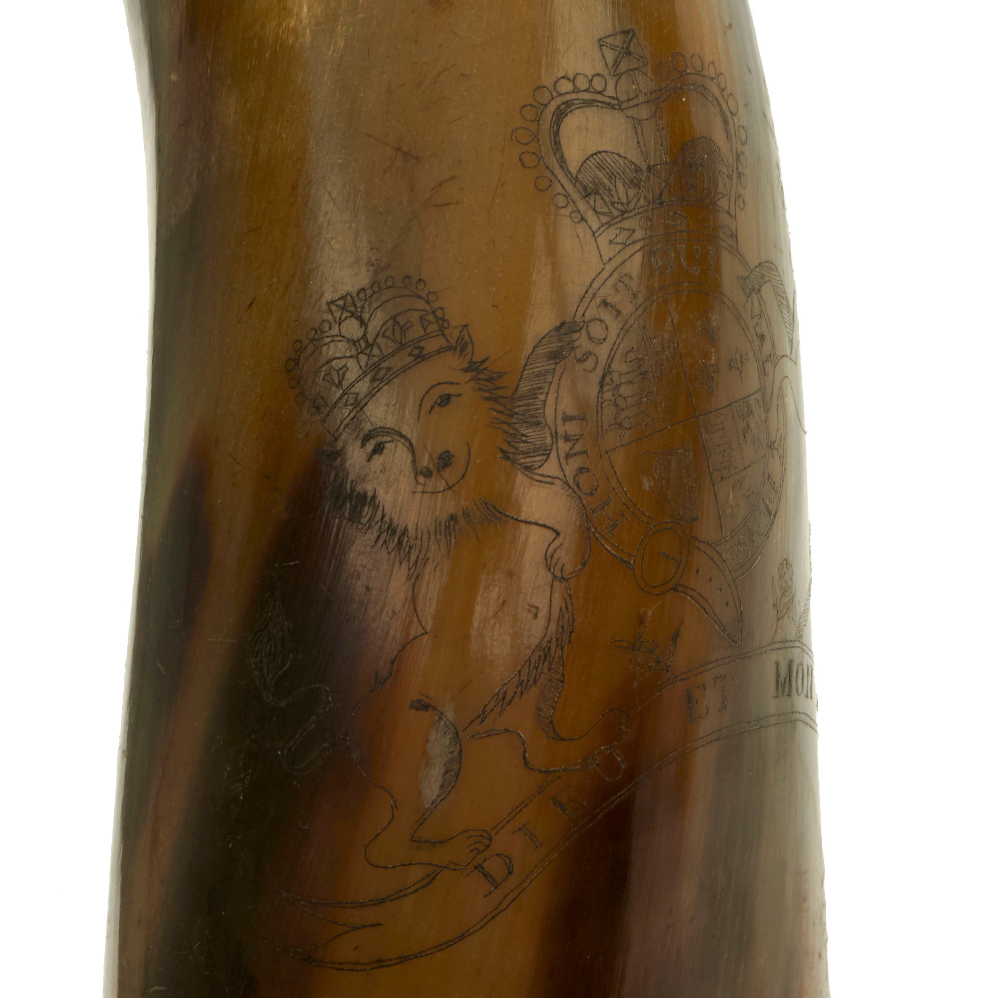Original Item. One-of-a-Kind. This is a tremendous powder horn dating to the late 18th century, depicting a regimental marking for the 5th Regiment of Foot, which saw heavy fighting in the Seven Years’ War & the American Revolutionary War, and were present at the Battle of Lexington & Concord. The horn is also gorgeously carved with the Coat of Arms of the United Kingdom.