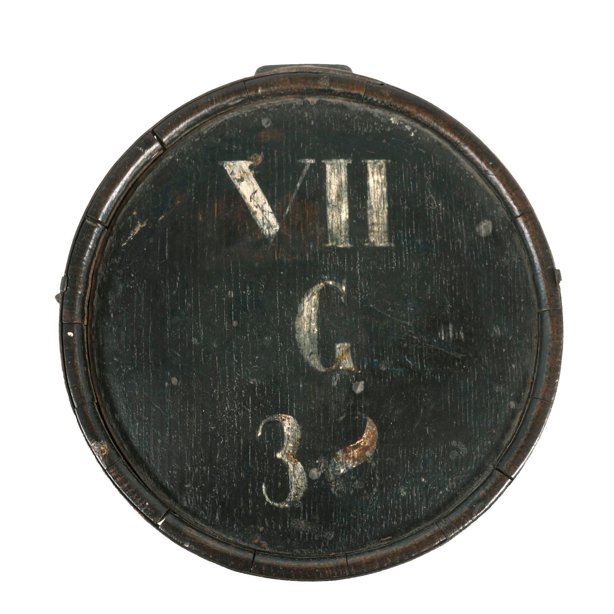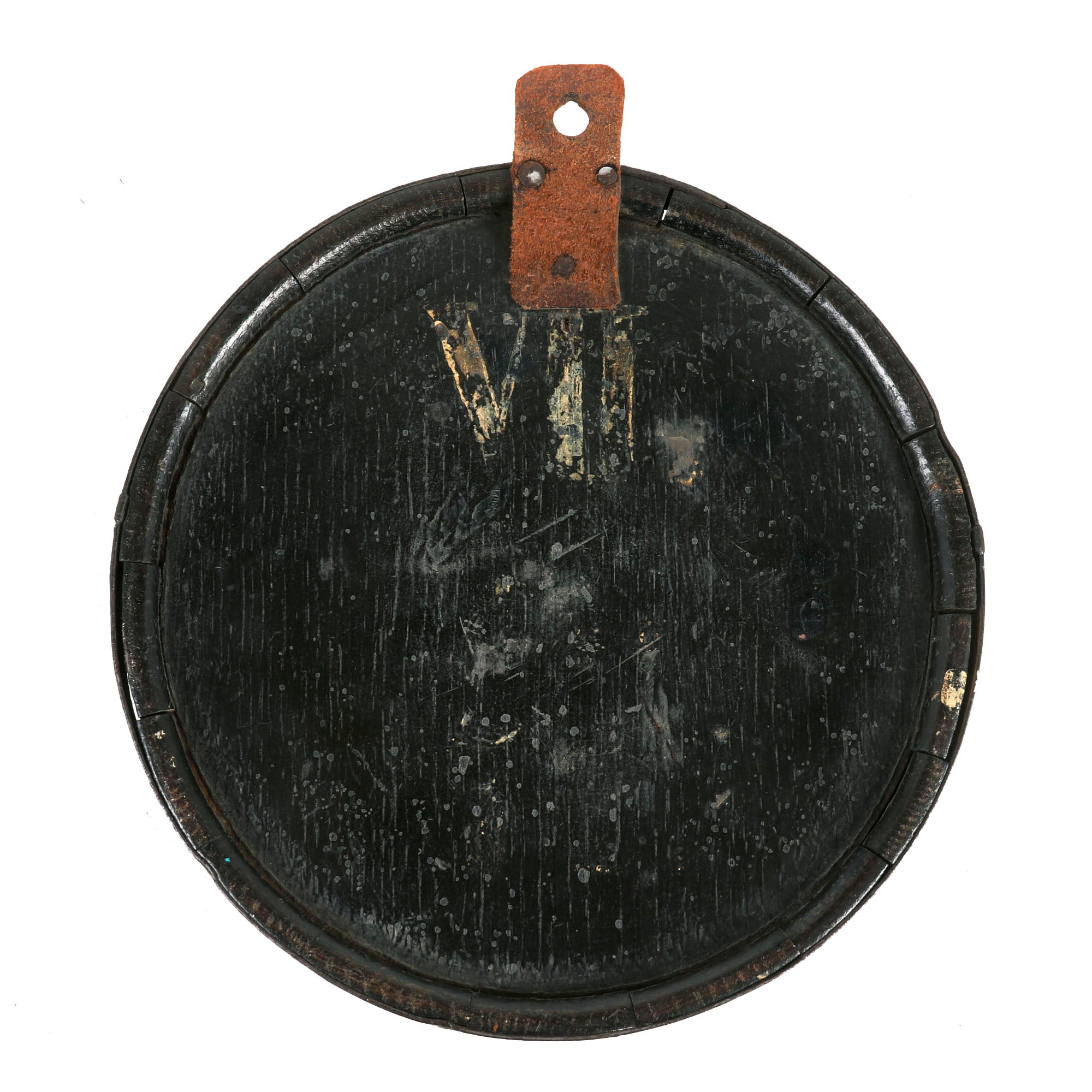The canteen is in fair condition and displays very well, but due to its age and the way that wooden canteens react without water, the individual panels of the canteen’s construction have all shrunken somewhat, and many of them are loose, and will even slide out if it is not handled carefully. Something could likely be done to better affix them, but it is probably best to display it upright and leave it as is. The canteen displays very beautifully and even retains its original leather strap meant to hang the canteen off of.