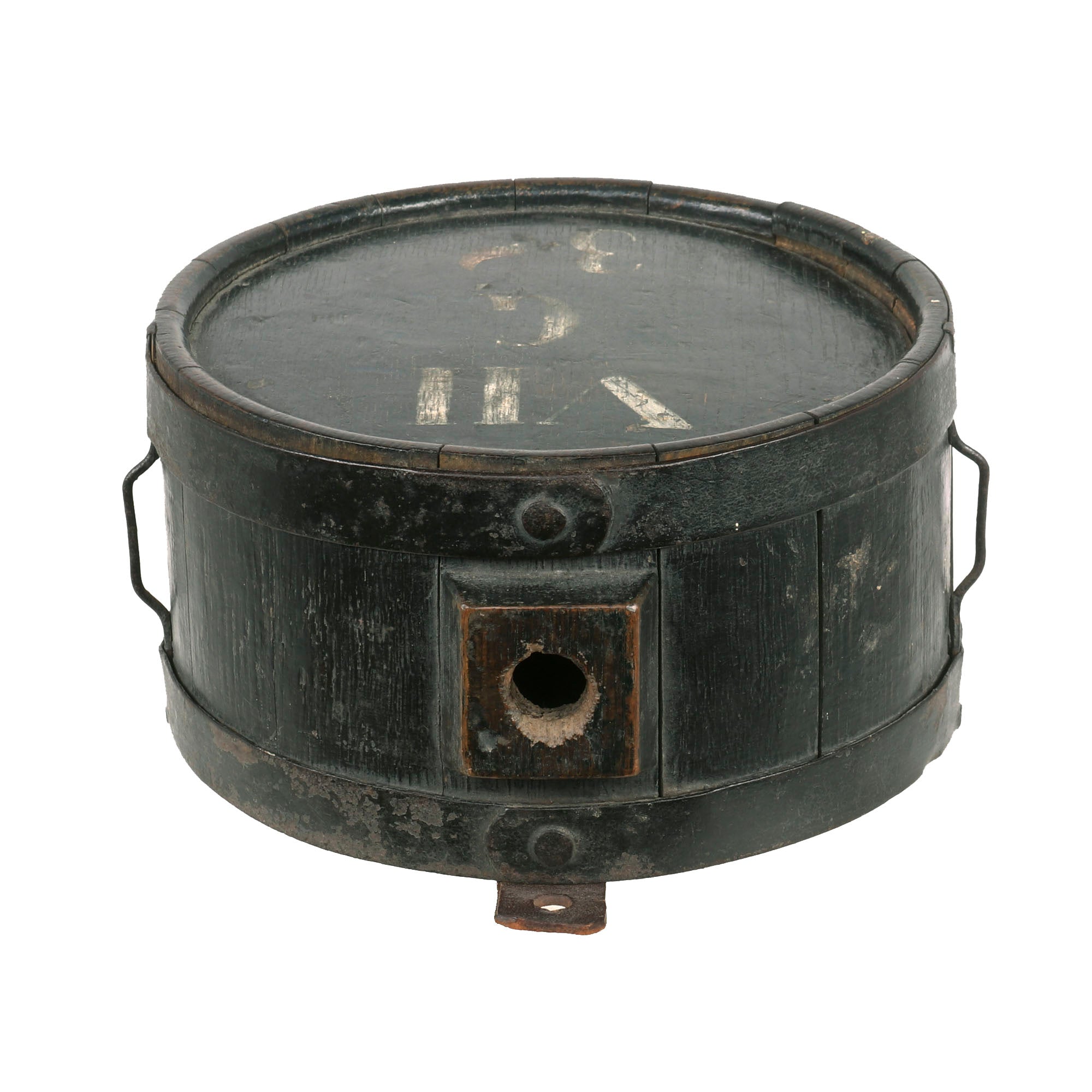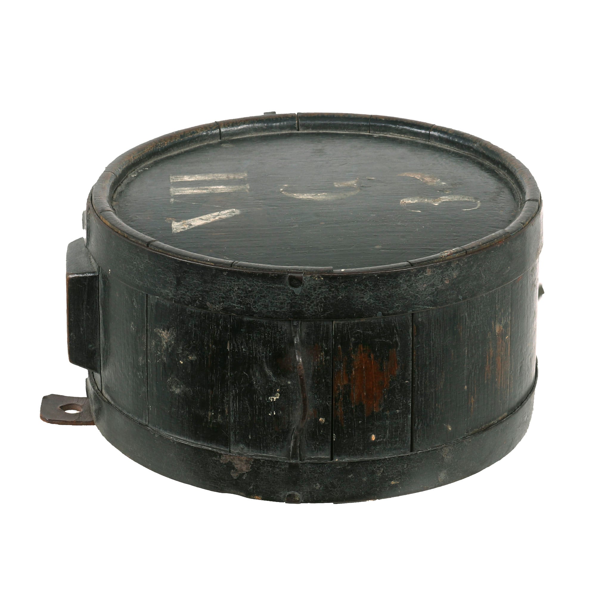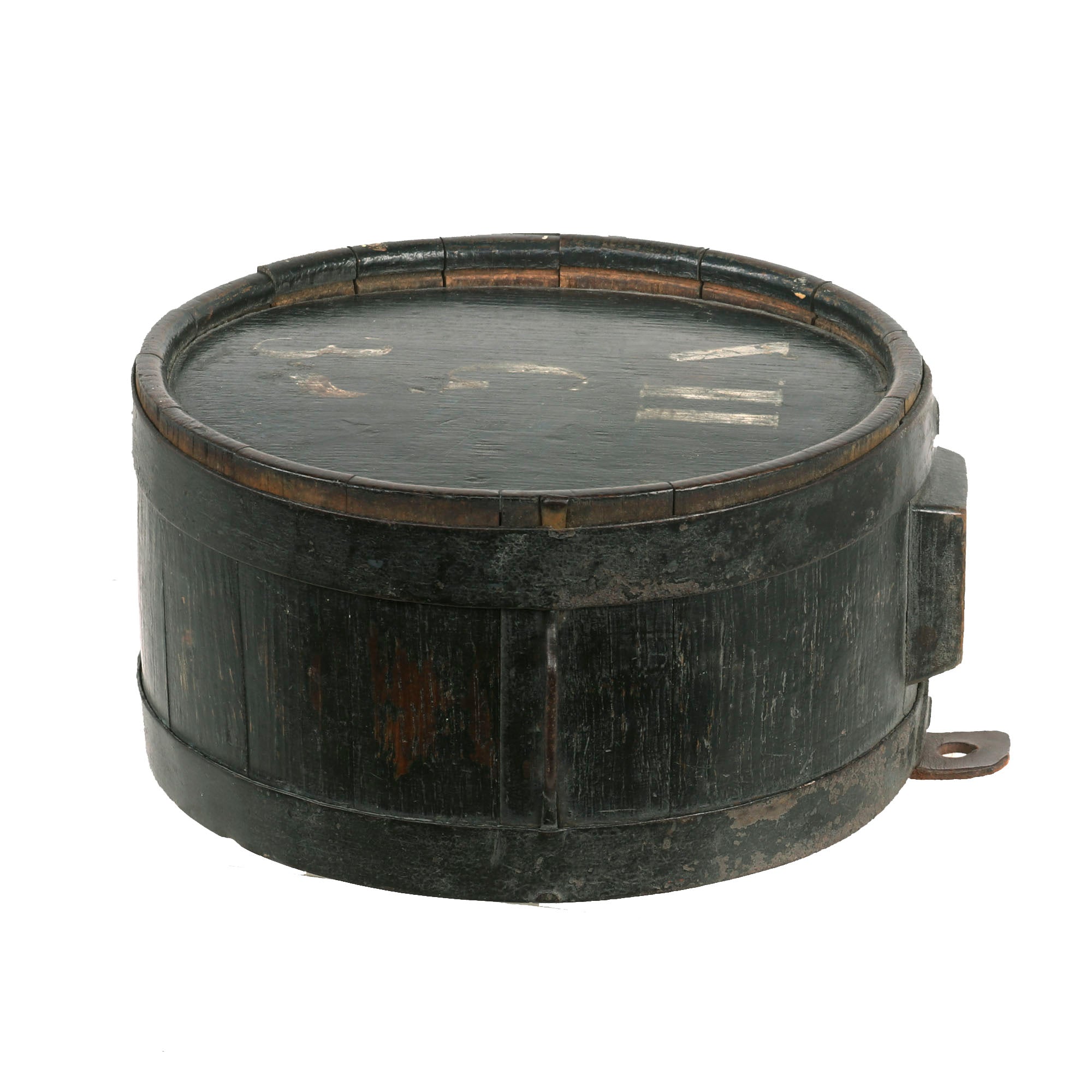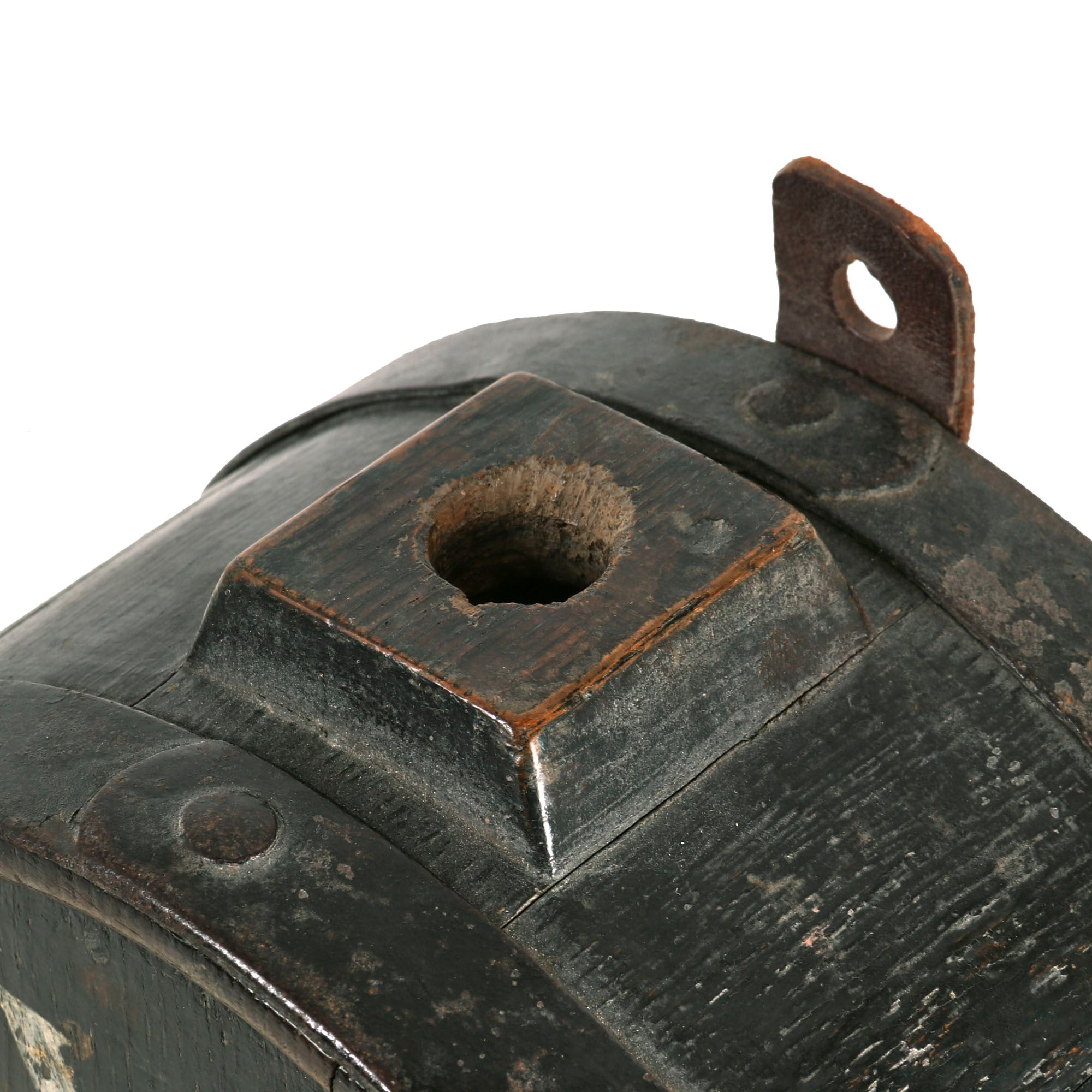 Original Item. One-of-a-Kind. Prior to 1810, a British artisan-inventory had developed a system of machinery by which he could cut and form all of the component pieces of wood, as well as assemble them into finished canteens, thereby cutting the time and expense of hand-coopering, as such had previously been made. The mass-produced water bottles were made with oak faces or sides, with flat staves cut and inlet with grooves, allowing them to function similarly to the shaped staves made by traditional coopering, all held together by iron bands. This new methodology was a boon to the Quartermaster General, who needed to acquire tens of thousands of water bottles on an annual basis to equip British and allied troops in the field.