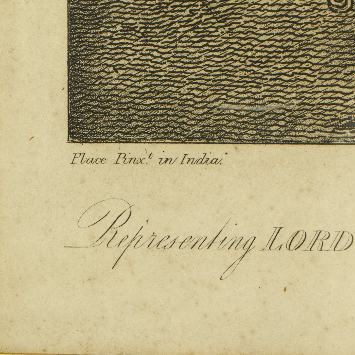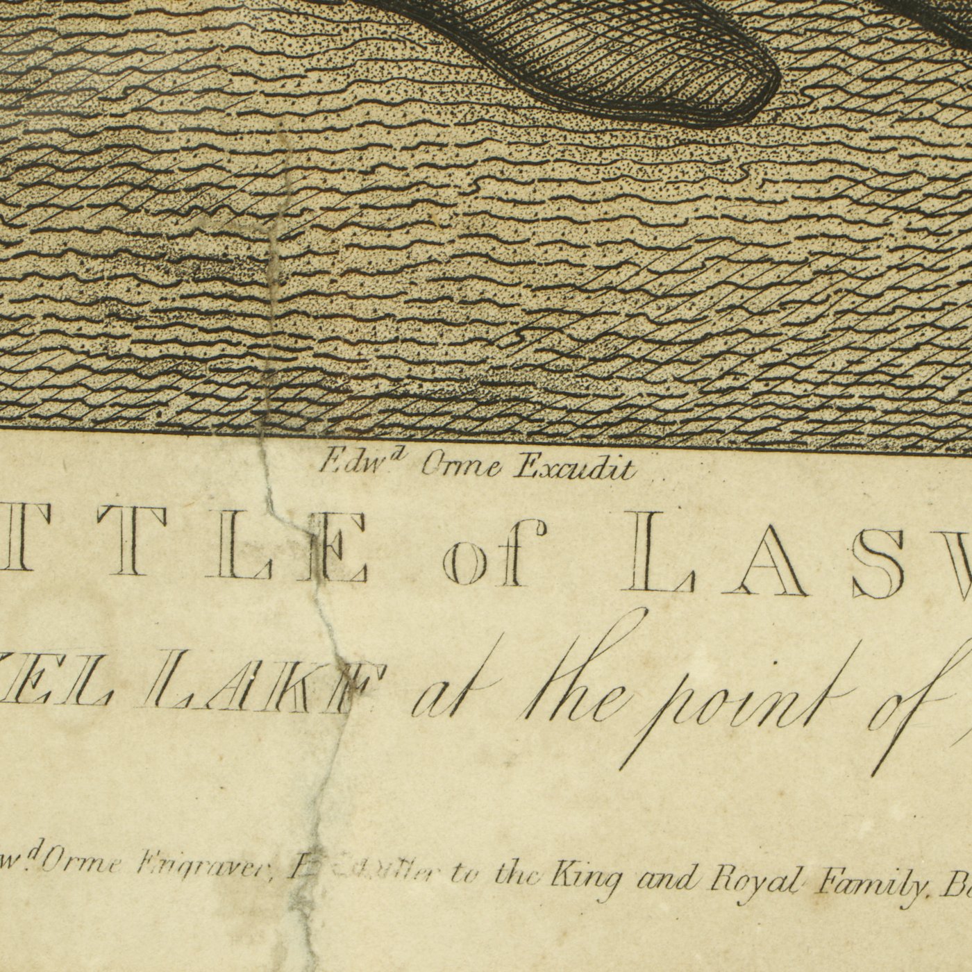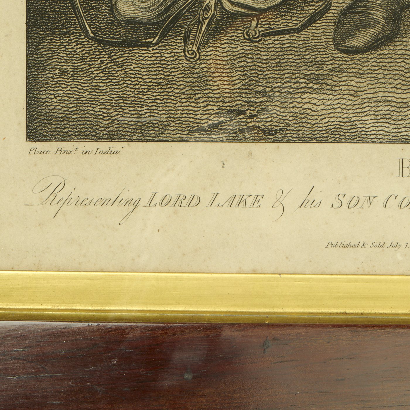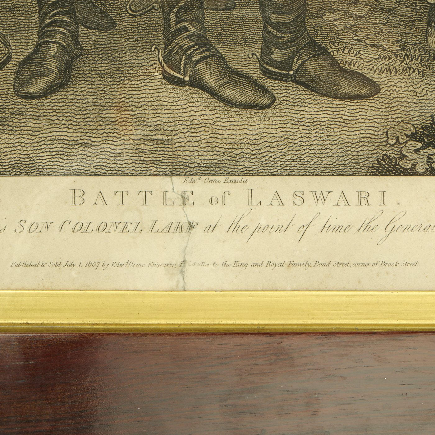 Original Item. One of a Kind. This is a fantastic original British corrected proof of an etching dated 1807 of an incident that occurred during the Battle of Laswari. This famous battle took place in 1803, and the etching depicts General Lord Gerard Lake, with his son Colonel Lake, at the point in the battle where the General had his horse shot from beneath him. This is stated in the proof itself under the etching.
