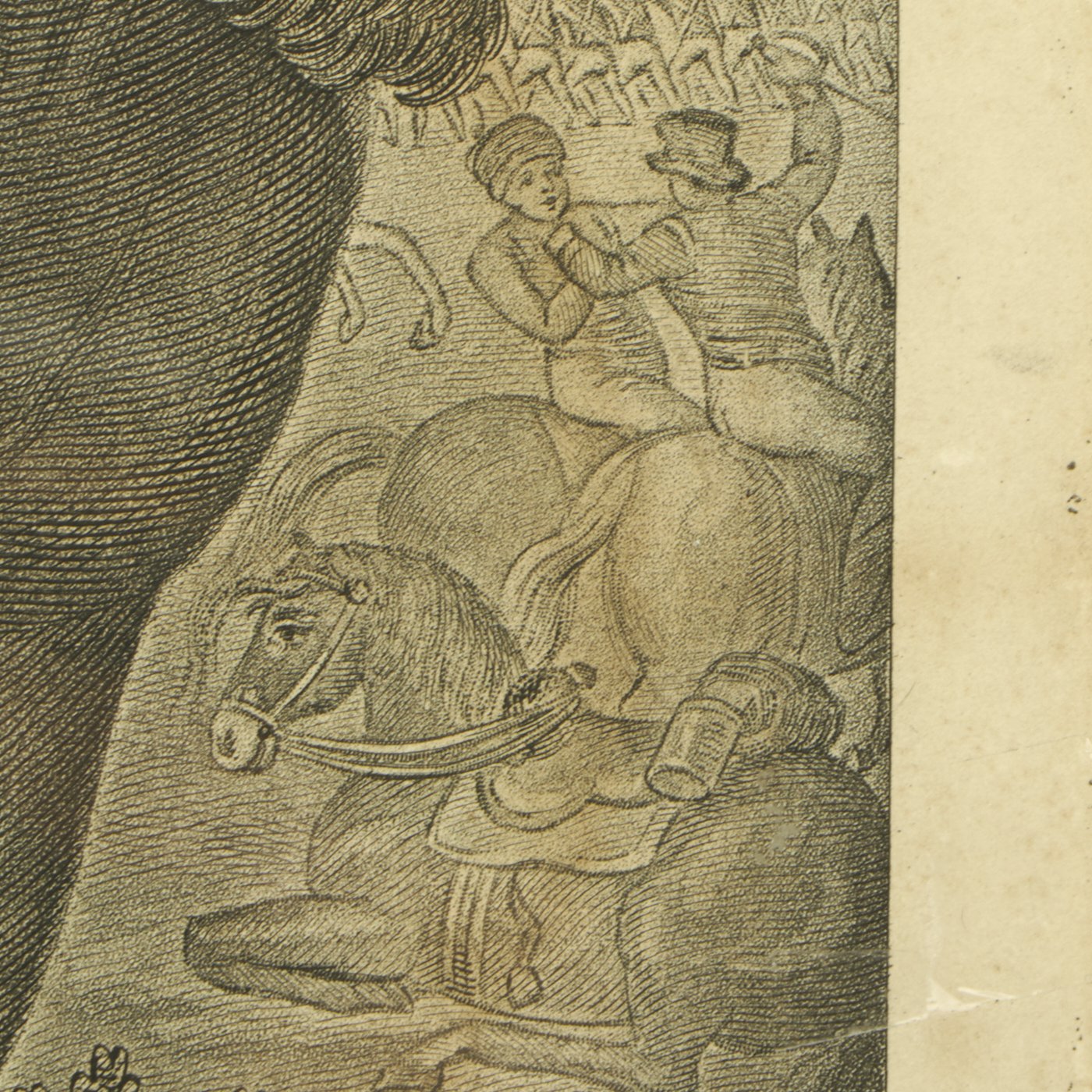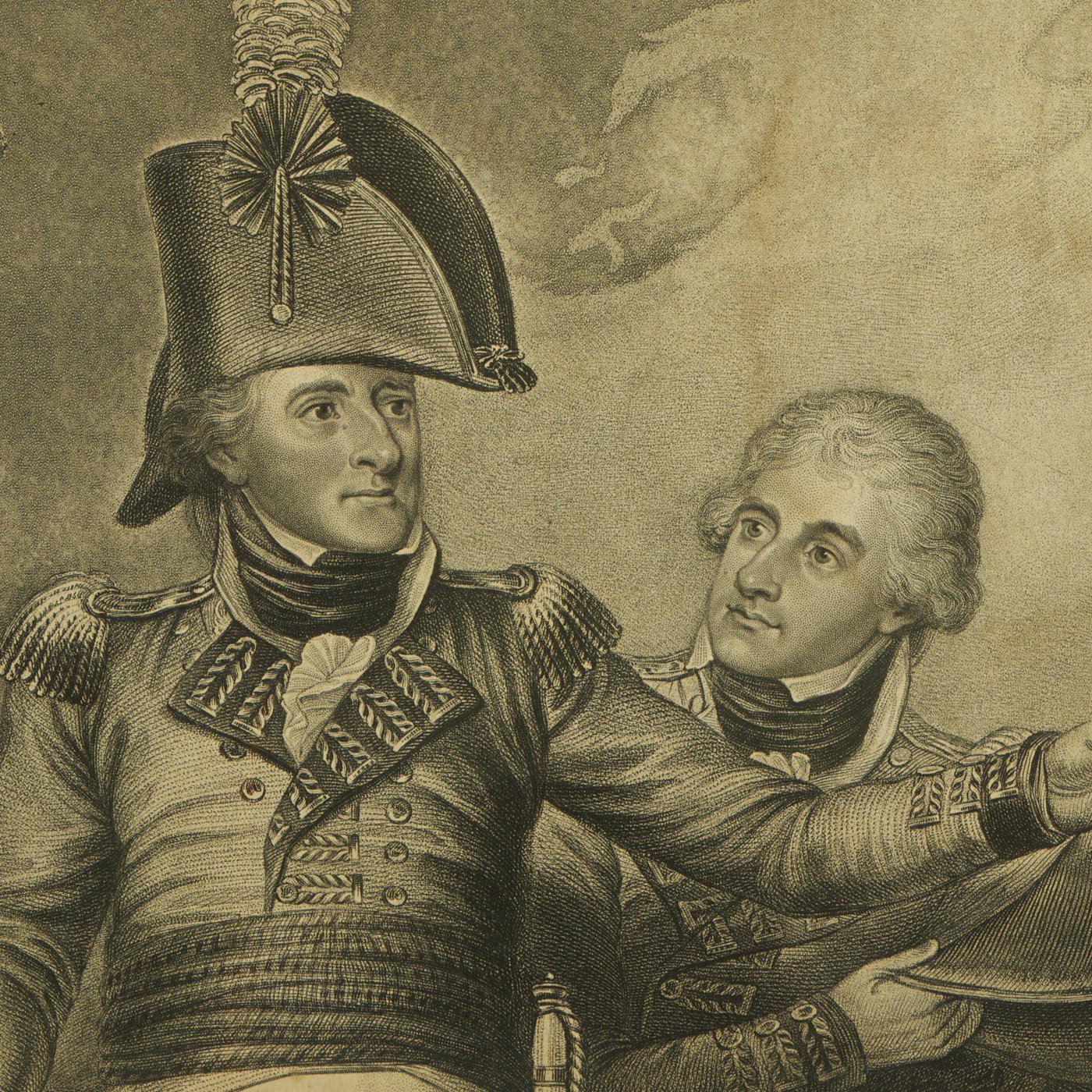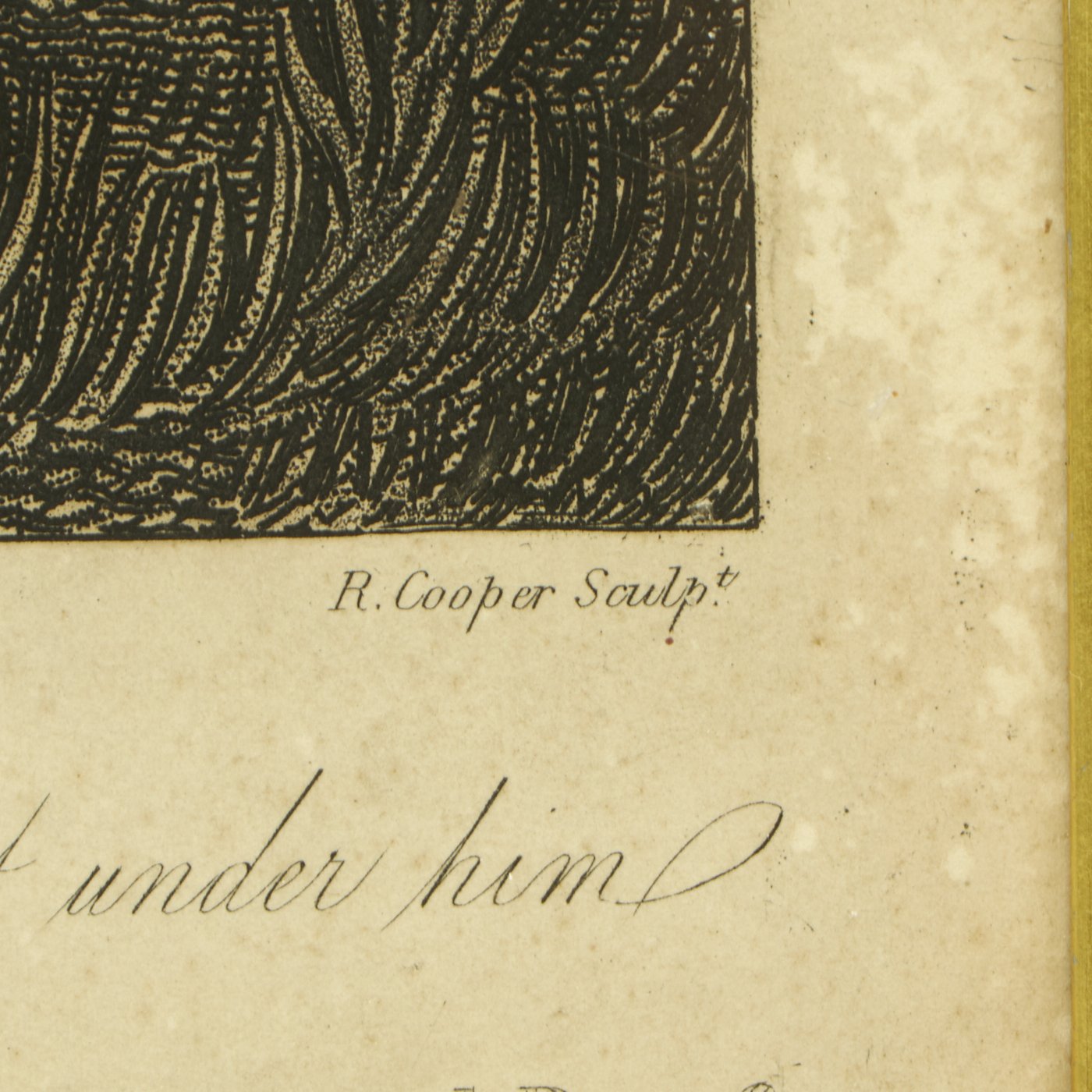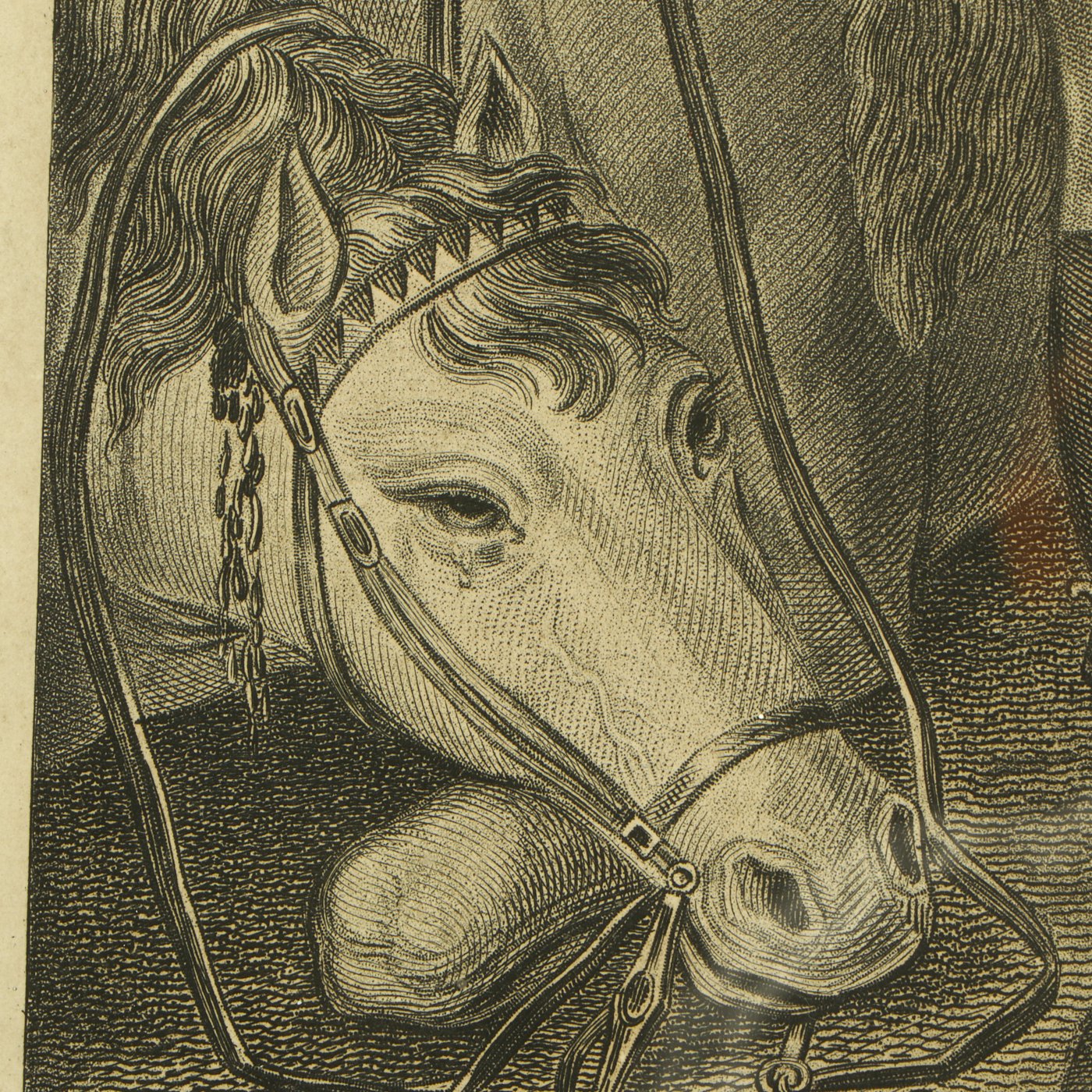 Original Item. One of a Kind. This is a fantastic original British corrected proof of an etching dated 1807 of an incident that occurred during the Battle of Laswari. This famous battle took place in 1803, and the etching depicts General Lord Gerard Lake, with his son Colonel Lake, at the point in the battle where the General had his horse shot from beneath him. This is stated in the proof itself under the etching.