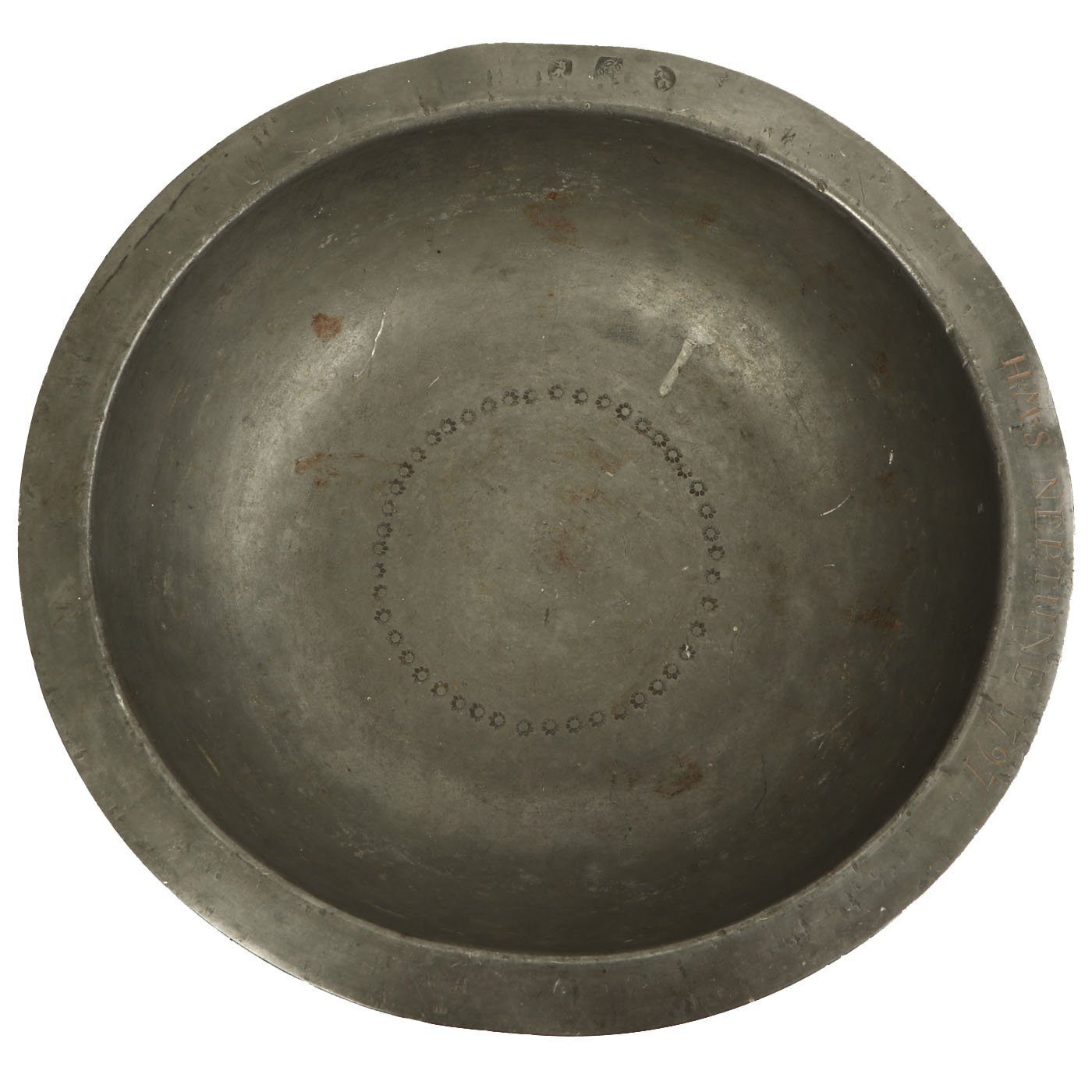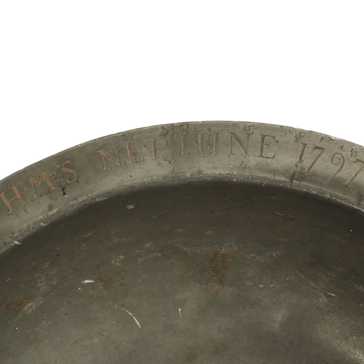 Original Item: Only One Available. This is a very nice large pewter bowl, measuring 10 3/4" in diameter, with a depth of about 2 1/2 inches. It is clearly marked H-M-S NEPTUNE 1797 on the top, indicating service on this vessel during the Napoleonic Wars. This is quite a large bowl, and may have been a serving bow, as it is far to large for a single person.