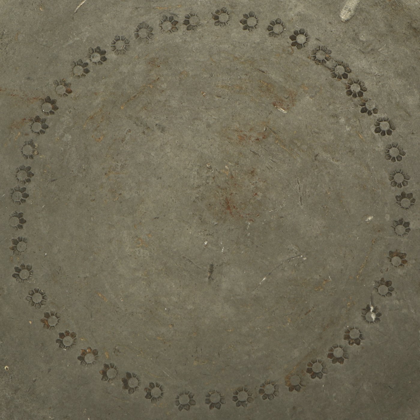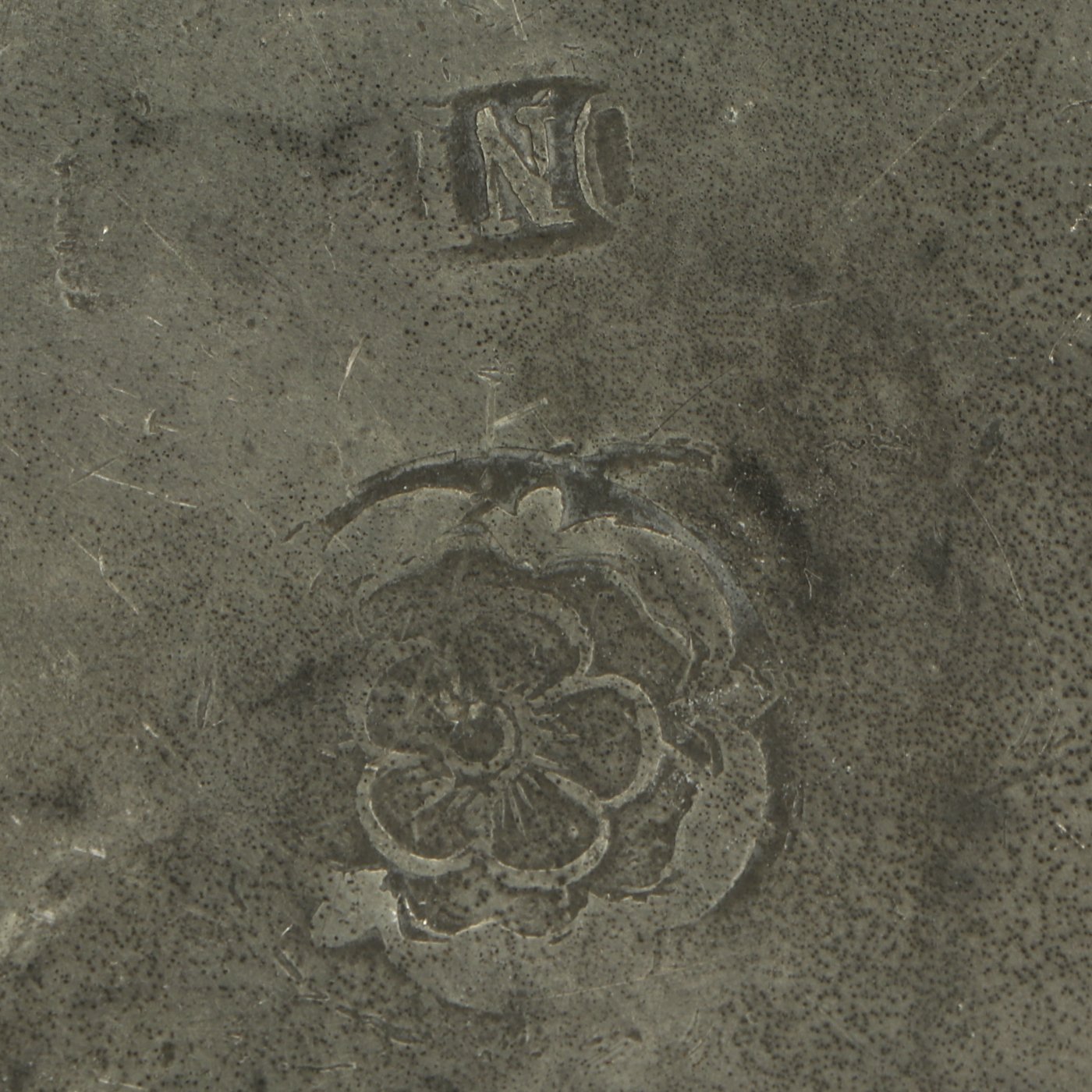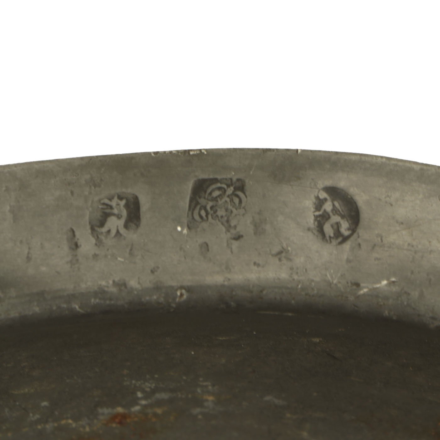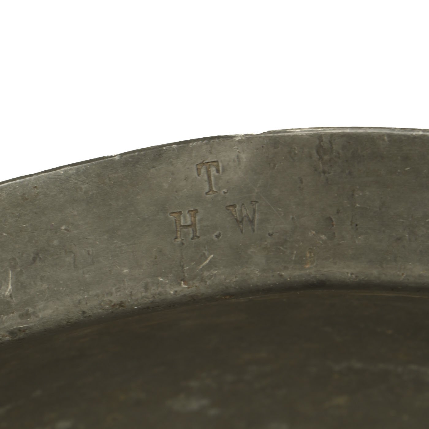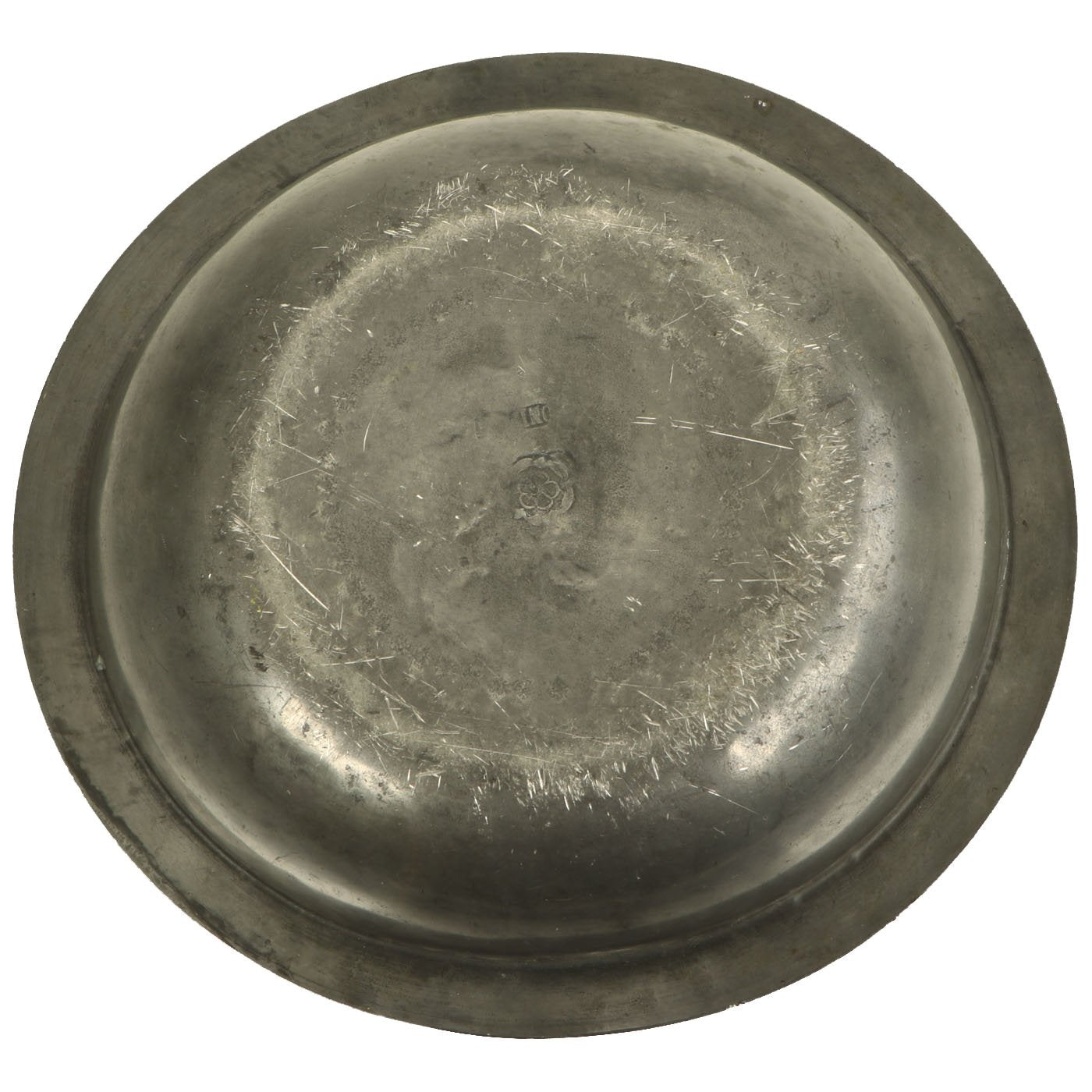 The top of the dish is also marked with Pewter Hallmarks, which look to be a "Dragon", a "Rose", and a "seated person". There also is a larger "Rose" on the back over a partly struck LONDON. These markings definitely are from a London manufacturer, as the Rose is the pewterer mark for London. Unfortunately the system for the marks on pewter is much more complex than those on silver. We searched but were unable to identify the maker. There are the initials T. / H. W. on the rim as well, however these could be maker as well as owner marks.