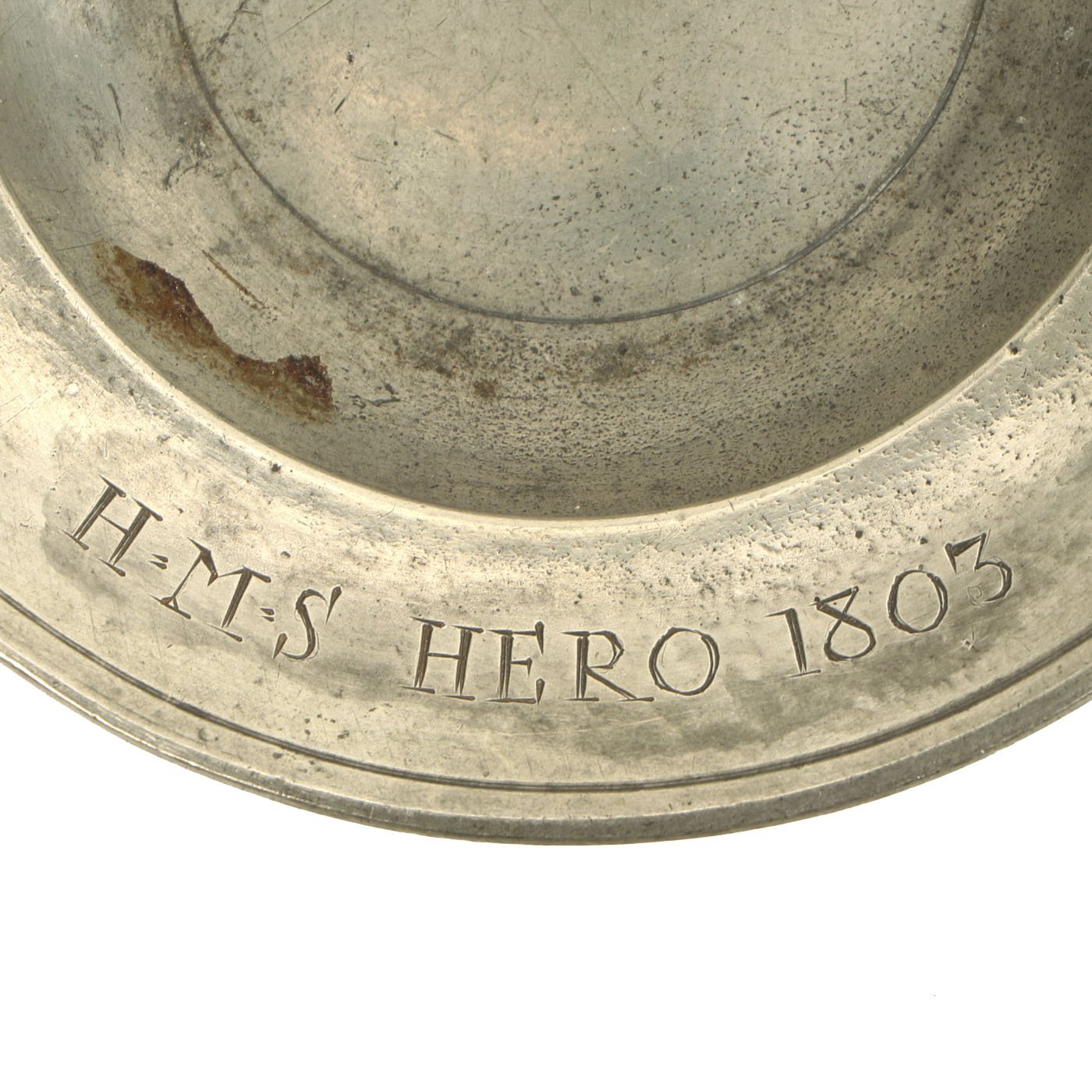 Original Item: Only One Available. This is a very nice pewter small dish, or possibly a saucer, measuring 4 1/2" in diameter. It is clearly marked H-M-S HERO 1803 on the top, indicating service on this vessel during the Napoleonic Wars. Given the extremely small bowl portion of the dish, we assume it was for small portions or sides, or possibly just a saucer to go under a drink.