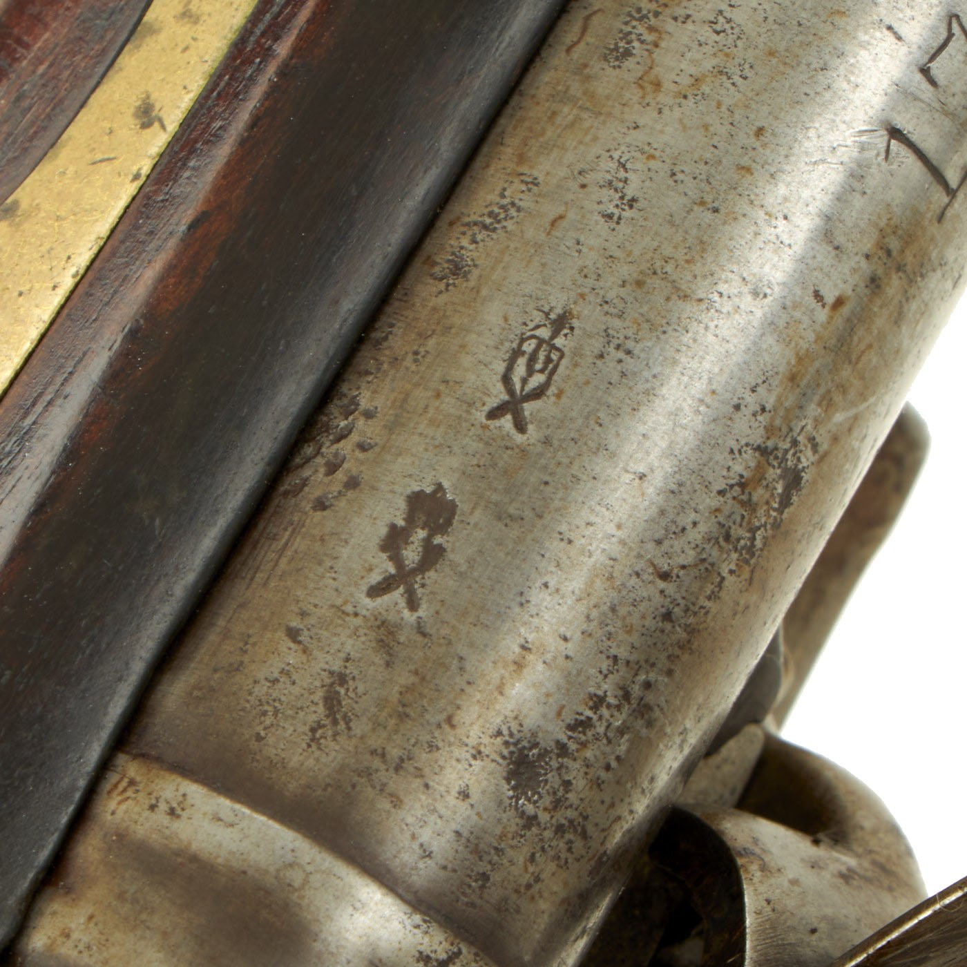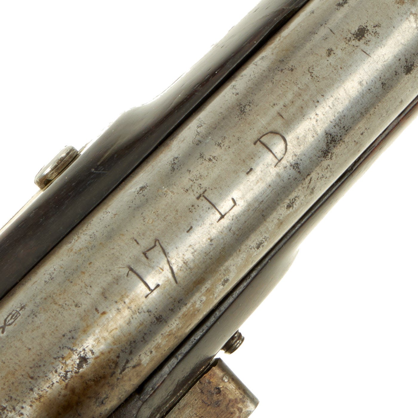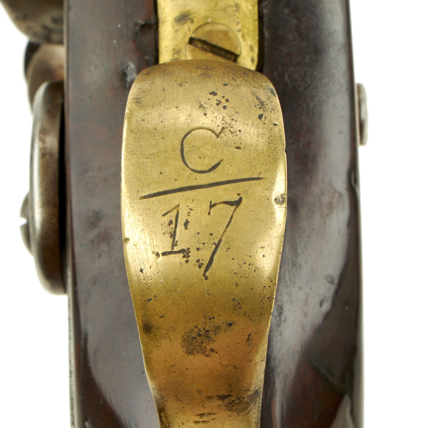 The pistol is a standard full stocked flintlock pistol, used by British Light Dragoons across the empire. The Lock Plate is marked (CROWN) / G.R. under the pan, with TOWER across the tail, indicating production at the Tower armory for military use. There is the correct "Lock Viewer's Mark" under the pan, and the barrel bears British proofs on the left hand side. The top of the barrel is marked 17 - L - D, indicating it came from the 17th Light Dragoon Regiment. It is also marked C / 17 on the trigger guard, for "C" company, 17th Man. There is an additional marking E / 54 on the butt cap, so it was reissued at some time during its regimental service.