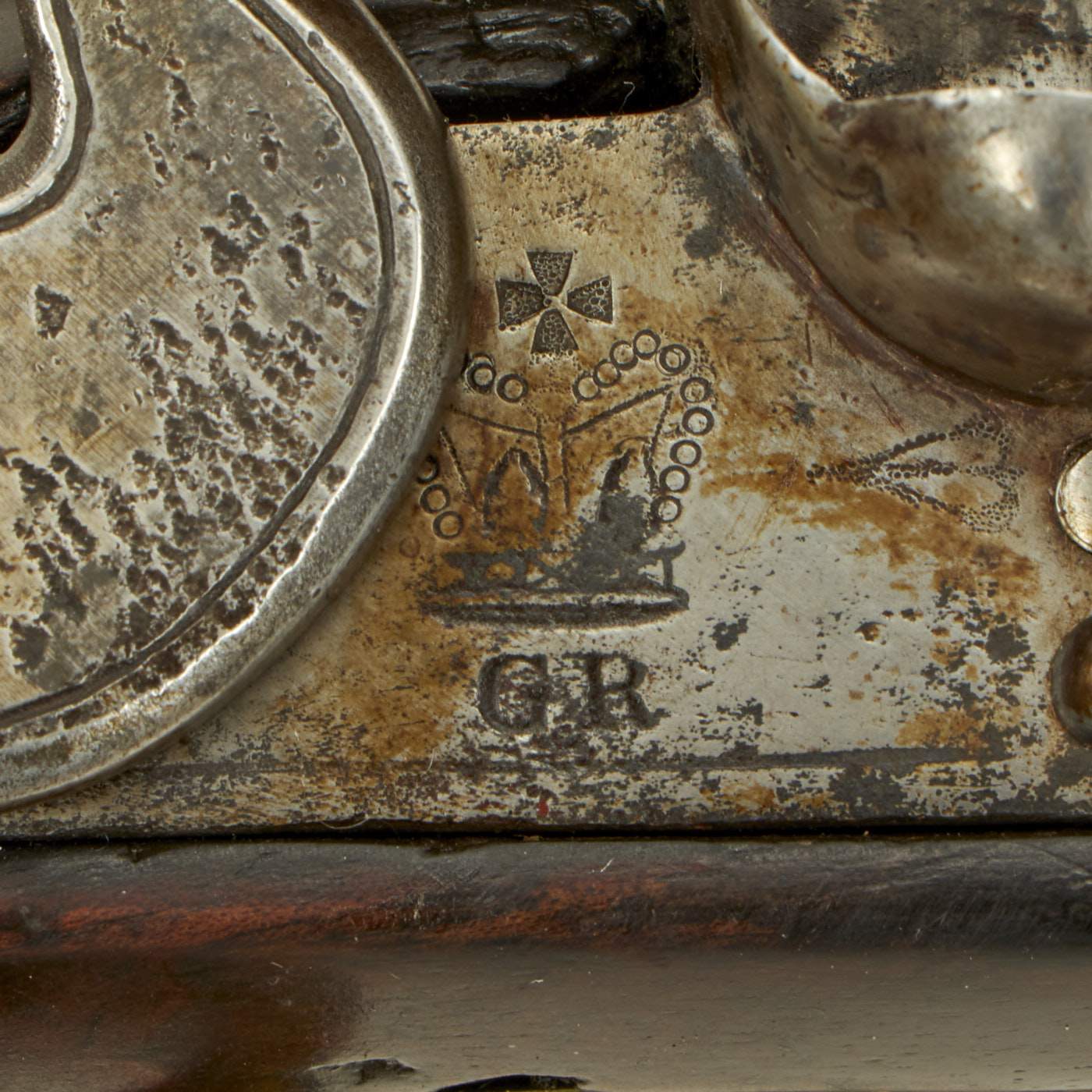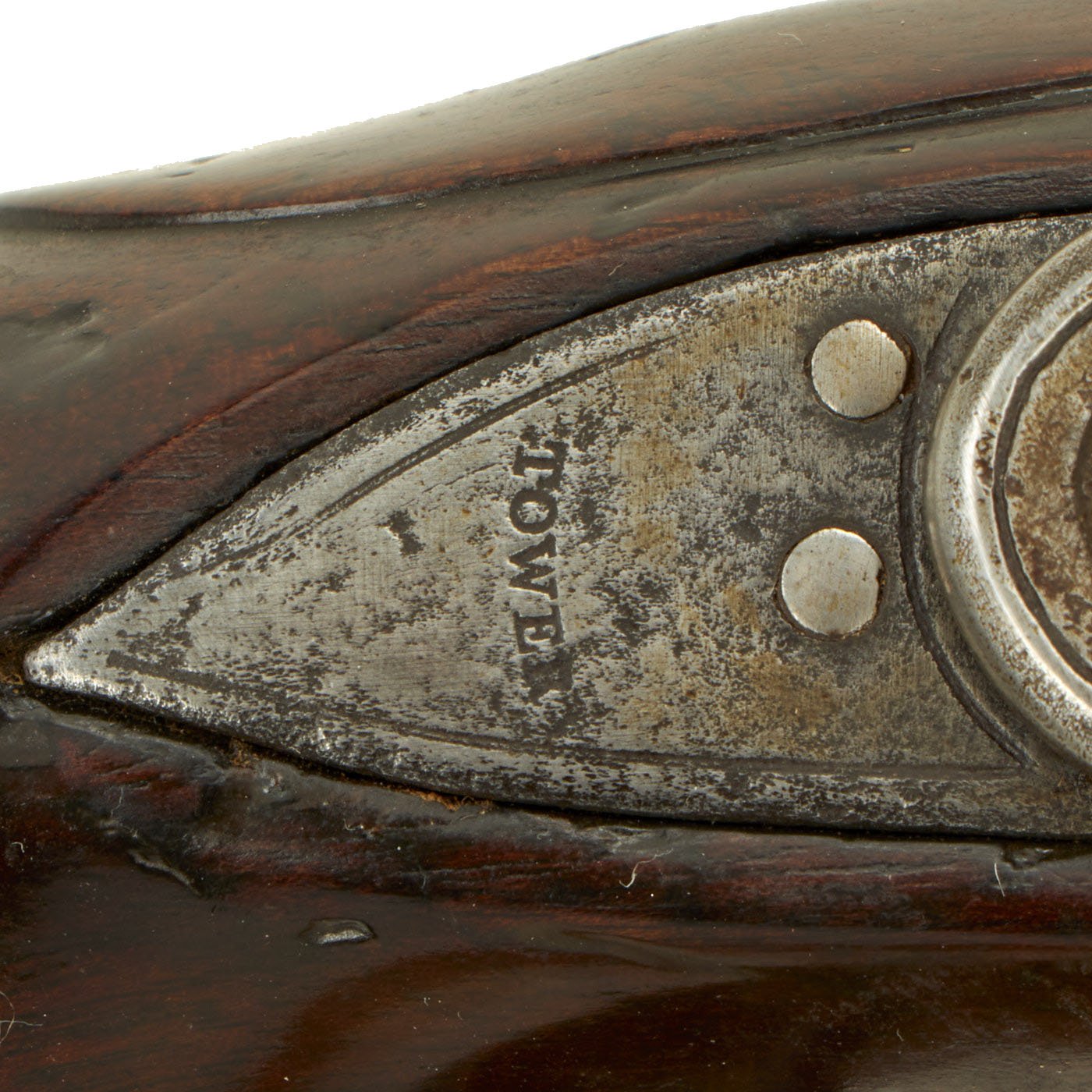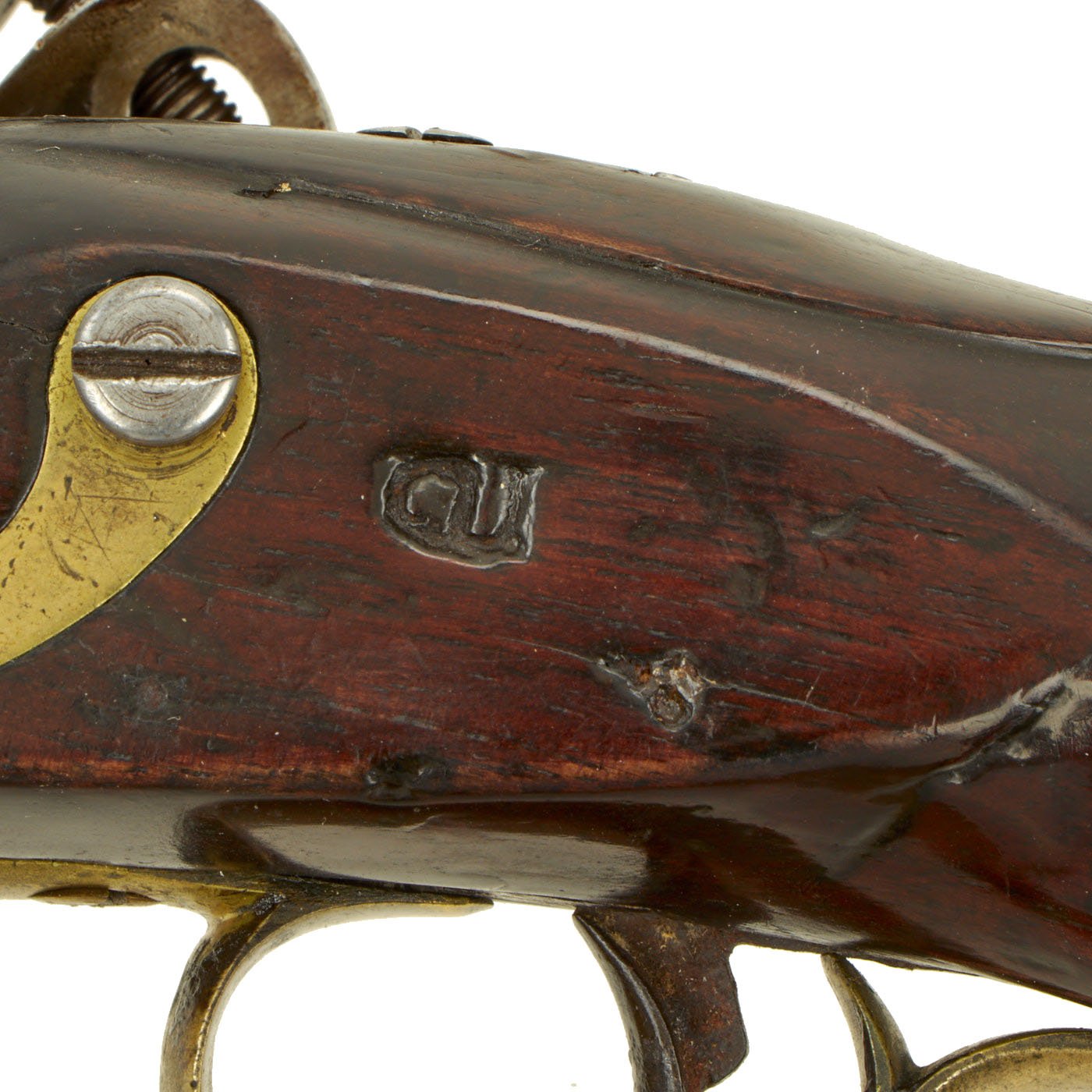 The pistol is a standard full stocked flintlock pistol, used by British Light Dragoons across the empire. The Lock Plate is marked (CROWN) / G.R. under the pan, with TOWER across the tail, indicating production at the Tower armory for military use. There is the correct "Lock Viewer's Mark" under the pan, and the barrel bears British proofs on the left hand side. The top of the barrel is marked 17 - L - D, indicating it came from the 17th Light Dragoon Regiment. It is also marked C / 17 on the trigger guard, for "C" company, 17th Man. There is an additional marking E / 54 on the butt cap, so it was reissued at some time during its regimental service.