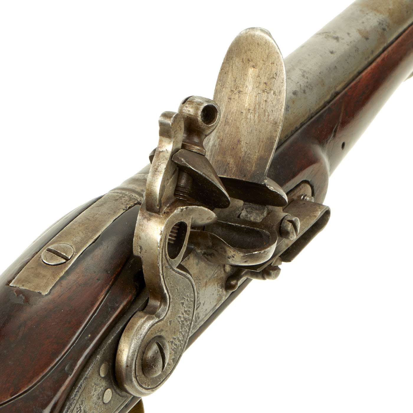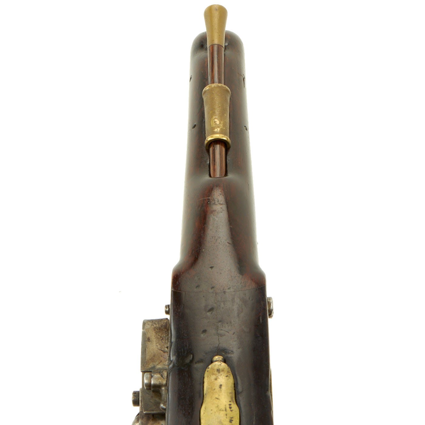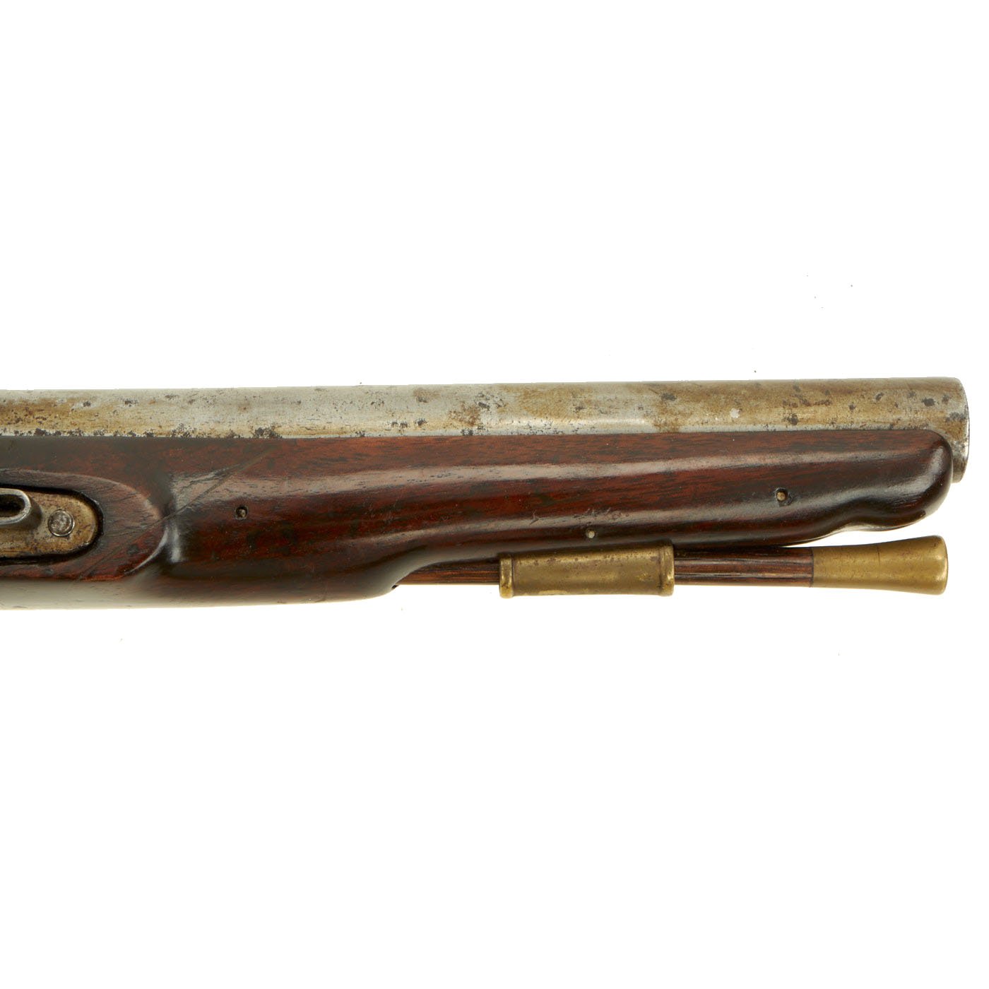 The ramrod is brass mounted walnut and not of the 'swivel" type later introduced as the New Land Pattern, which was based on East India Company innovations. The pistol has a 9" long .69" bore barrel, and the stock looks just lovely. It has however been repaired, and the front 6 inches or so was replaced during service, with a diagonal joint in front of the lock, which helps increase the surface area and strength of the joint. The lock is in good shape, an functional, though with a hard trigger pull it will fire at half cock.