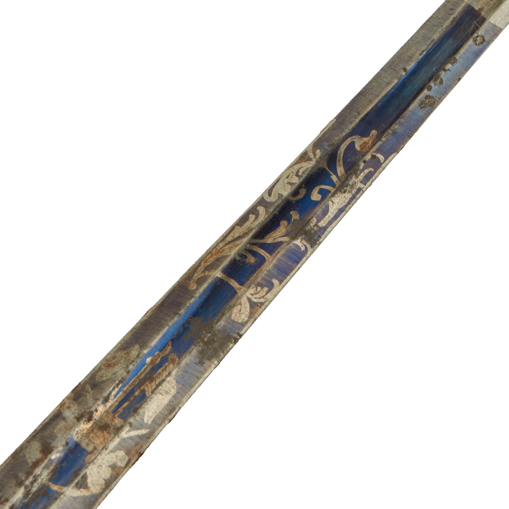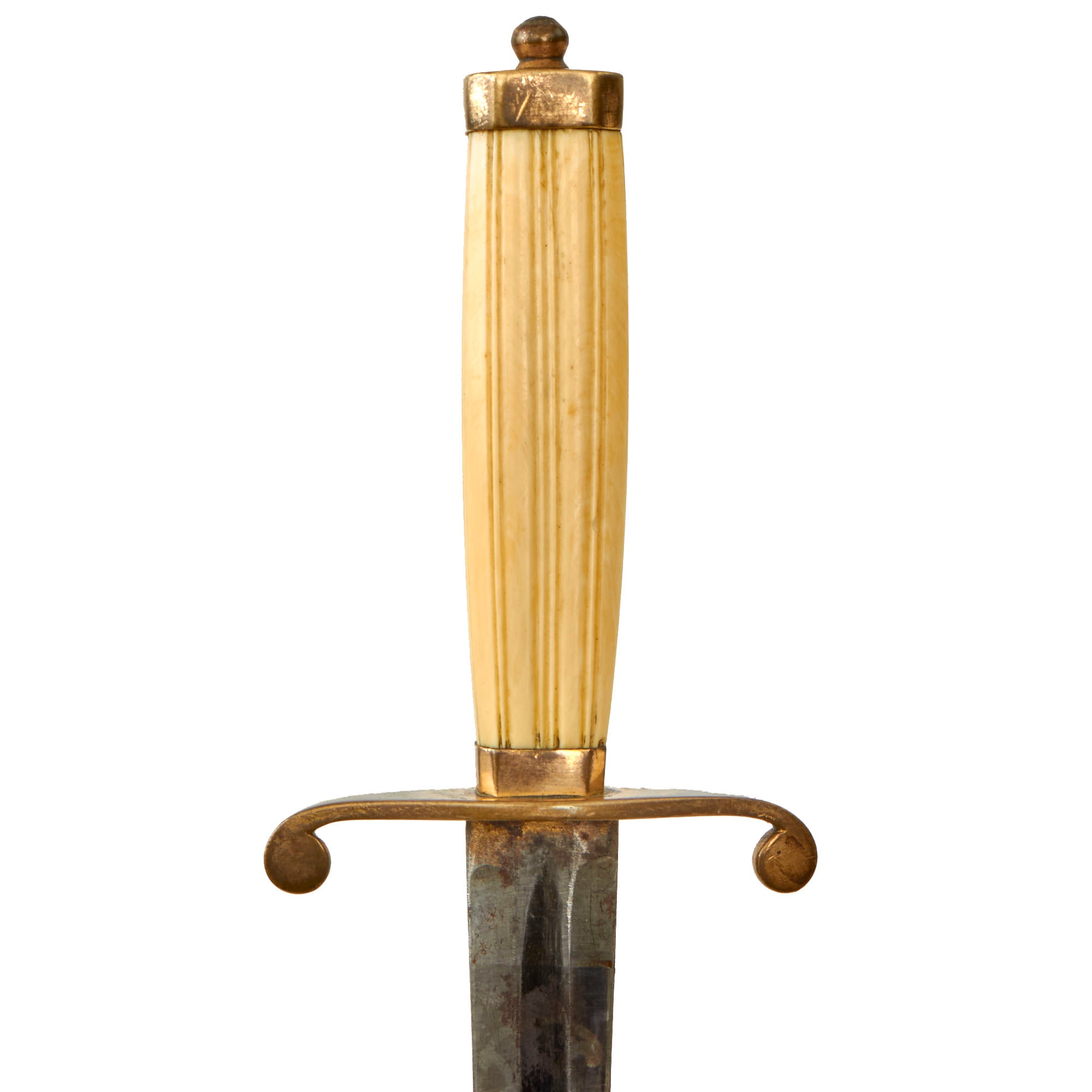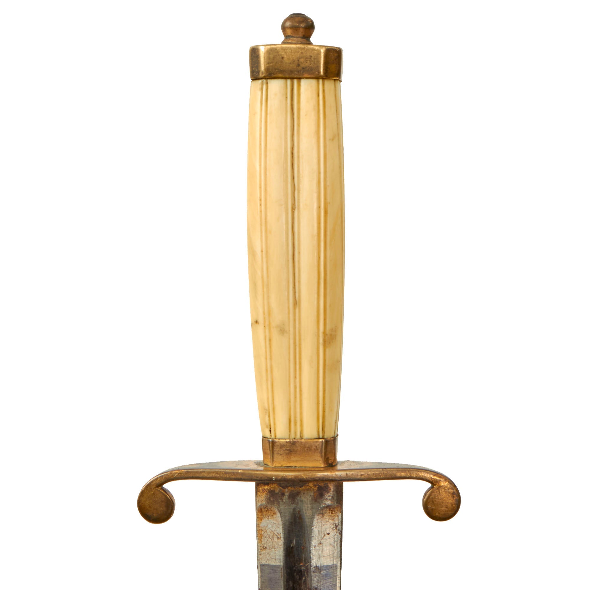 The blade of this example measures roughly 16½”, with an overall length of 21”. The blade has some beautiful bluing halfway up the blade with some great floral design. The crossguard is in good shape. The grip of the dirk is ivory/bone which has aged tremendously, and the blade and grip are still tight to the hilt. The hilt was originally gilt, and still retains roughly 60% of its original finish. There is a small FT hallmark on the crossguard.