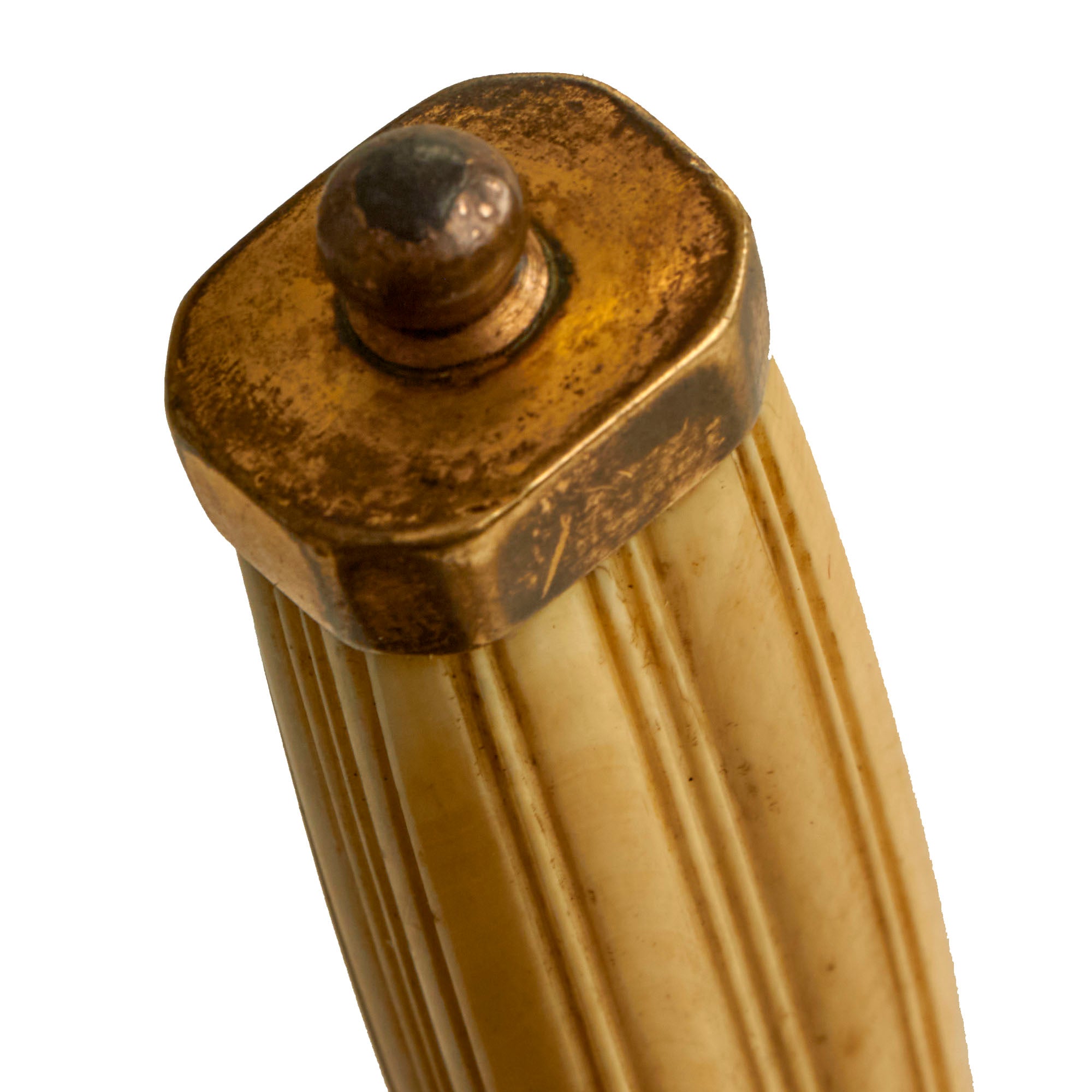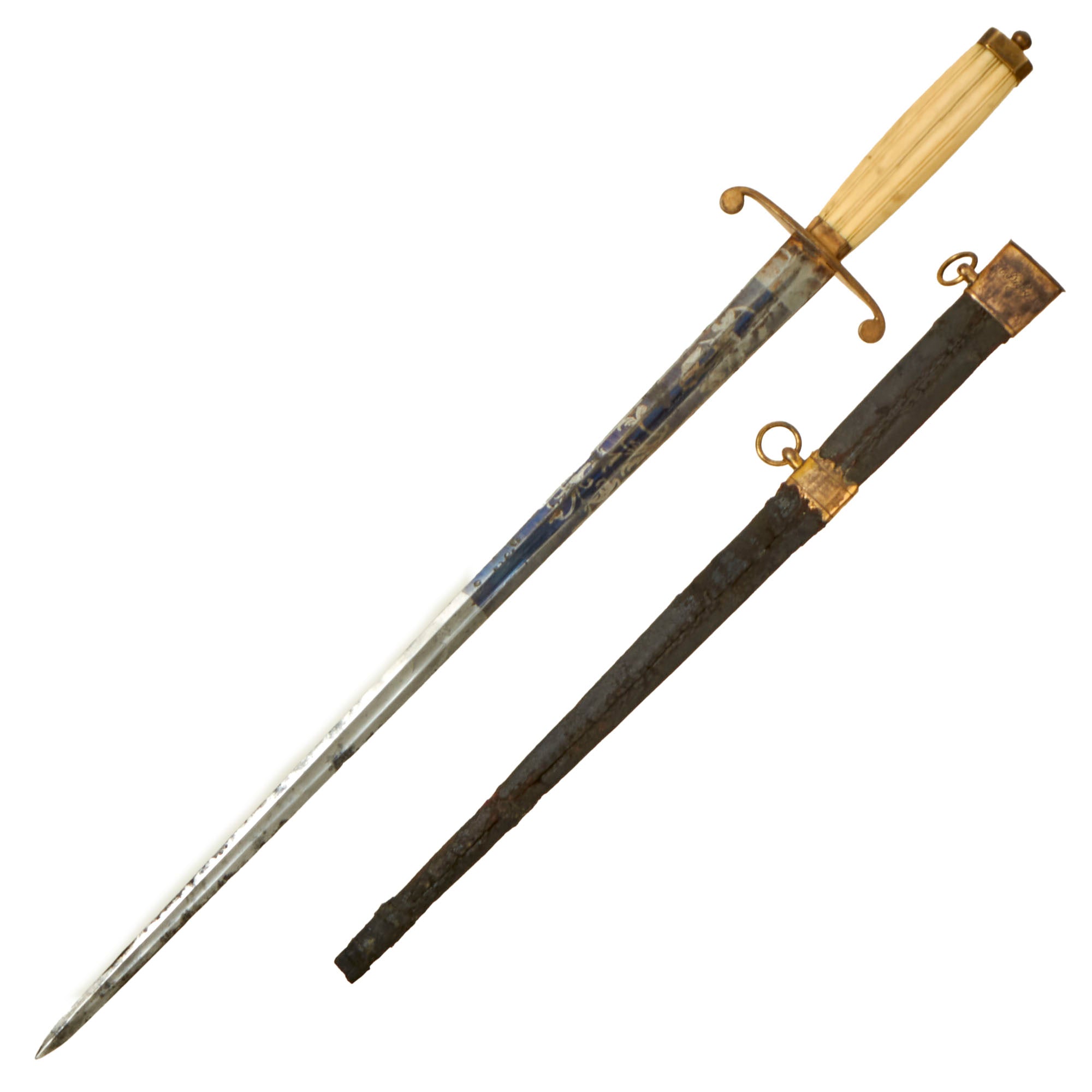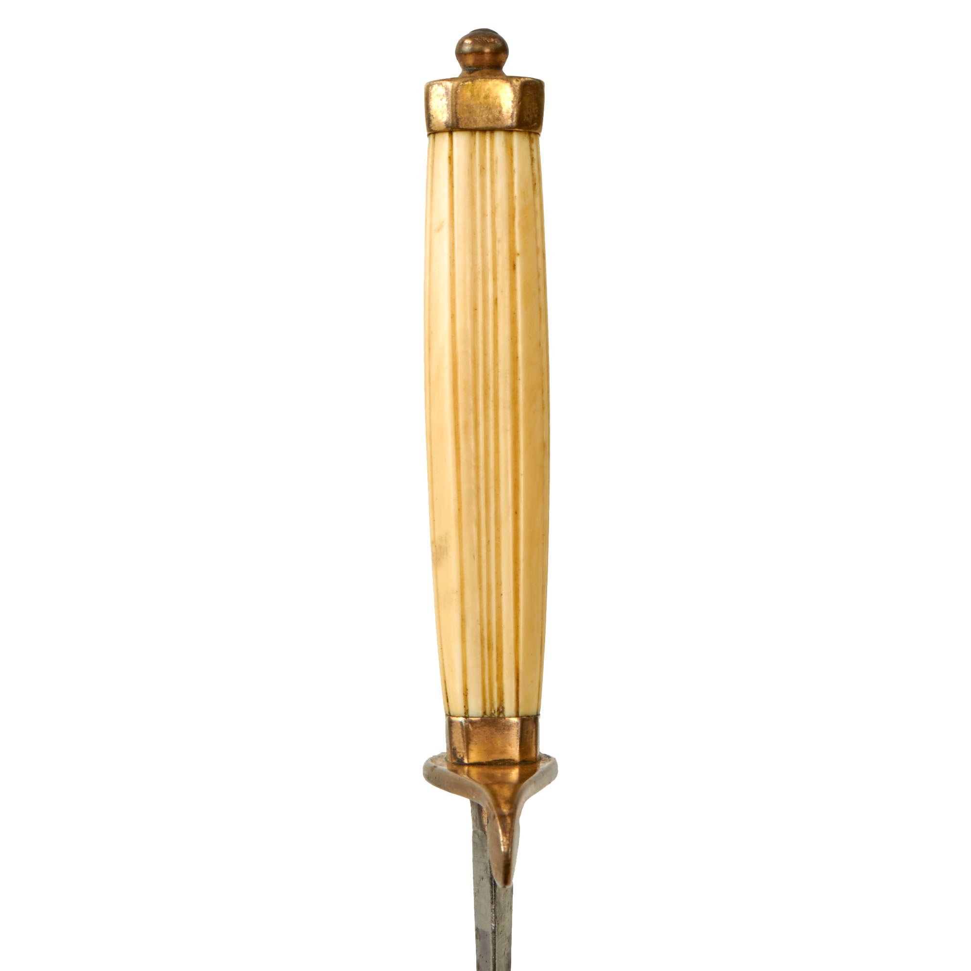 The blade of this example measures roughly 16½”, with an overall length of 21”. The blade has some beautiful bluing halfway up the blade with some great floral design. The crossguard is in good shape. The grip of the dirk is ivory/bone which has aged tremendously, and the blade and grip are still tight to the hilt. The hilt was originally gilt, and still retains roughly 60% of its original finish. There is a small FT hallmark on the crossguard.