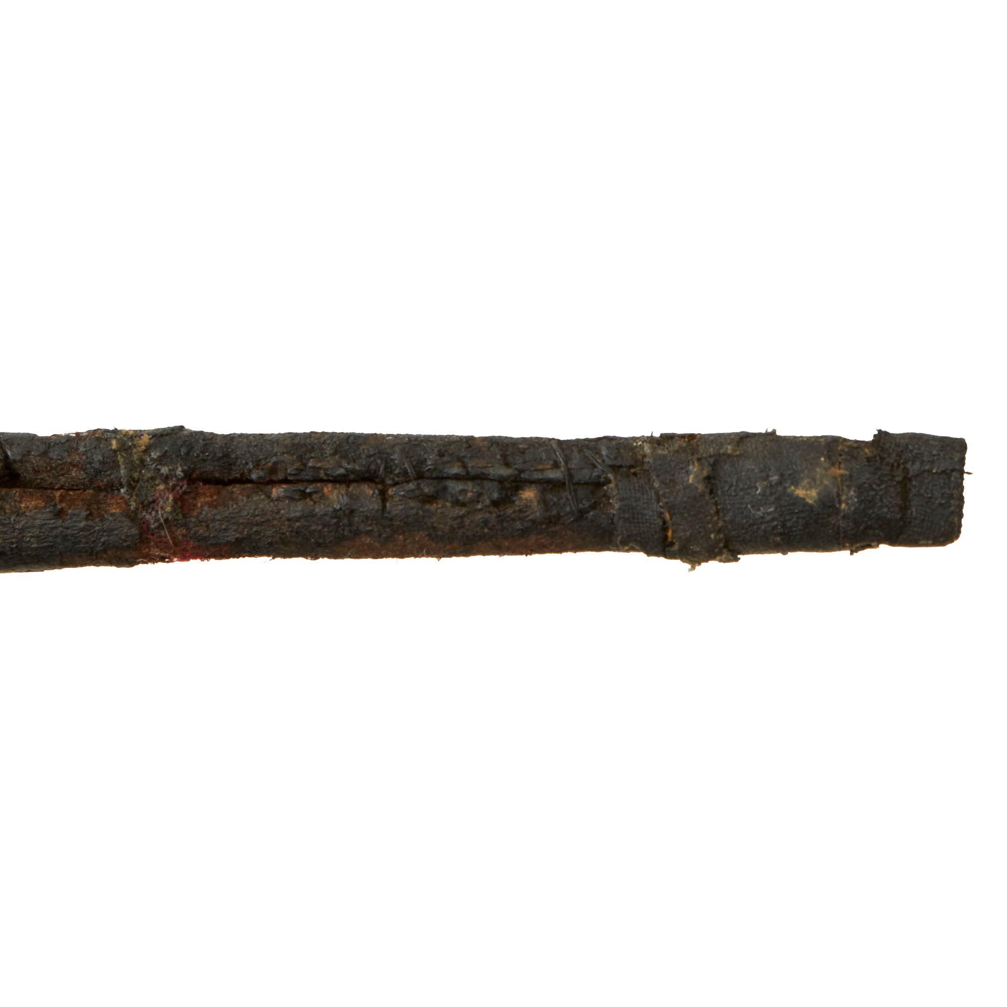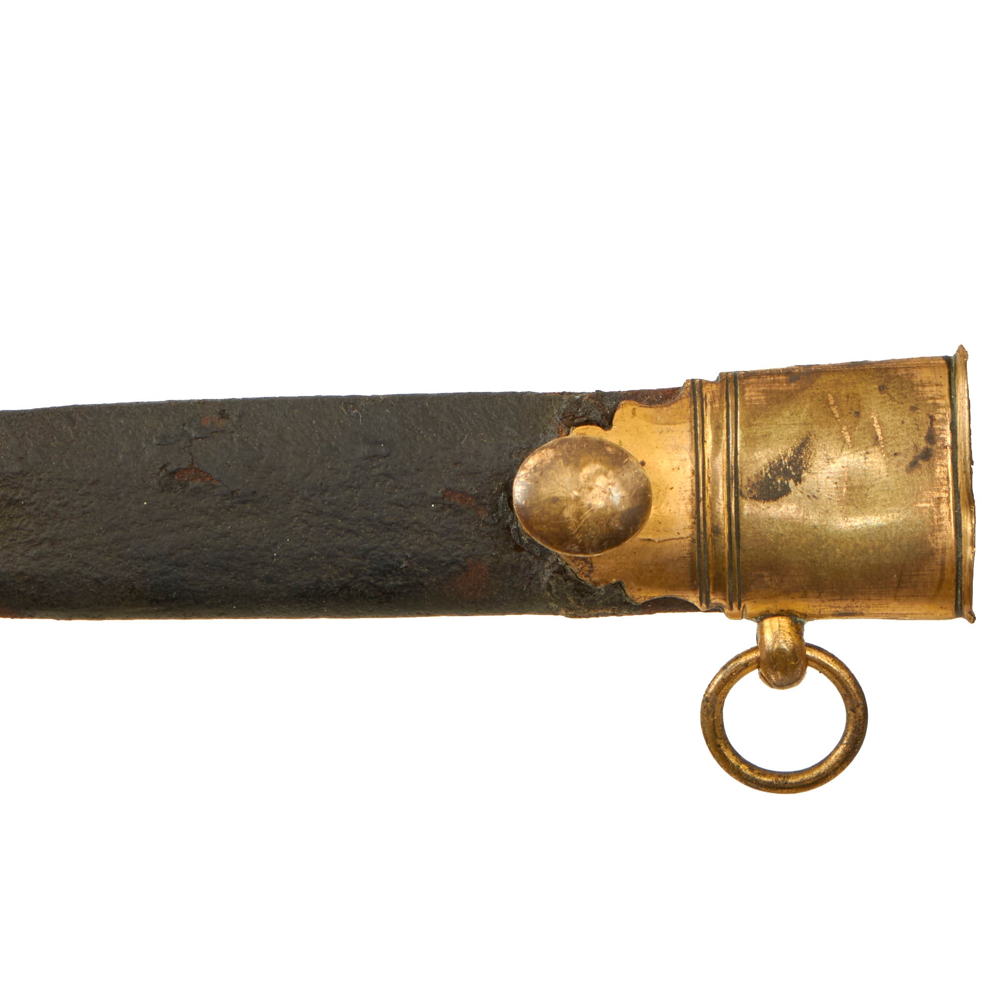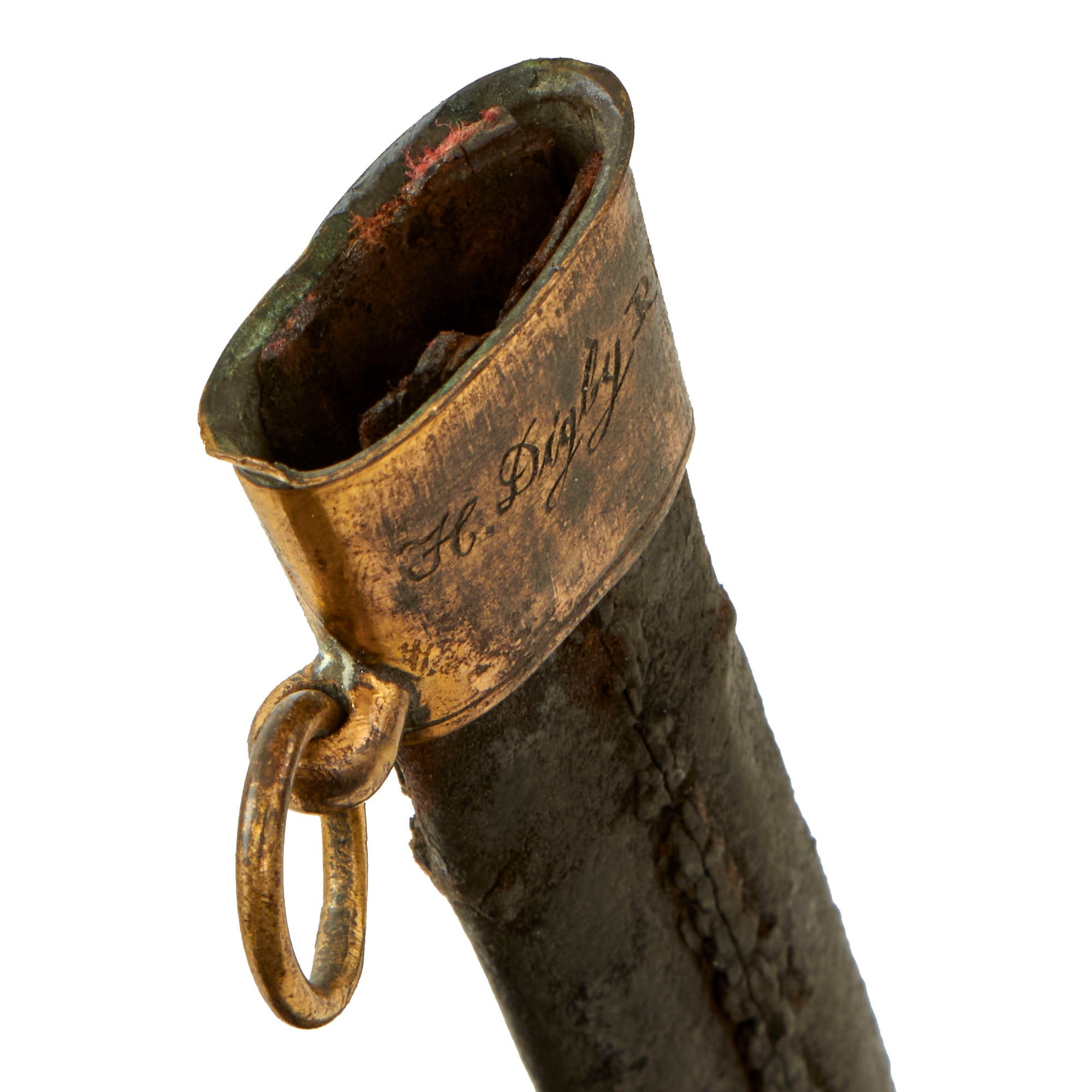 The included scabbard is in rough shape for its age, only missing the end chape. Thankfully, it’s the throat chape which is engraved with H. DIGBY R.N. in the correct period engraving style. The throat and middle chapes still retain their suspension rings. The end of the blade sticks out of the end of the scabbard.
