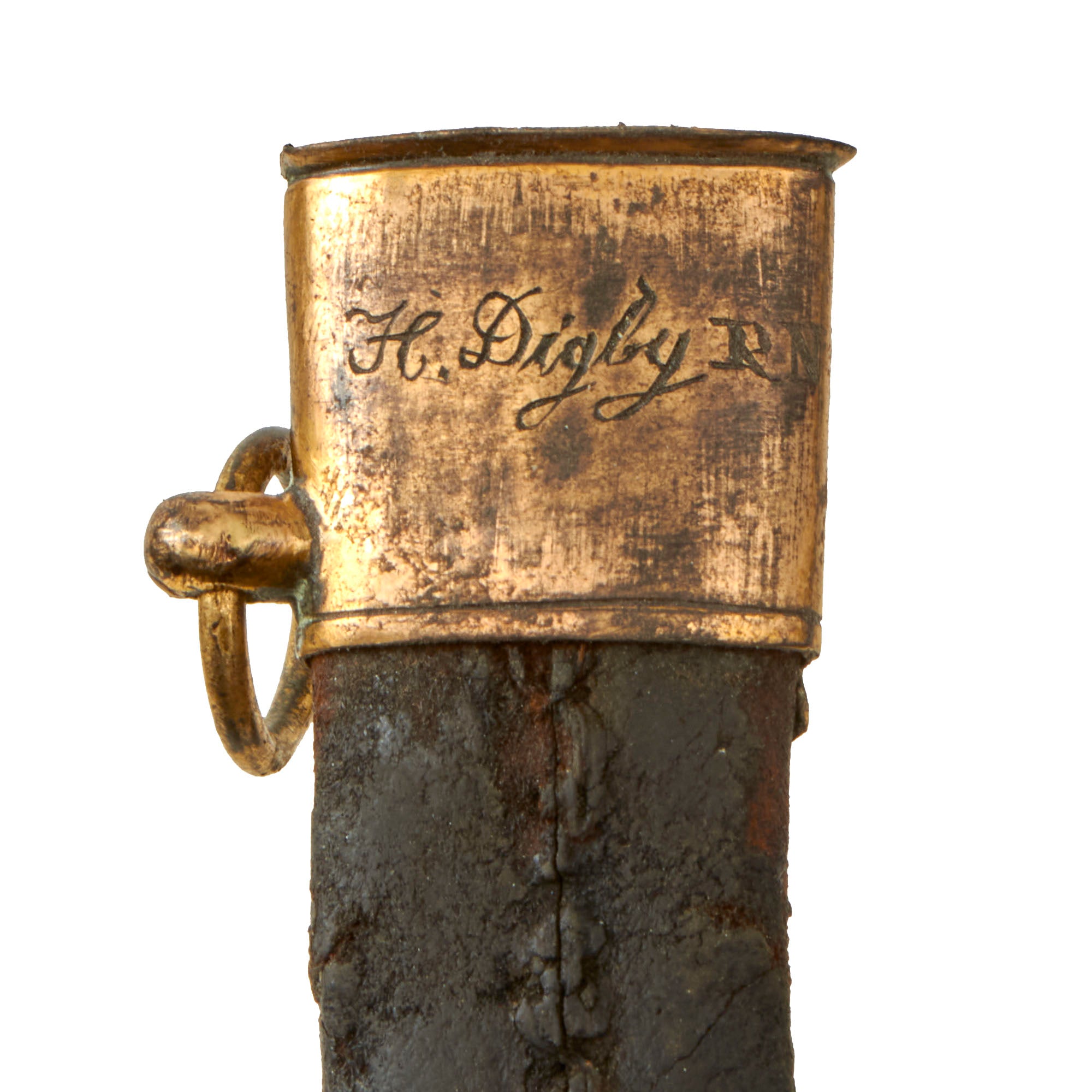 This is a phenomenal example of a British Midshipman’s Dirk with its original scabbard, which is engraved at the throat H. DIGBY R.N., identifying the dirk to Admiral Sir Henry Digby GCB, one of the most storied British Naval Officers of the Napoleonic Era, a recipient of the Most Honourable Order of the Bath, and commander of six different vessels during his tenure, as well as serving as Commander in Chief, Sheerness, attaining the rank of Admiral in 1841.