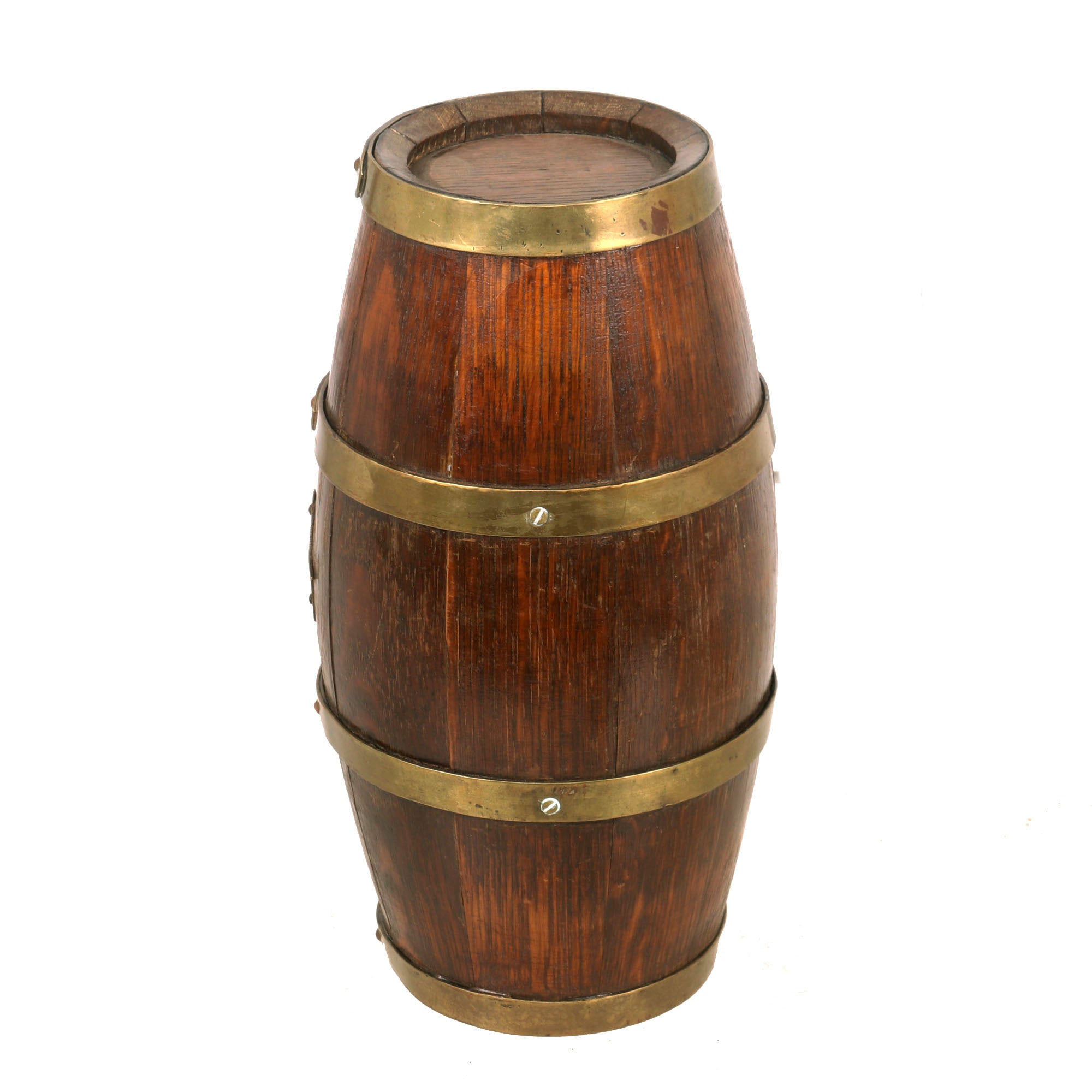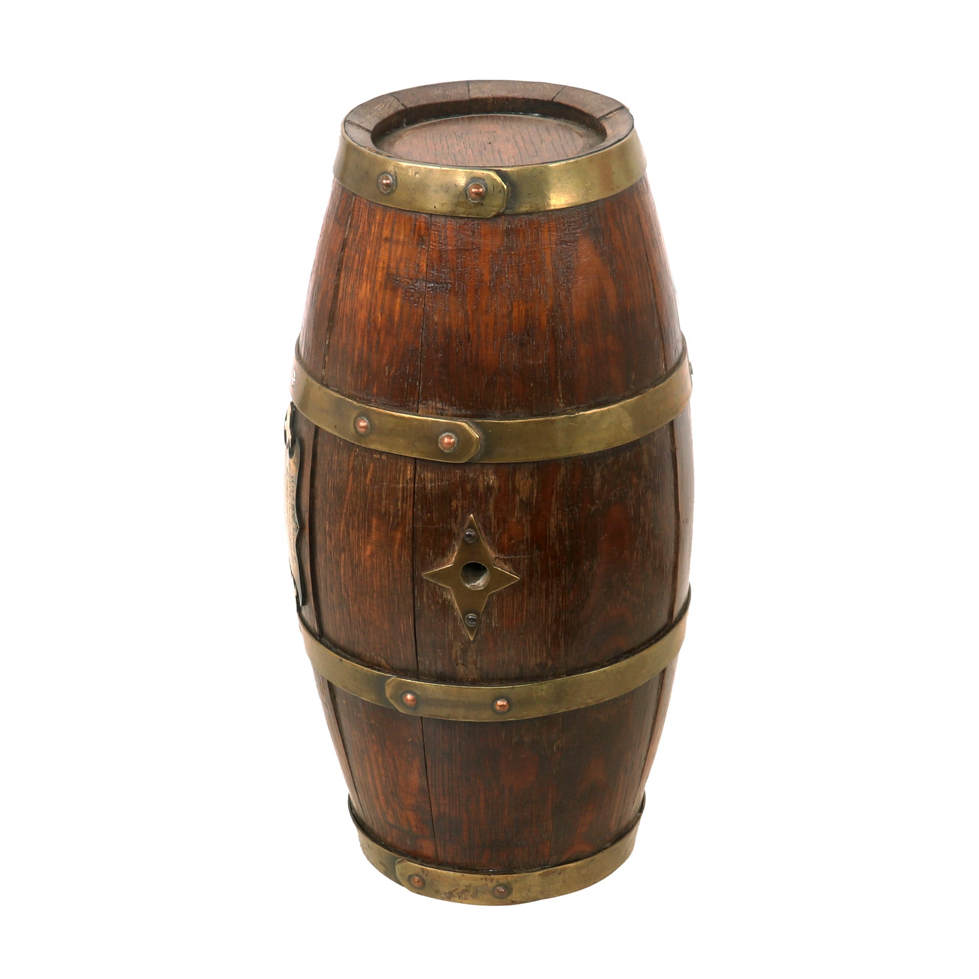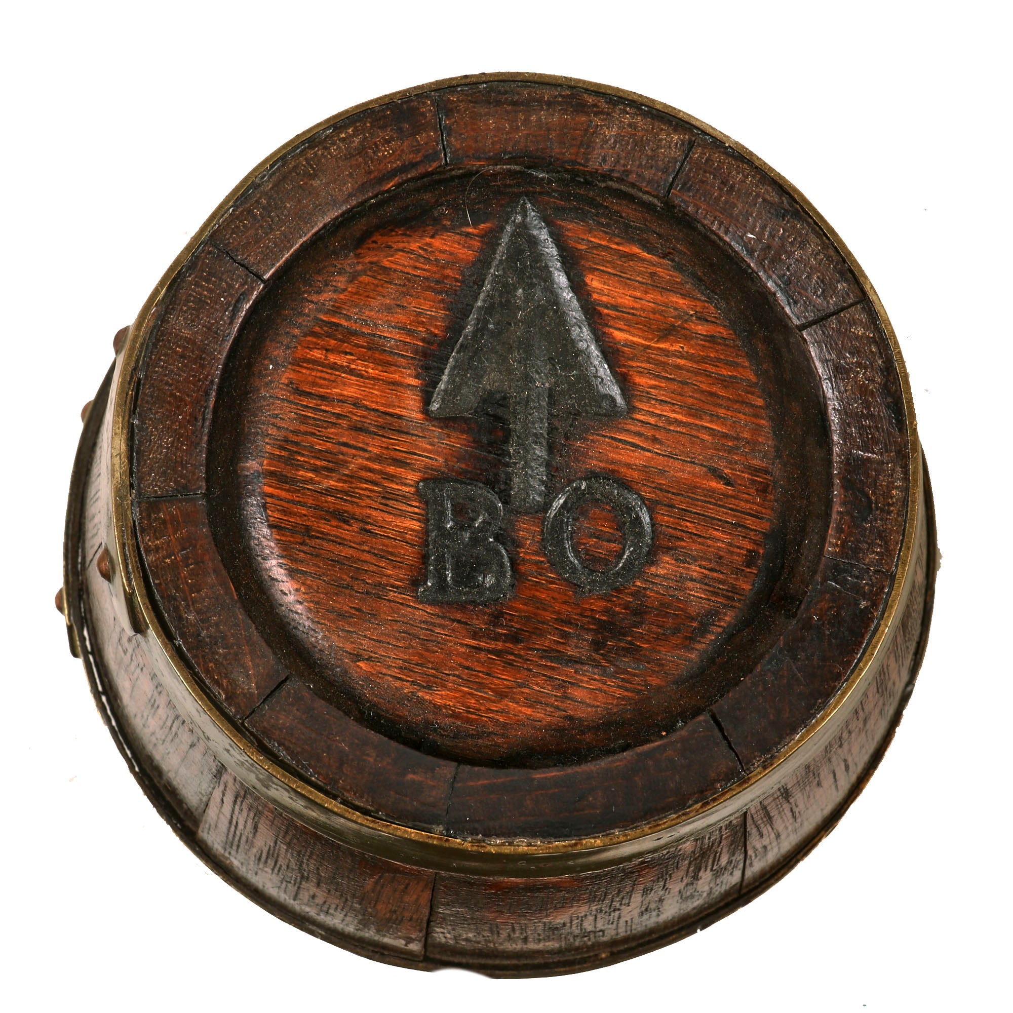The keg measures 12 x 6 x 6” and is reinforced with three brass bands. On one end the keg is branded with a BROAD ARROW over B.O., for the Board of Ordnance. There is a plaque on the middle of the keg reading: