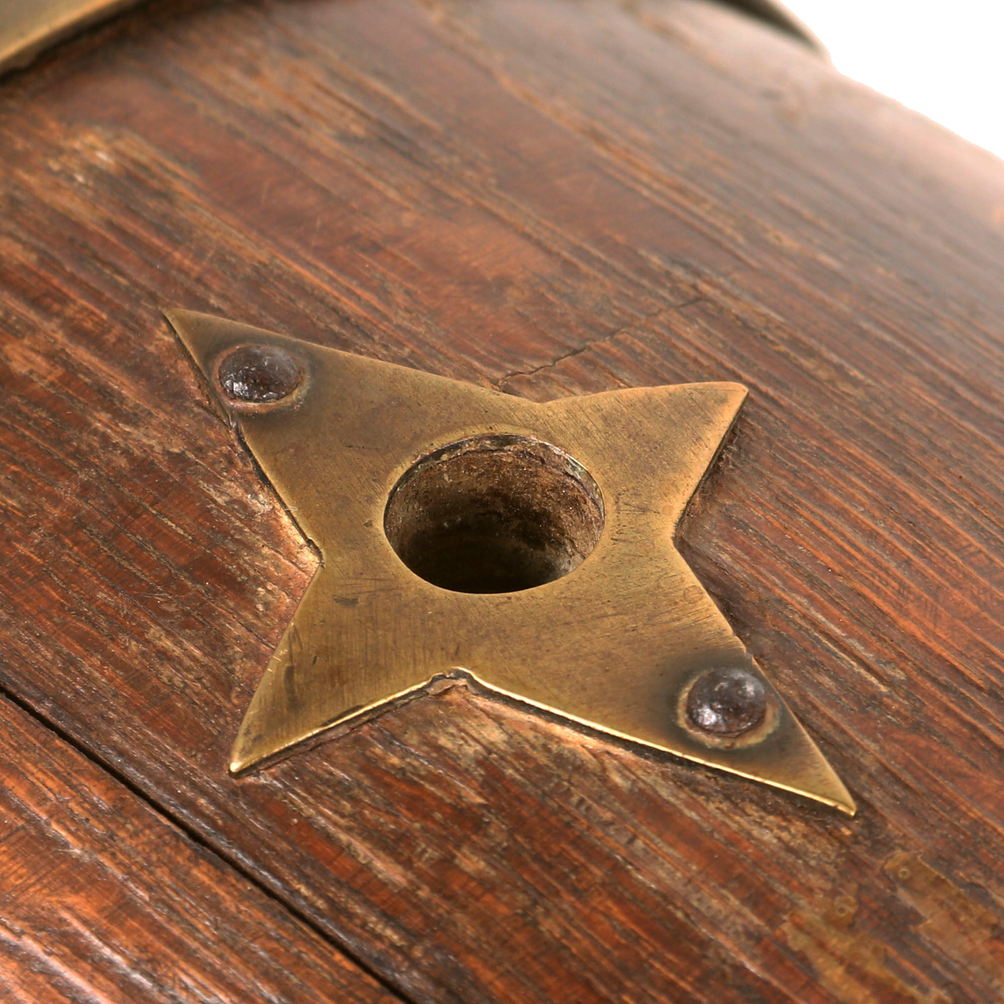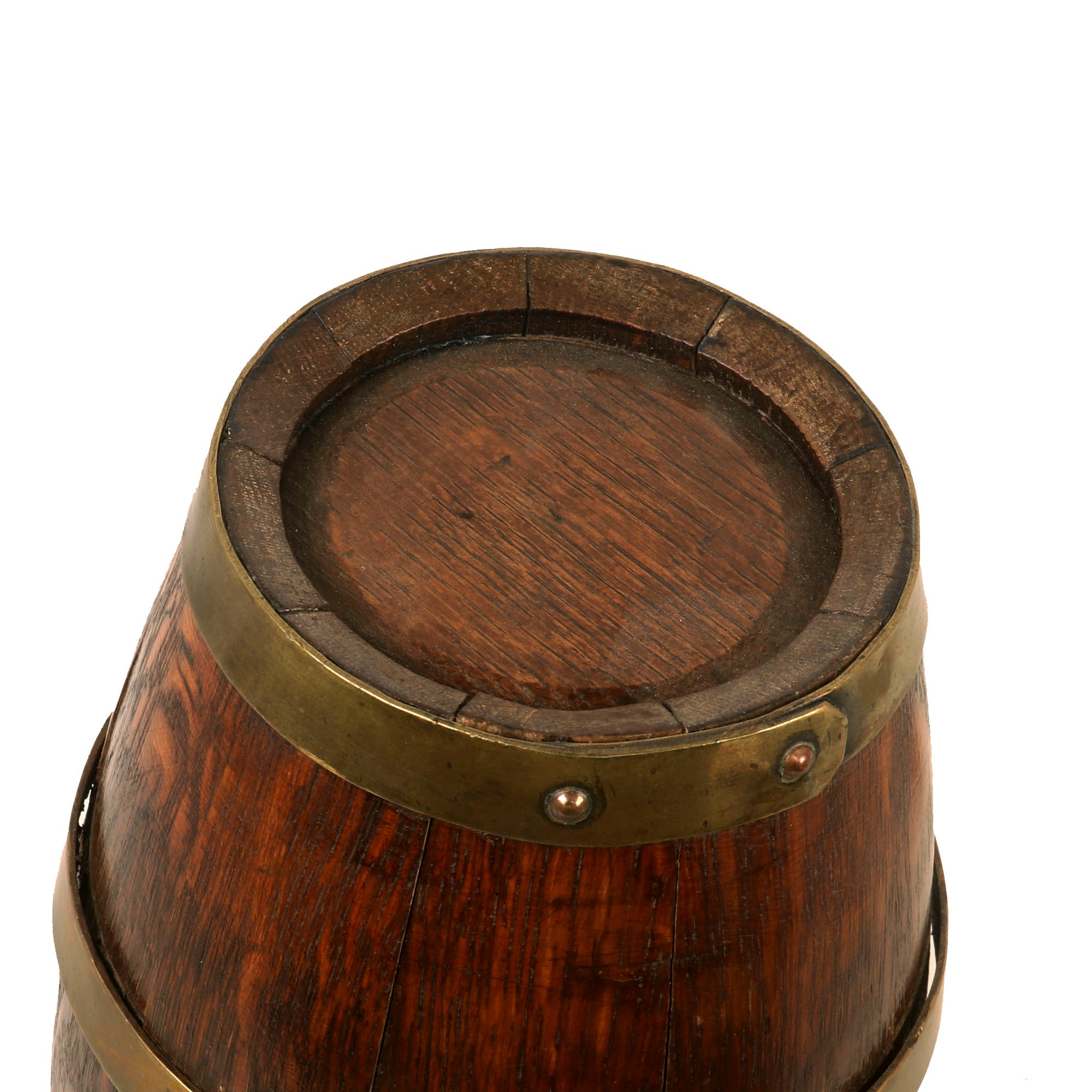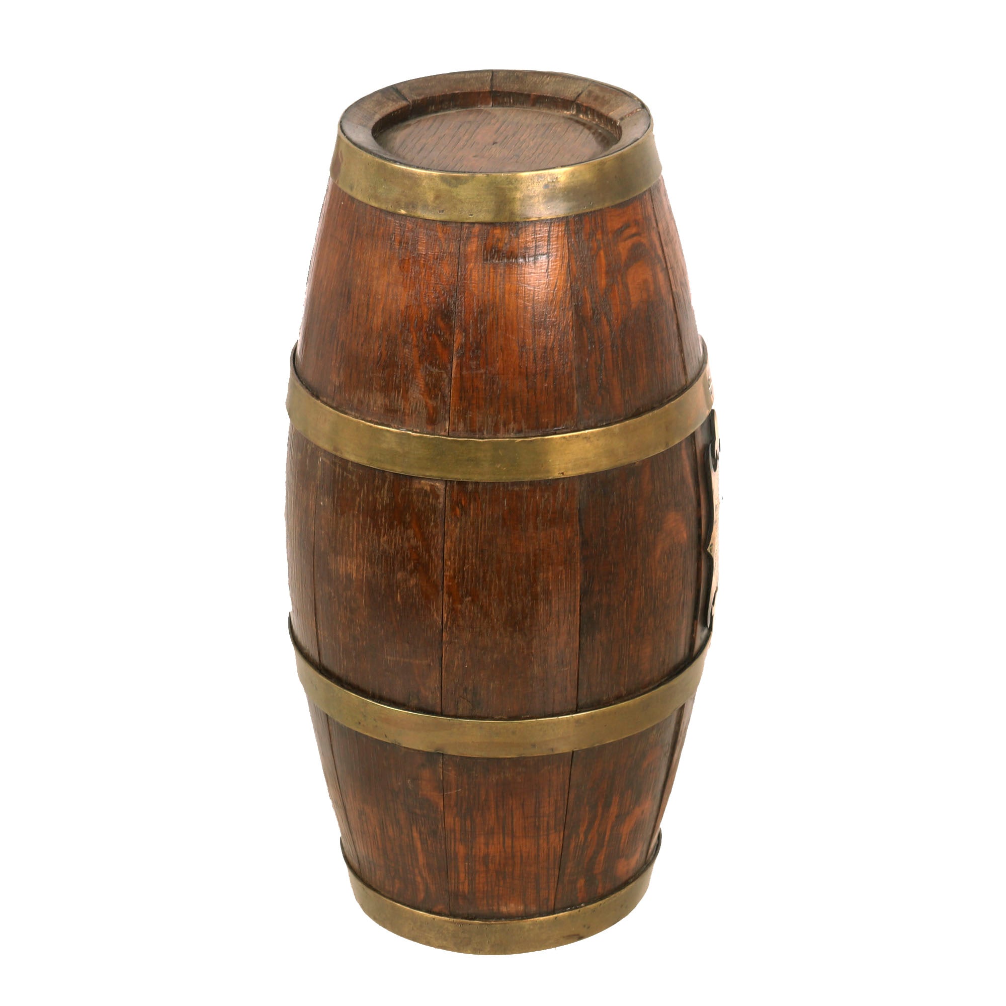 The keg measures 12 x 6 x 6” and is reinforced with three brass bands. On one end the keg is branded with a BROAD ARROW over B.O., for the Board of Ordnance. There is a plaque on the middle of the keg reading:
