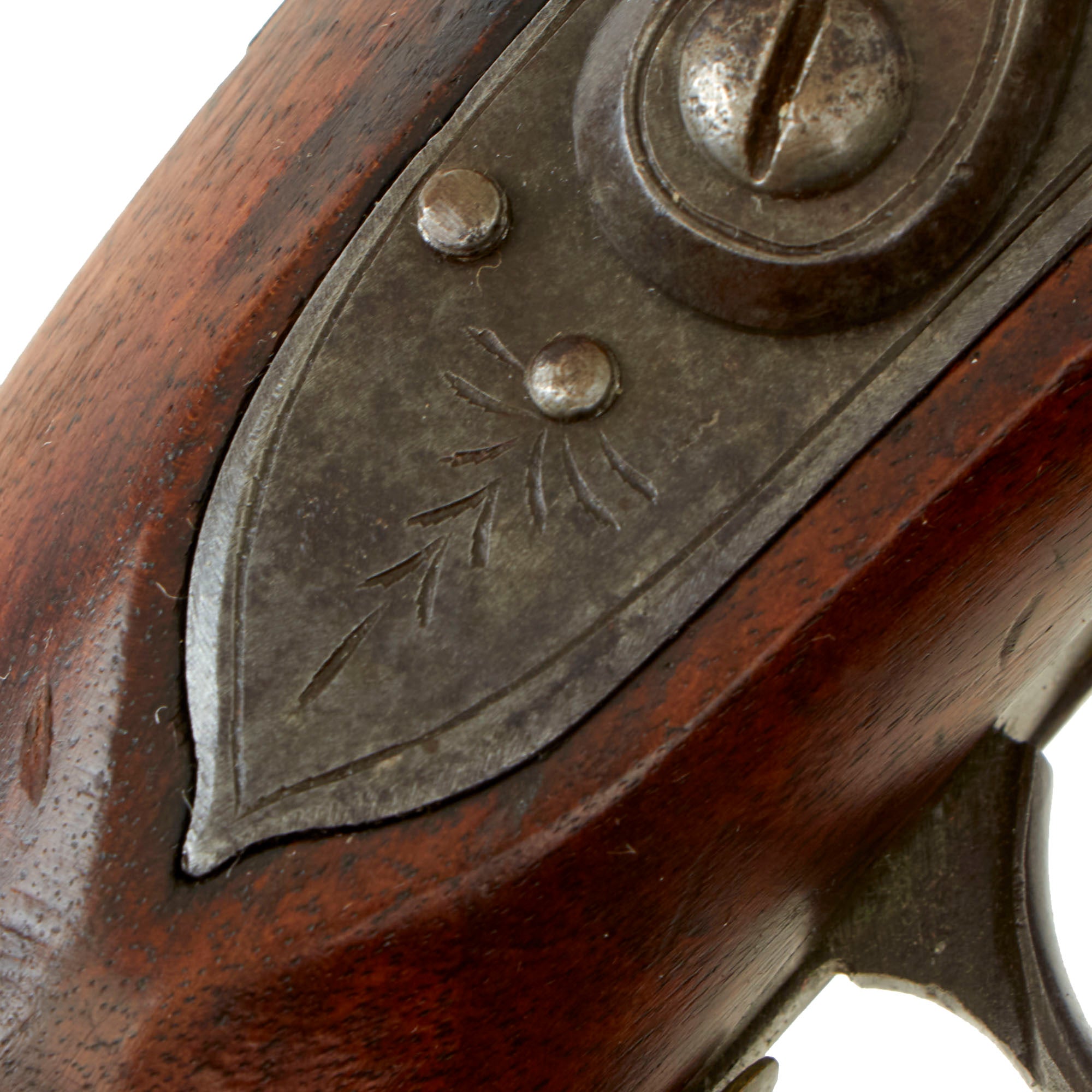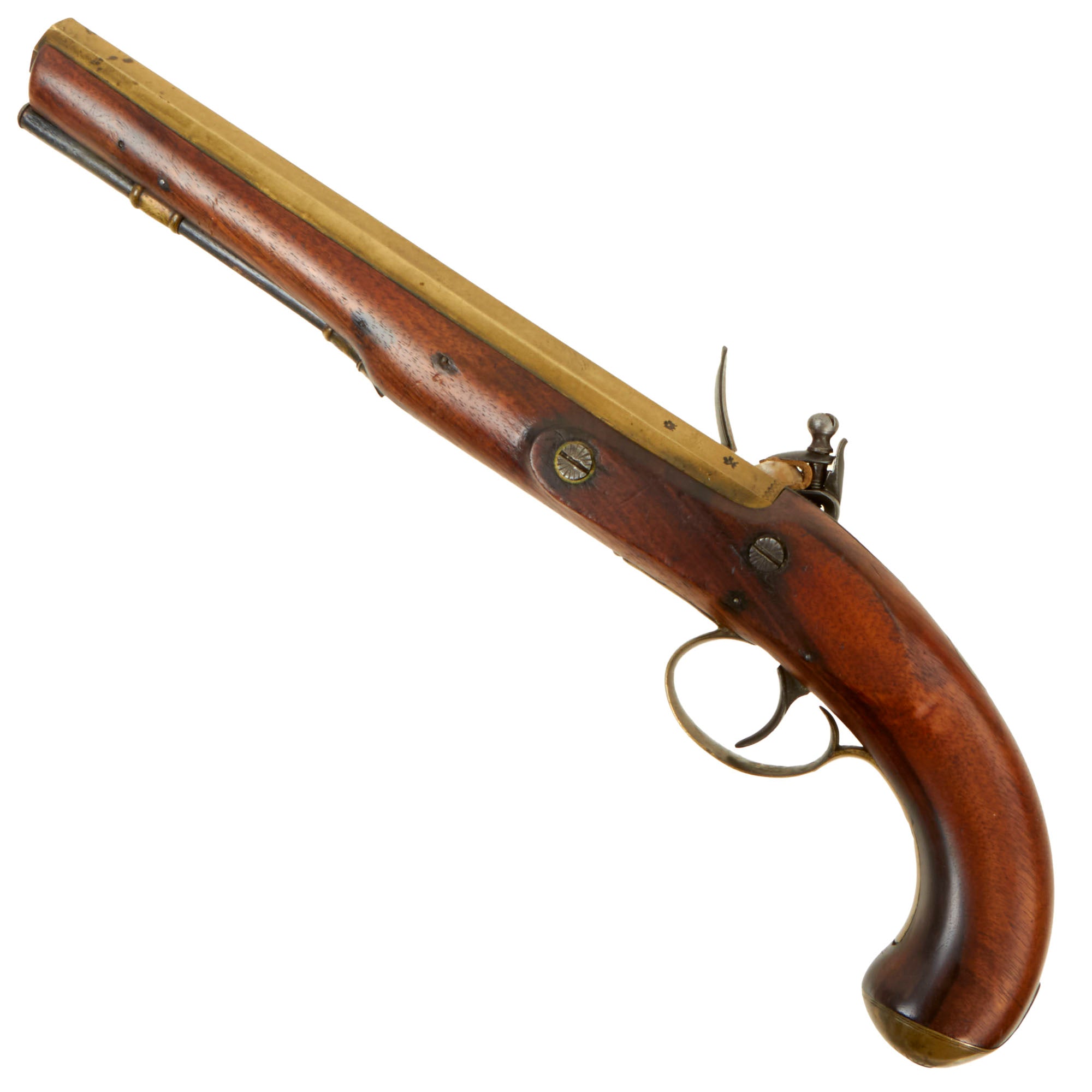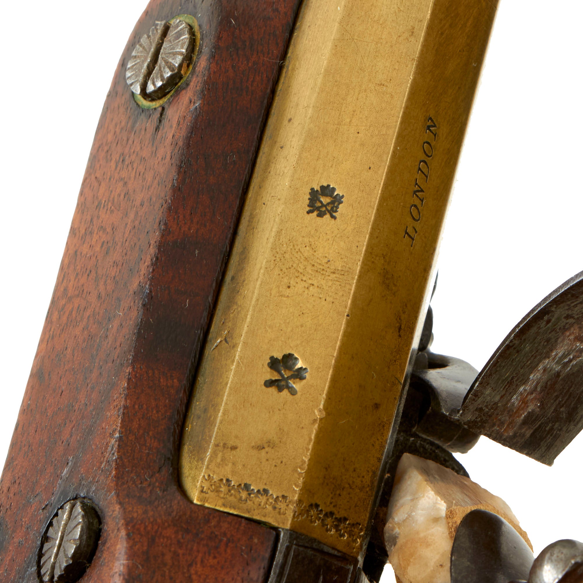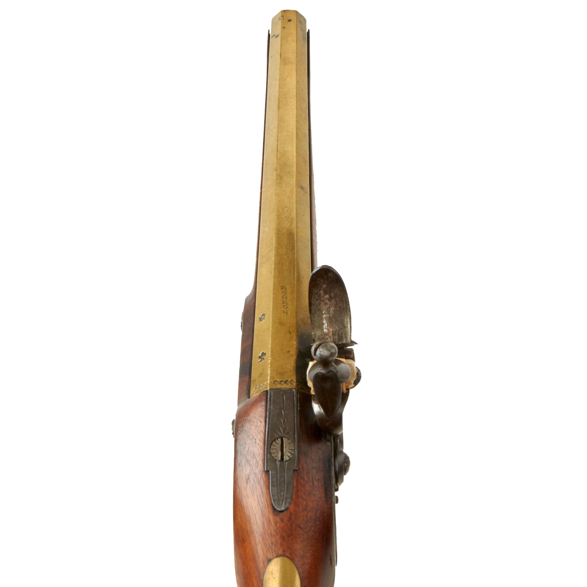 This lovely pistol is full stocked and has all brass mountings, with a gorgeous stock and brass escutcheon on the back of the grip. It features an octagonal BRASS barrel of10" with an overall length of 15 1/2". The barrel has the CROWN / CROSSED SCEPTERS / BPC "proof" and CROWN / CROSSED SCEPTERS / V "viewed" marks from the English city of Birmingham on the top near the breech. These are the correct markings for 1813 and later manufacture. It comes complete with a wooden ramrod, which is probably a period replacement for display.