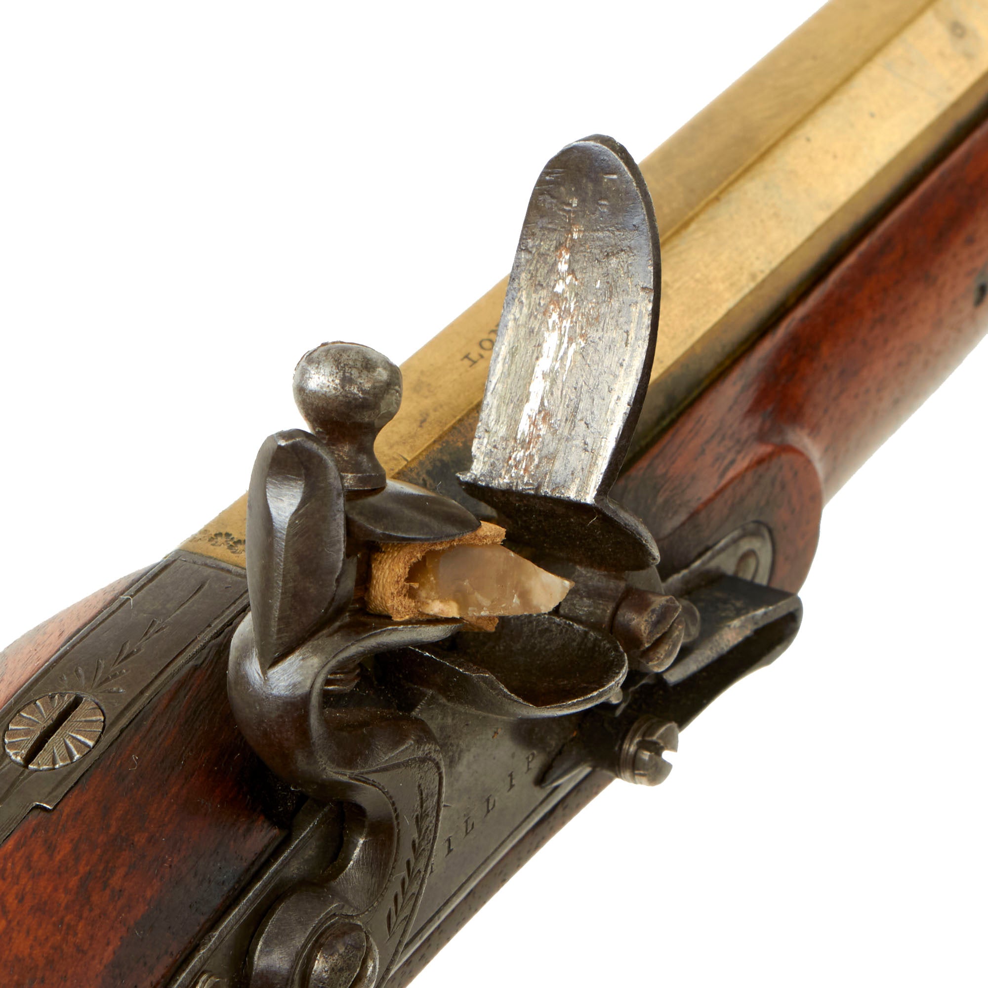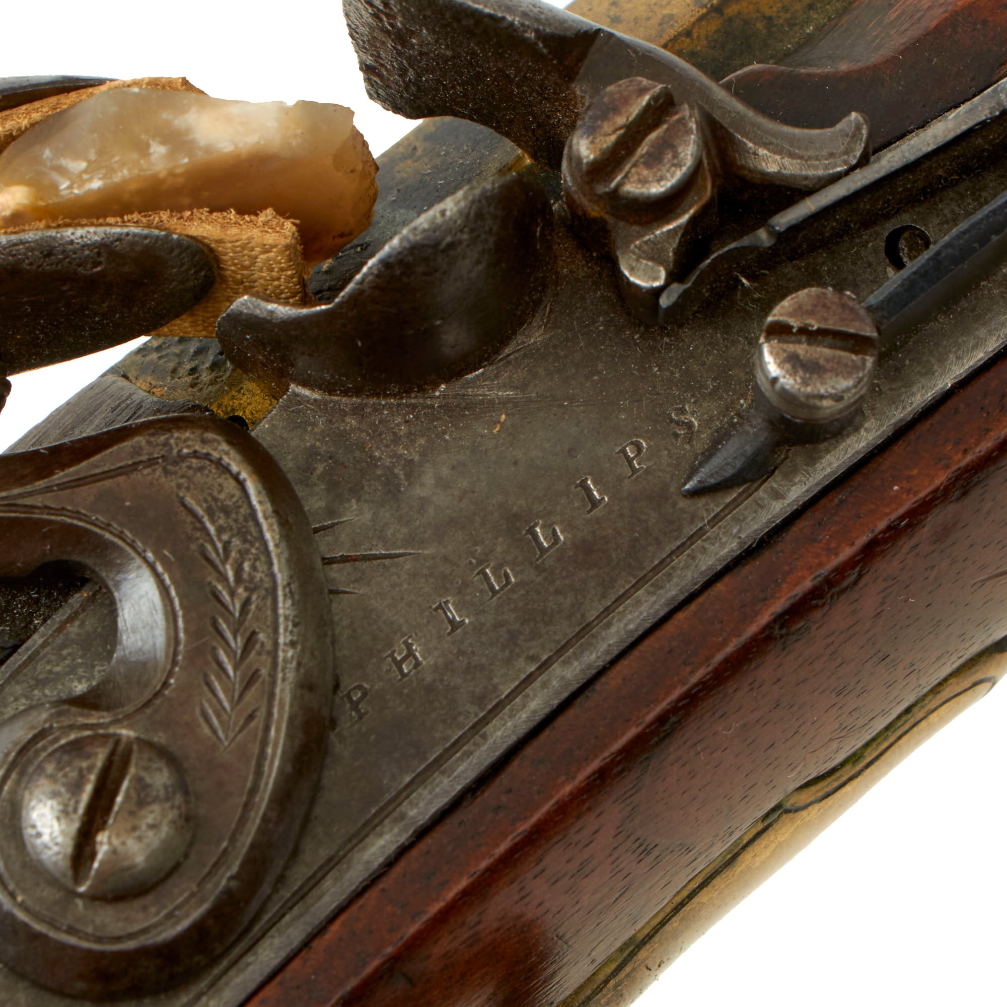 Original Item: Only One Available. Here we have a very nice officer's private purchase rifled flintlock pistol, all brass mounted with a lovely octagonal brass barrel. It is marked PHILLIPS on the lock plate, and LONDON on the top of the barrel, a known maker of private purchase pistols during the Napoleonic era. We have seen a nearly identical pistol from this maker, except the barrel is round, and not octagonal. It also shares the early design "unbridled" lock, without an external support bridle for the frizzen and pan. The design is reminiscent of of the Naval officer's pistols of the time due to the brass barrel, but these also could be carried on land.