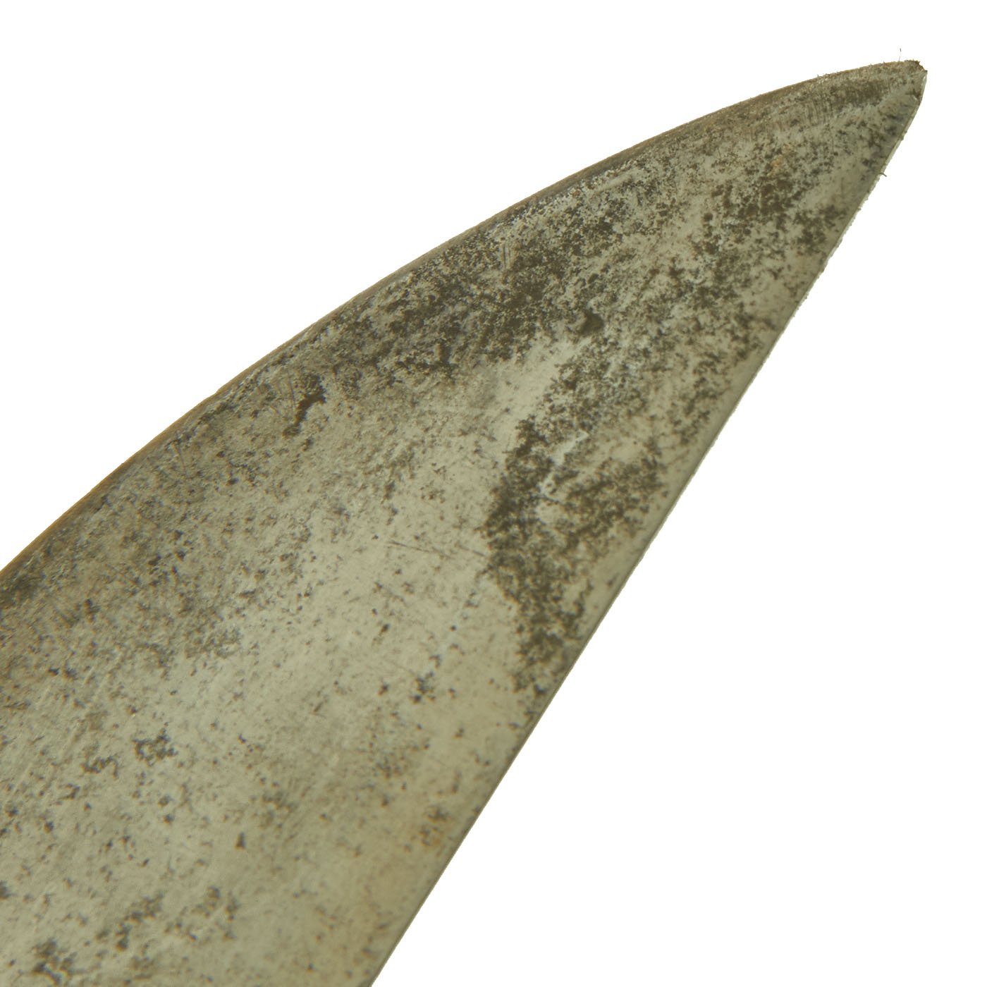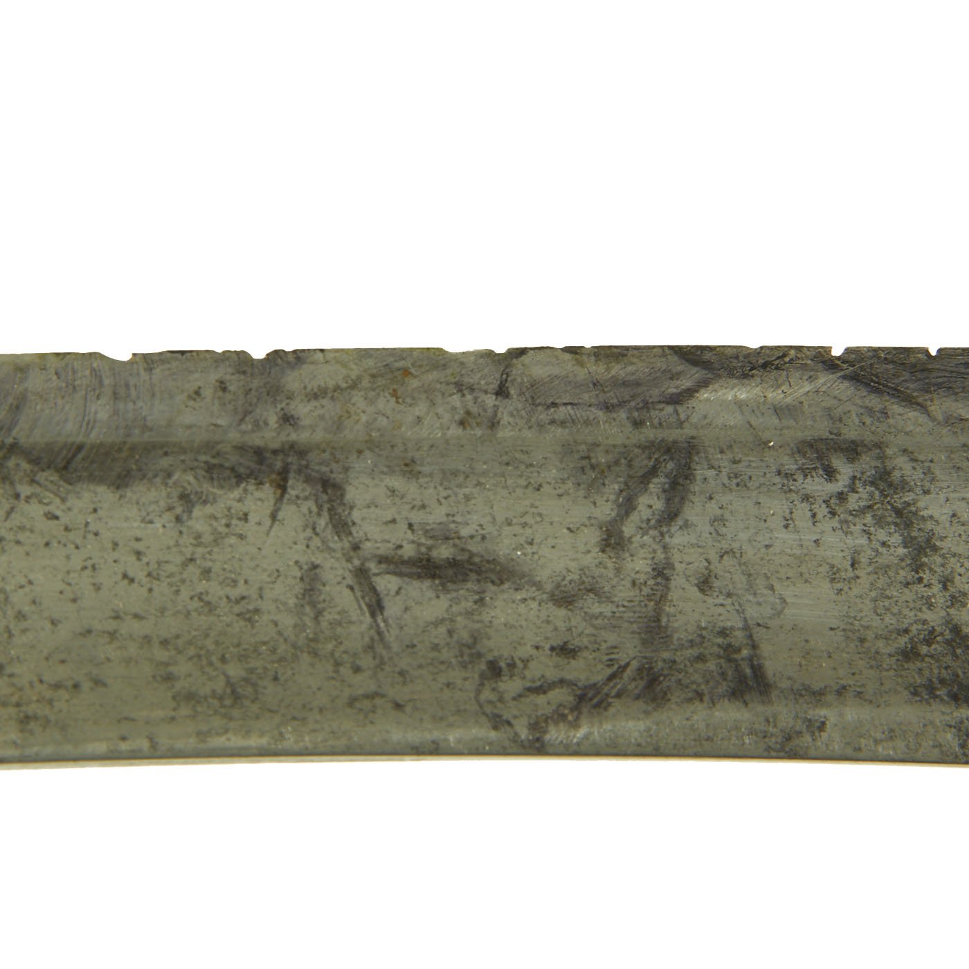 Our example is in fine condition and retains its leather wrapped wooden grip and "stirrup" steel guard together, with its original heavy iron Scabbard. The wire wrapping on the grip unfortunately has been removed. The curved hatchet point blade measures 33" X 1 1/2", with an overall length 38". The blade is very substantial but bears no visible markings on the flat or spine. The hilt chappe is engraved with: