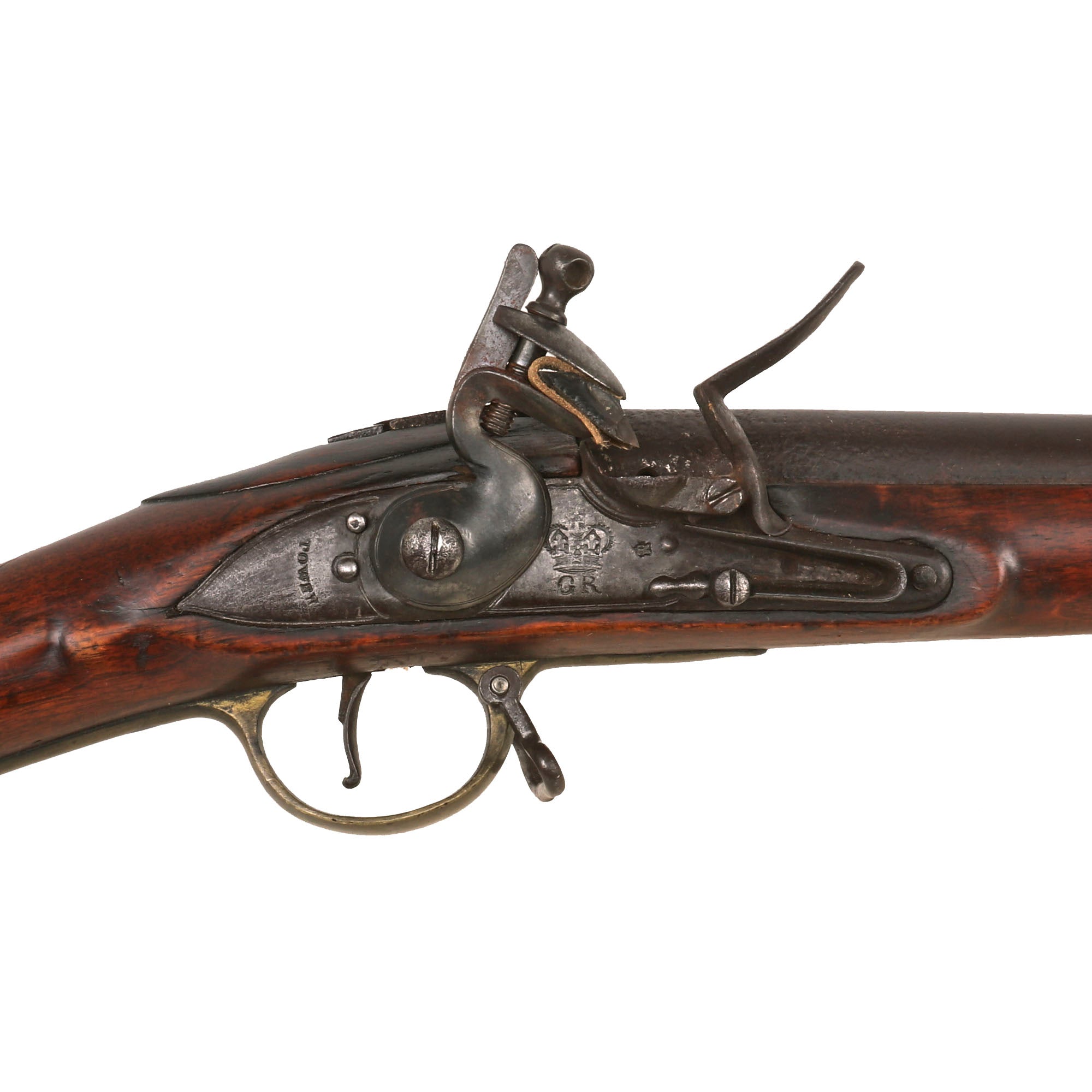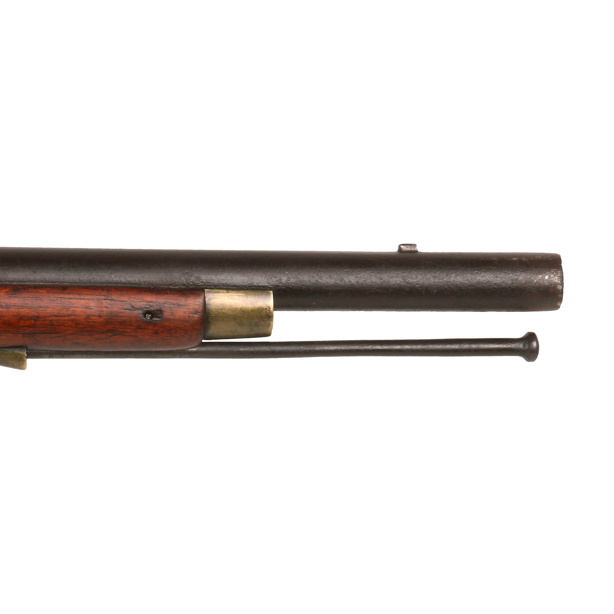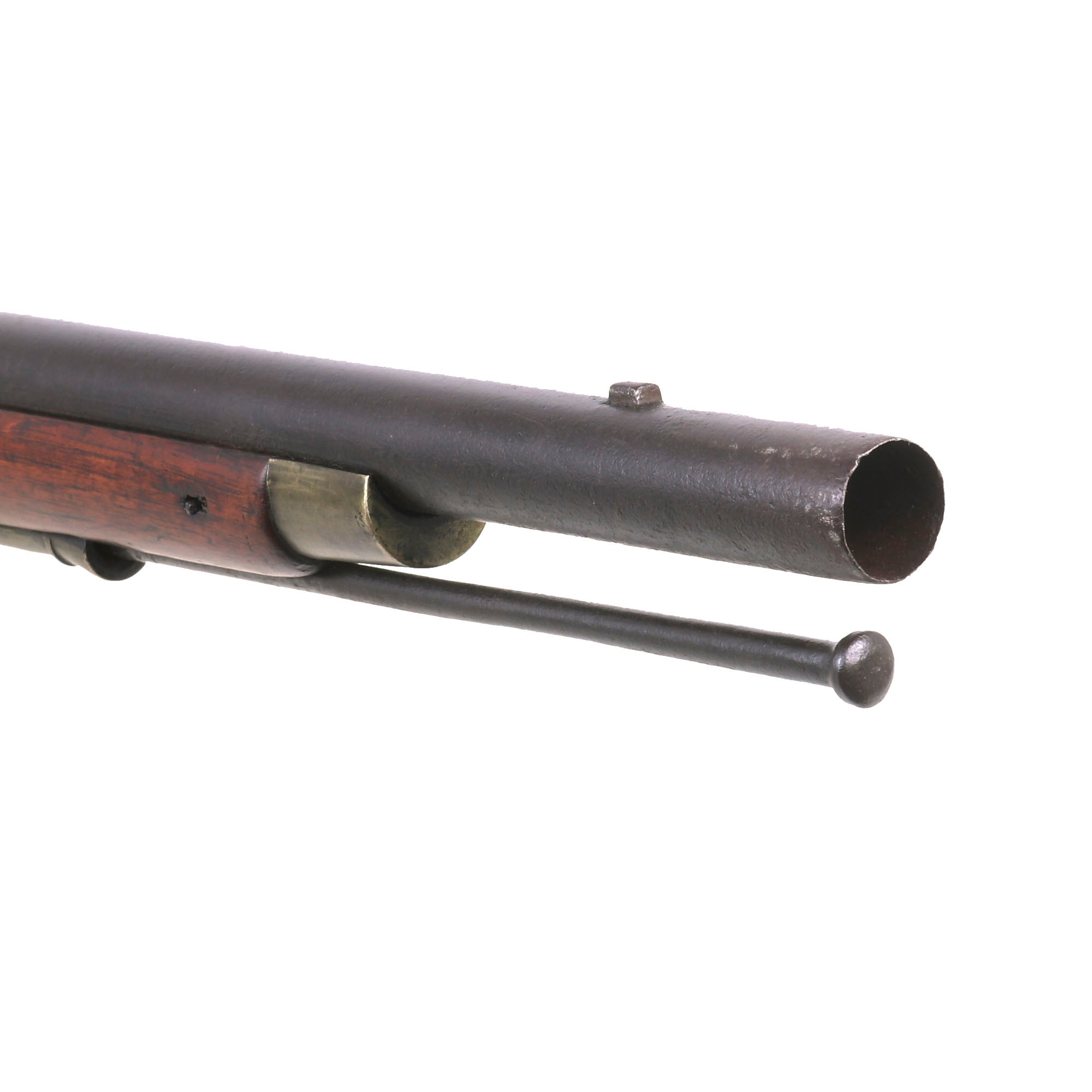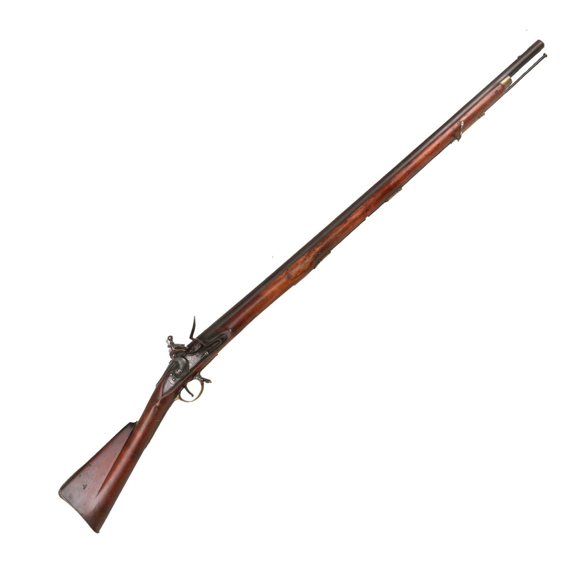 It has all regulation brass furniture, including three ramrod pipes, together with correct issue iron ramrod. Shows use but remains in amazingly tight and clean condition. Action is strong and holds at half cock, firing correctly at full cock. The lock is quite clean and in very good shape. The barrel has a lovely patina of age, showing some wear from powder burn near the touch hole, as mentioned previously.