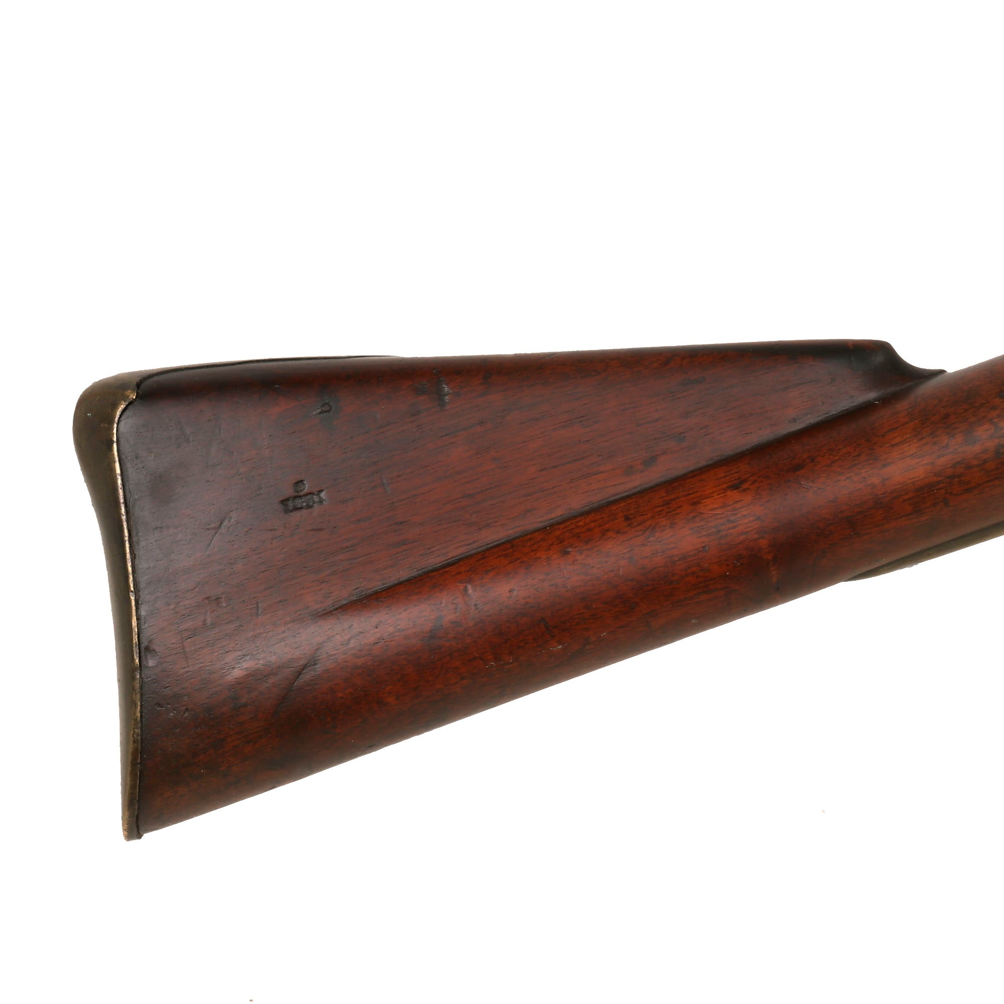 The stock has a lovely color, showing wear and age, and also some expertly executed wood graft repairs along the woodline on the right hand side. There are also some additional repairs around the holes for the barrel pins, which often suffer rust rot. There are not any major structural issues we can see, and the stock has a lovely color and polished glow that would look fantastic under any type of lighting. The carved surround for the barrel tang is still crisp. Both sling swivels are present and move easily, and the ramrod is in great shape.