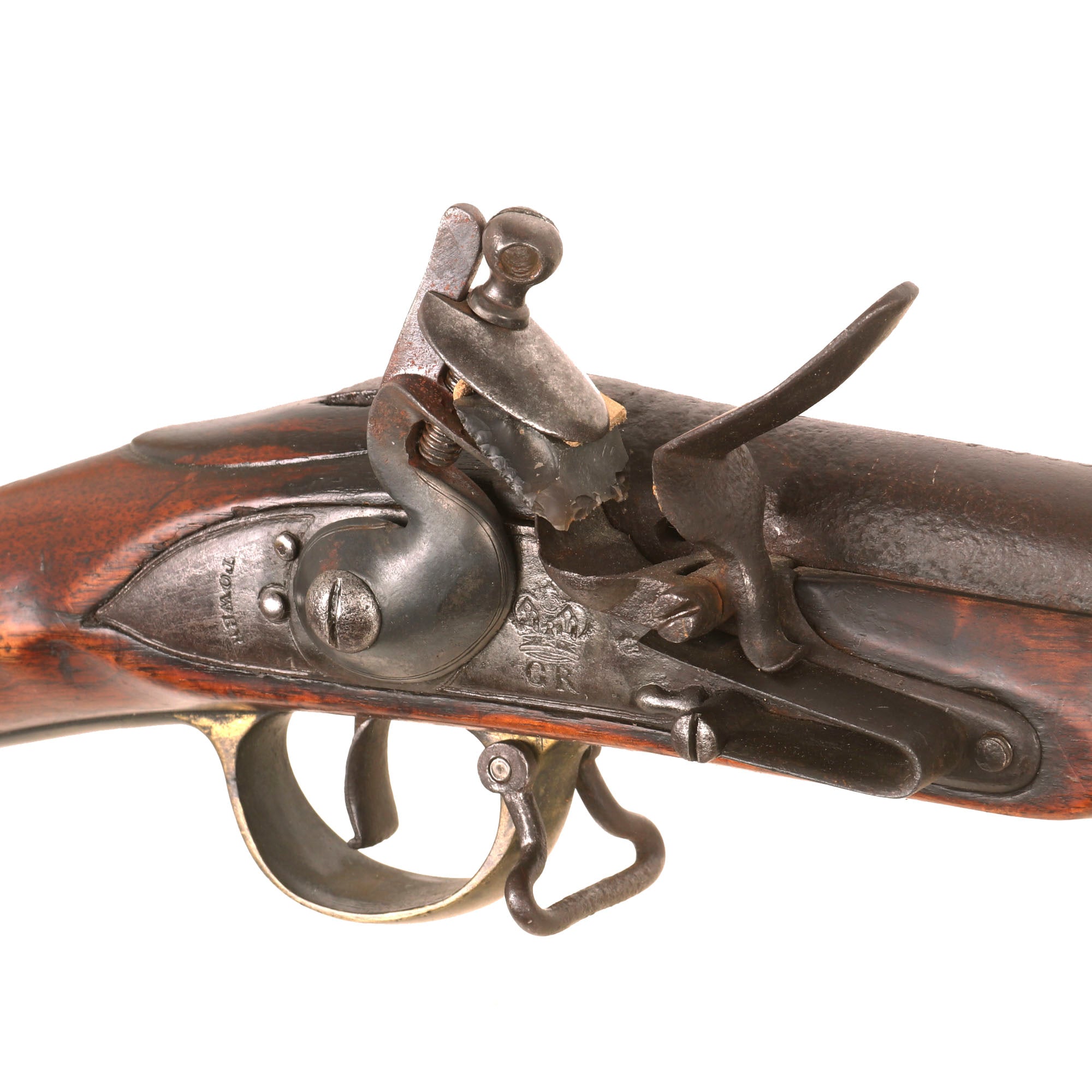 The lock plate is correctly marked with CROWN over G.R. mid lock for King George III, and TOWER across the tail. There is also the CROWN / BROAD ARROW lock viewer's mark from the ordnance proofhouse under the pan. The lock has a swan neck cock, indicating pre-1808 construction, so this is a rifle that was in service during the Napoleonic wars. It is also equipped with the frizzen support bridle on the pan, and two screws behind the lock, both late 18th Century improvements to the design.