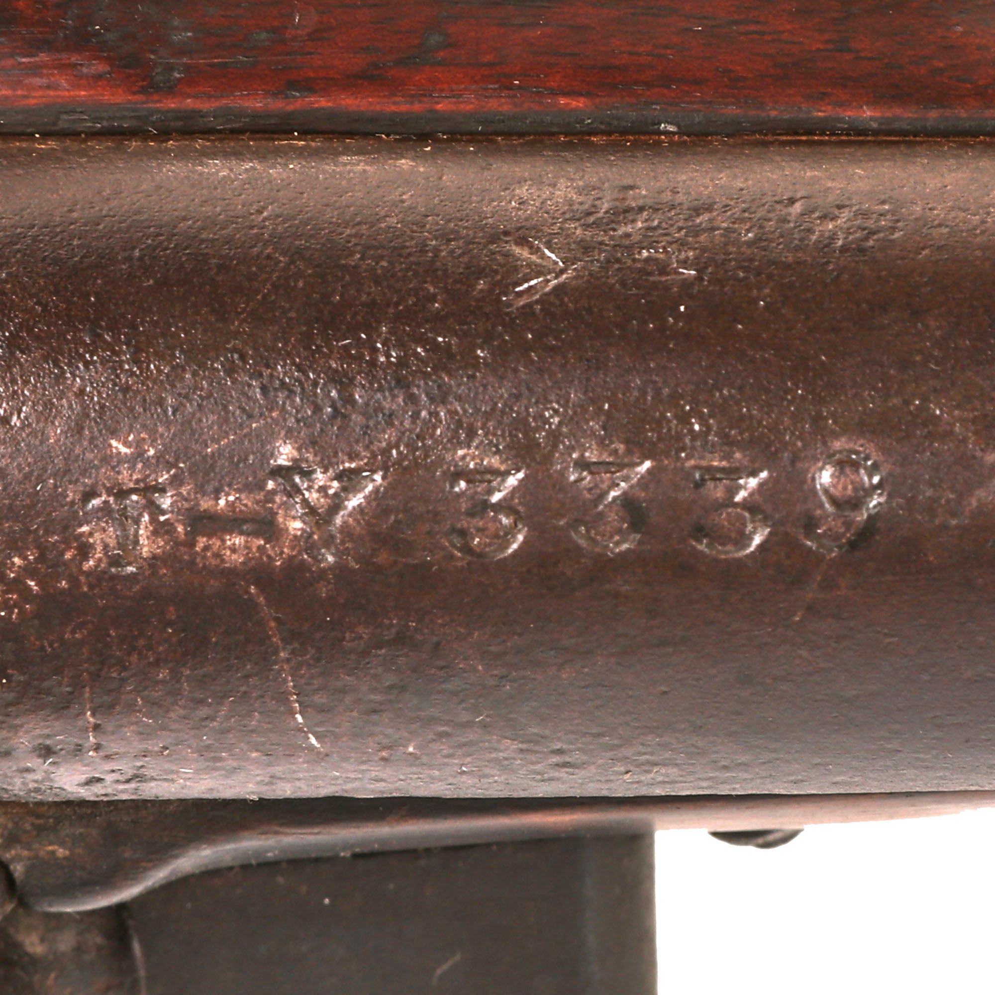 Another marking of we noticed is on the top of the barrel and on the butt stock, which are both clear and read T-Y 3339, which is very interesting indeed. This looks to be an Irish Government marking, required by the Irish registration Act of 1843. Weapons all had to be taken to the local constabulary and registered, and were marked with two letters for the district / county, followed by a number. "T-Y" is the code for Tyrone County in what is today Northern Ireland. This was realized to be mostly a waste of time and lasted only until August 1846. This musket looks to have led a very interesting life, probably sent as a local militia arm to Ireland during the Victorian Era.