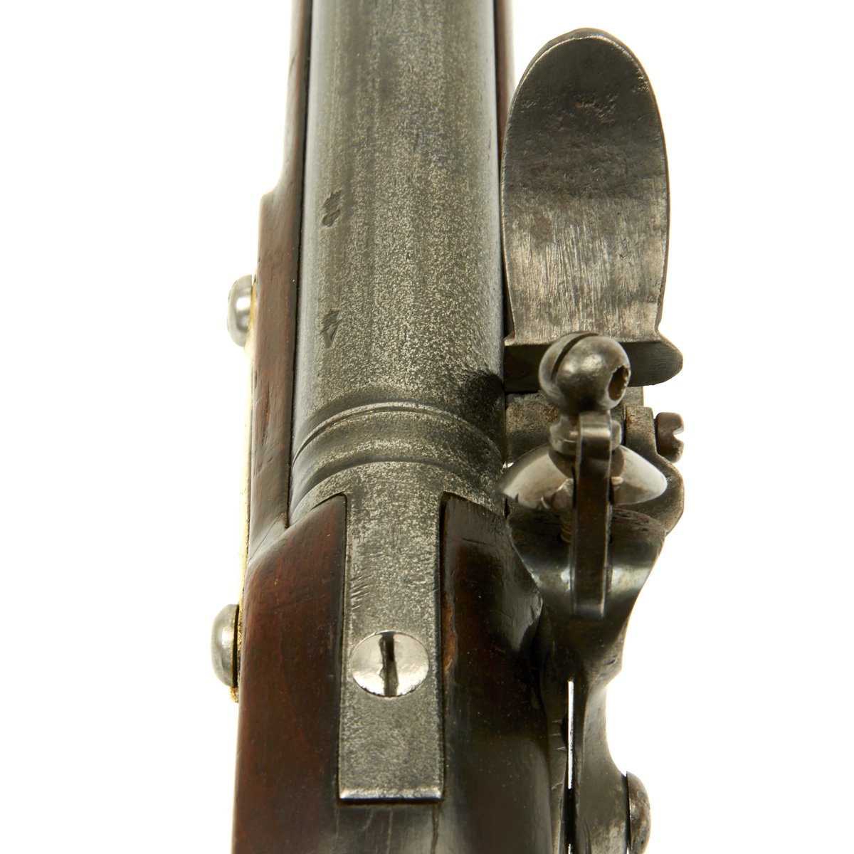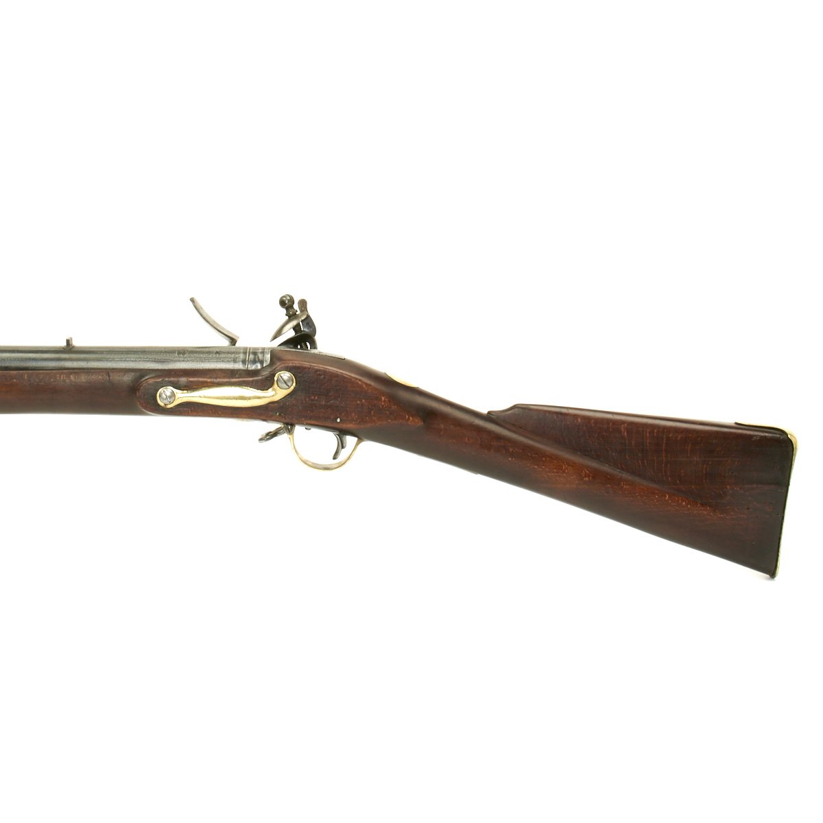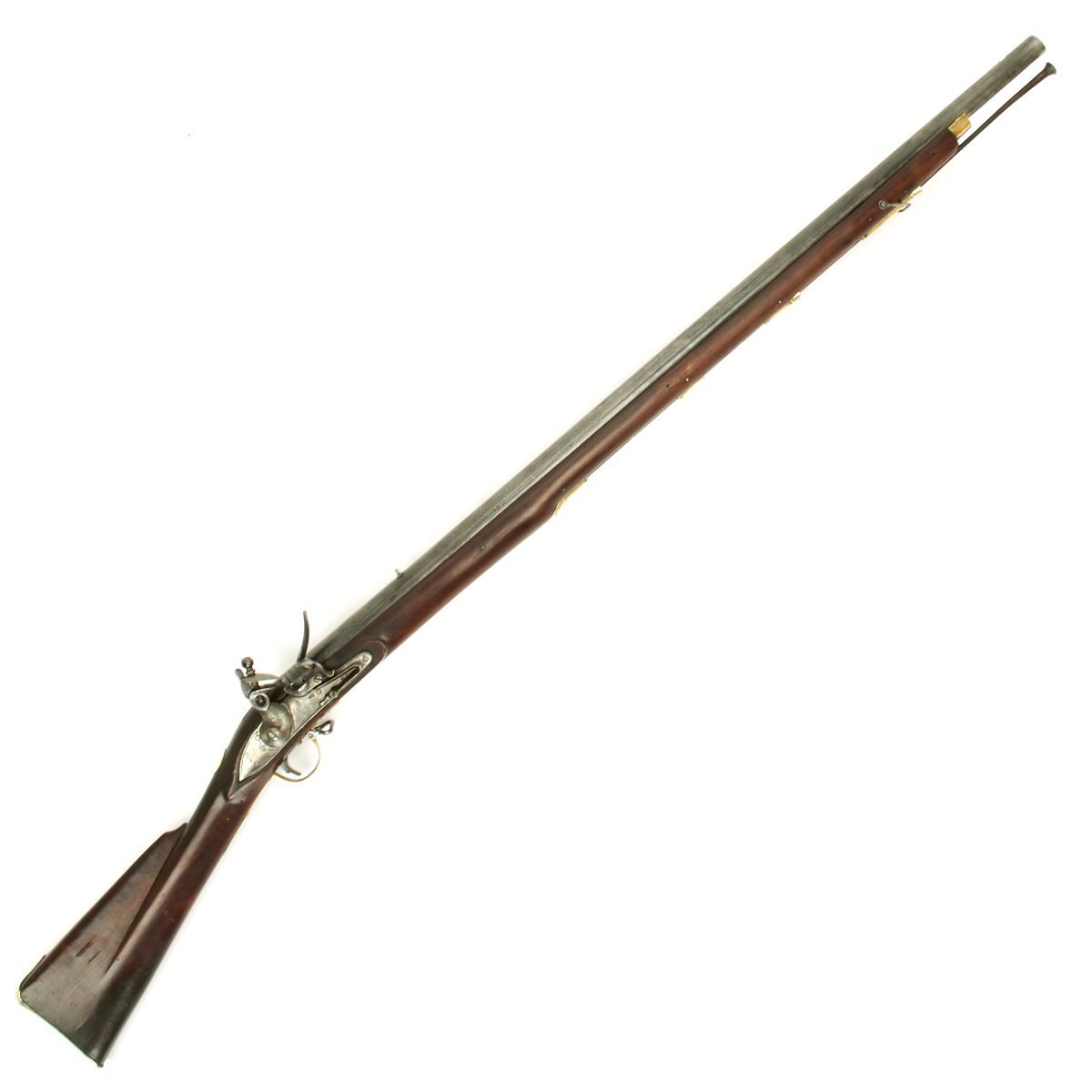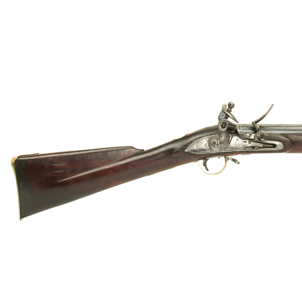 The musket is in overall terrific condition and was found here in the U.S., fully cleaned and ready to display. Stock is in excellent shape, and the only detracting feature is the missing front sight, which appears to have been replaced once before.