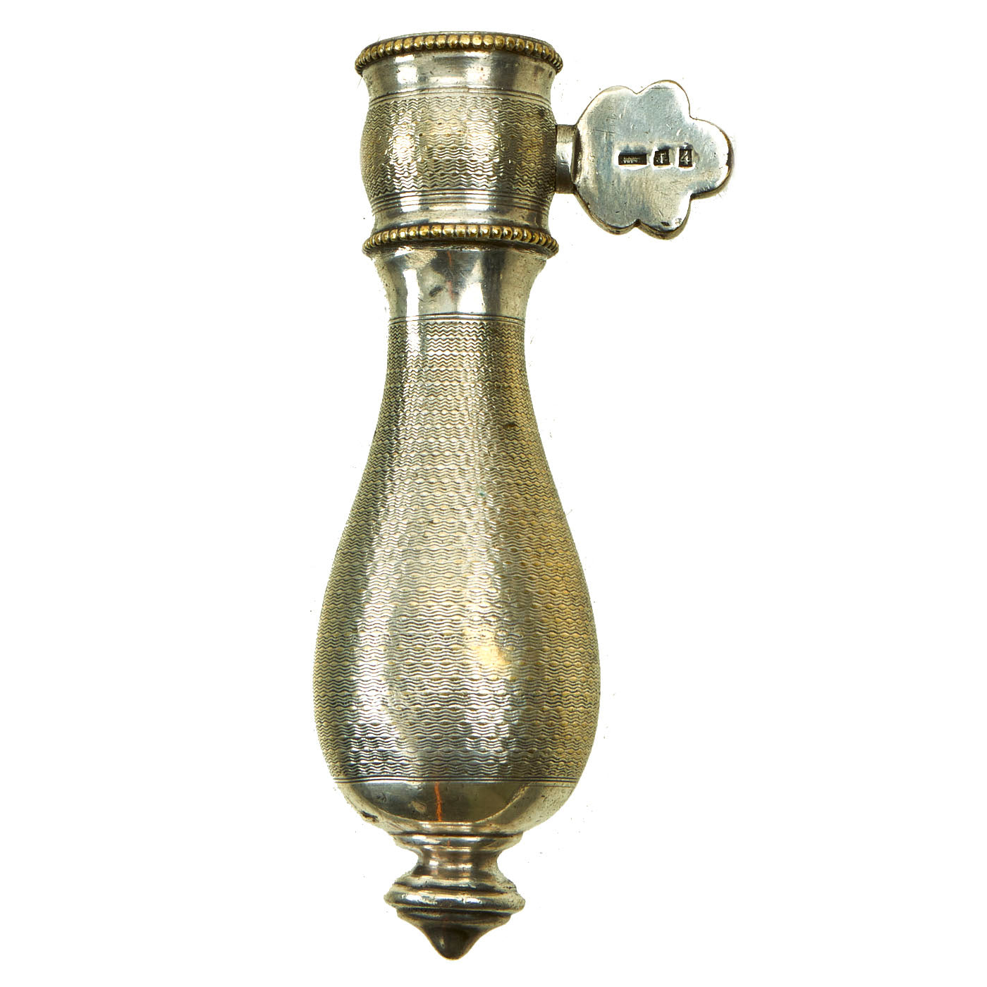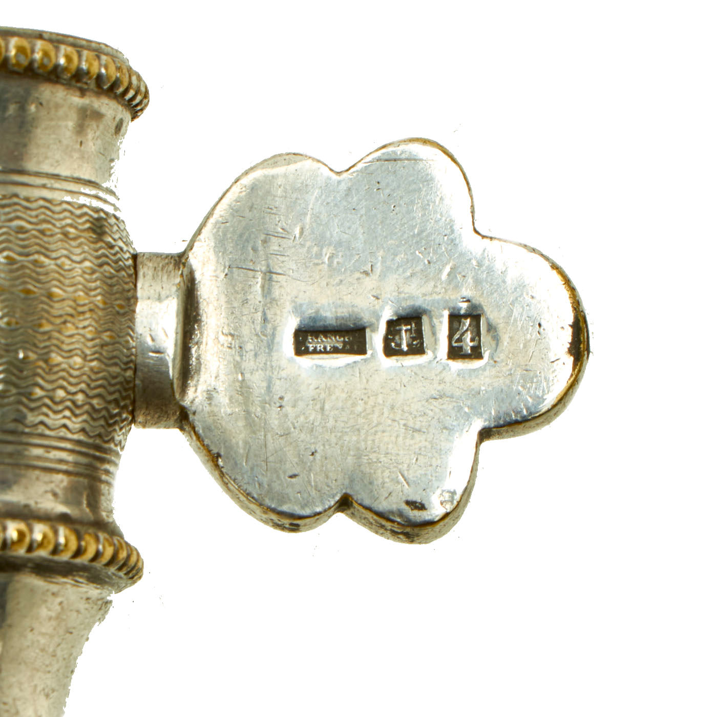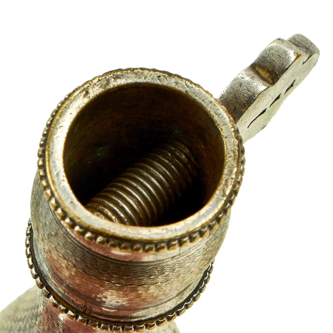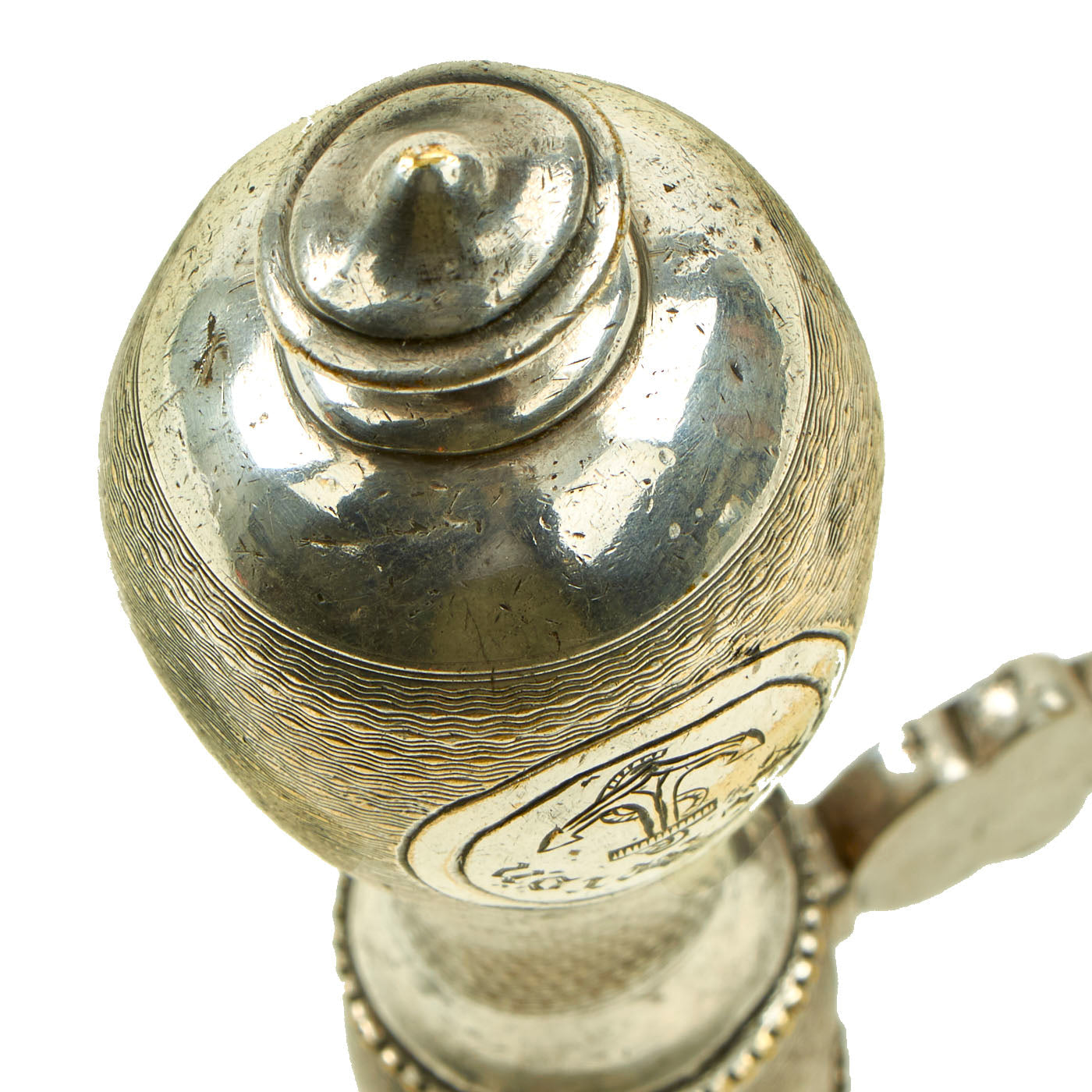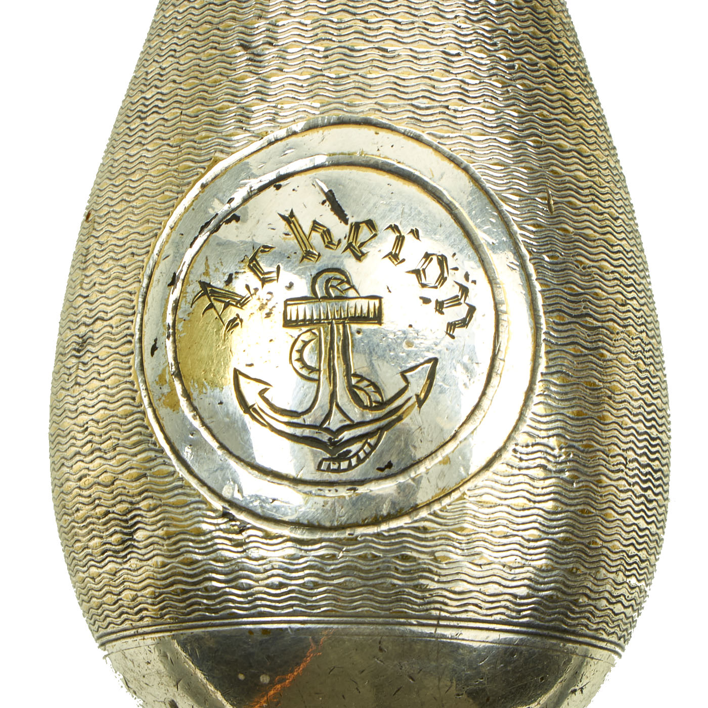 Original Item: One-of-a-Kind. This is a very nice silver plated brass Mutton Bone Holder, used to secure the joint when being carved, perhaps by the Ship's Captain at an Officer's dinner. Measuring 5" tall, once in place these gave great purchase to the carver. It is marked on the side with a naval “Fouled Anchor” under Acheron, and is textured overall to aid in holding it securely. The handle for the screw clamp looks to have maker or hall markings, however we are not able to decipher them.