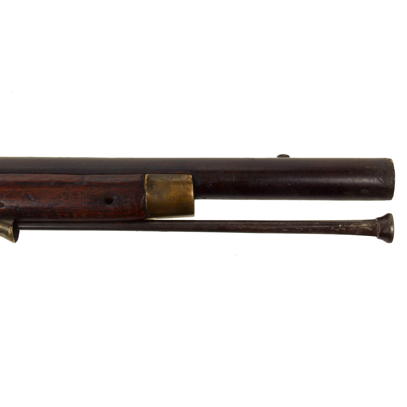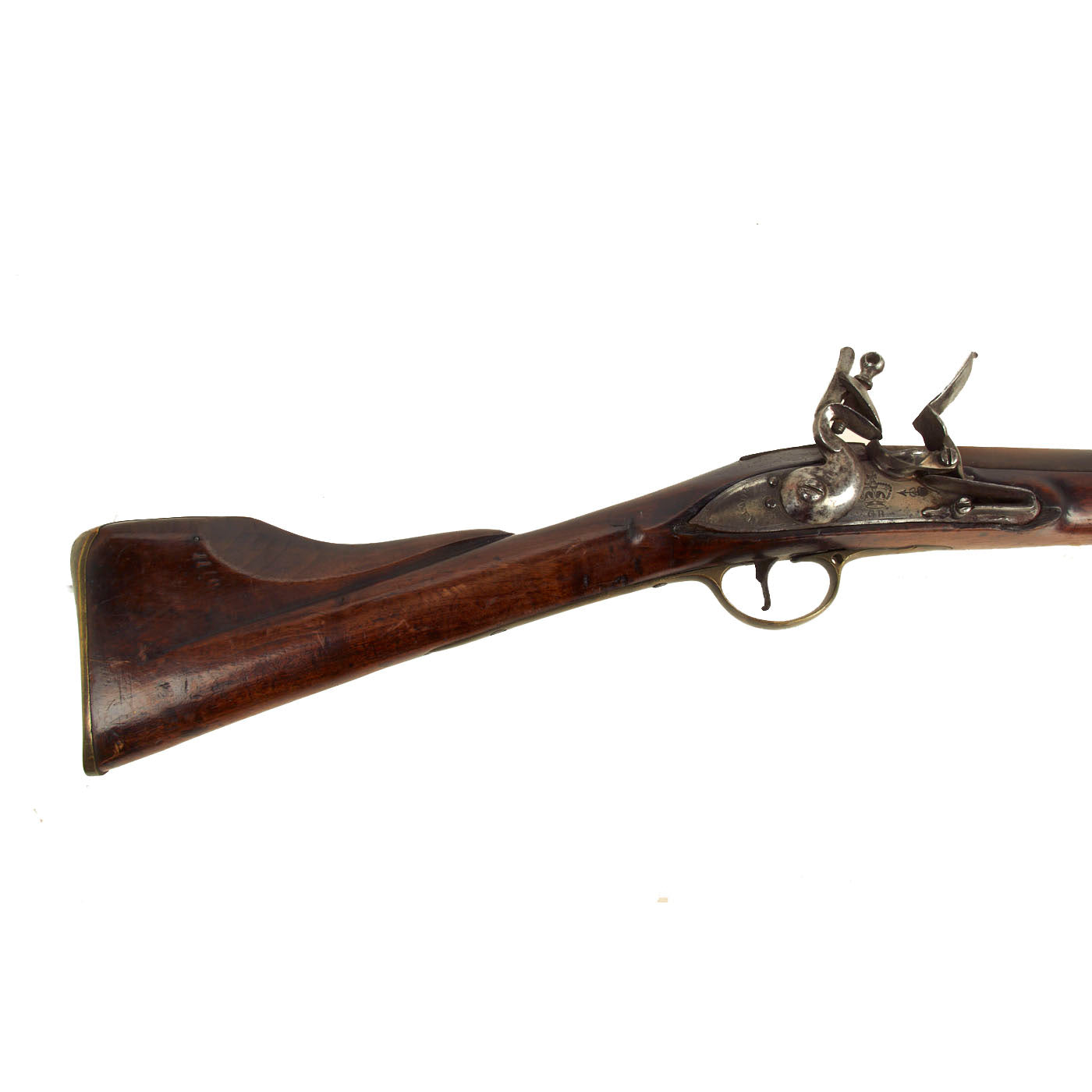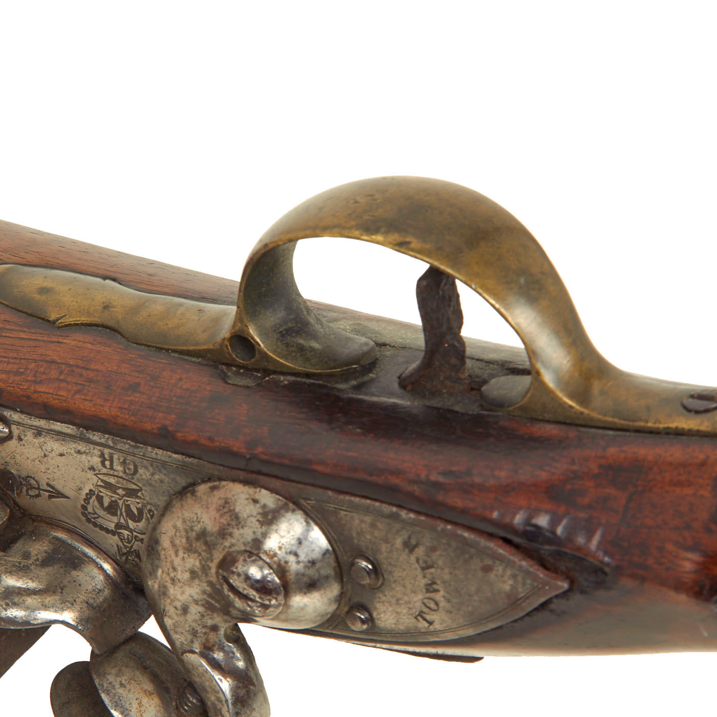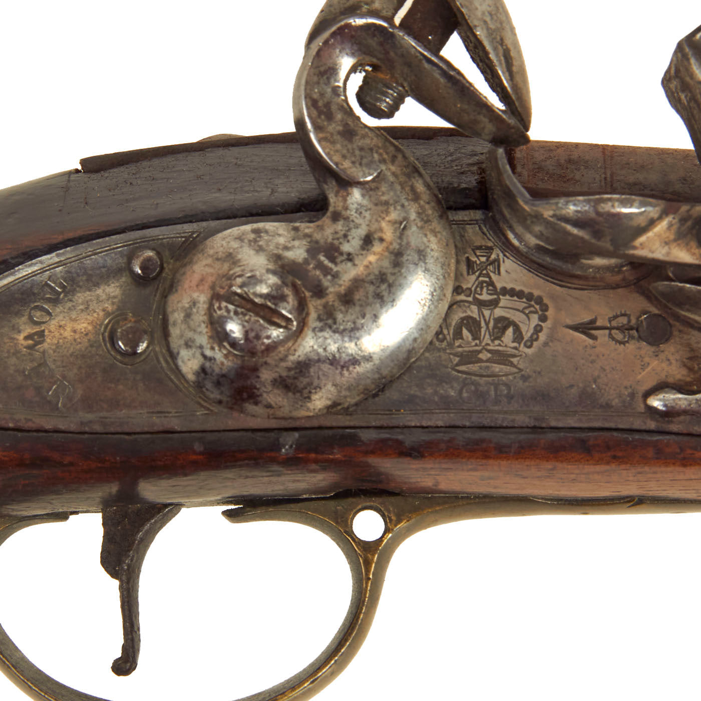 The lock plate is full marked with CROWN / G.R. mid lock for King George III, with TOWER across the tail. Under the flash pan is the correct CROWN / BROAD ARROW "Lock Viewer's Mark". The lock has a swan neck cock, indicating pre-1808 construction, so this is a rifle that was in service during the Napoleonic wars. It has all regulation brass furniture, together with correct issue iron ramrod. Shows use but remains in amazingly tight and clean condition. Action is strong and holds at half cock, firing correctly at full cock. The lock is quite clean and in great shape. The barrel has some powder burns on the right side by the lock, but is otherwise very nice.